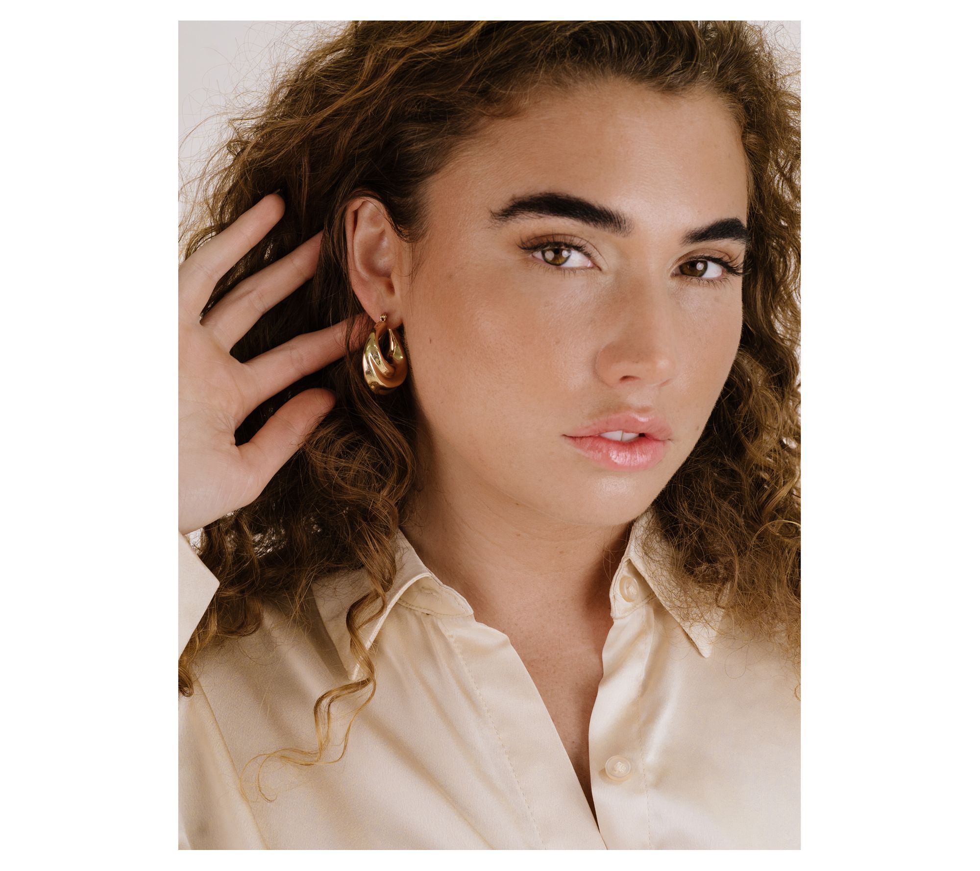 These fun goldtone brass hoops feature a swirled crescent design that's fab for dressing up any outfit. From Ettika.