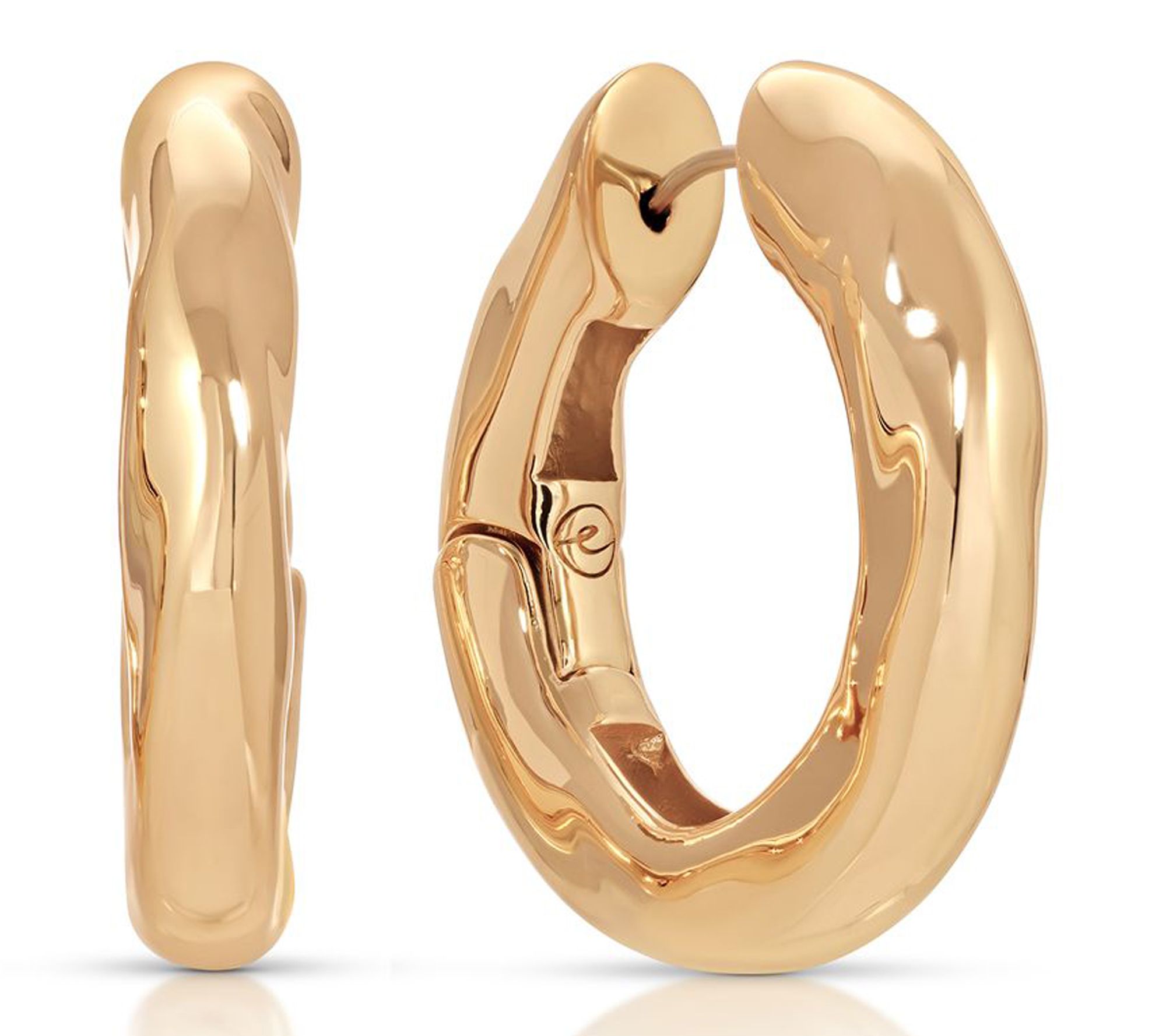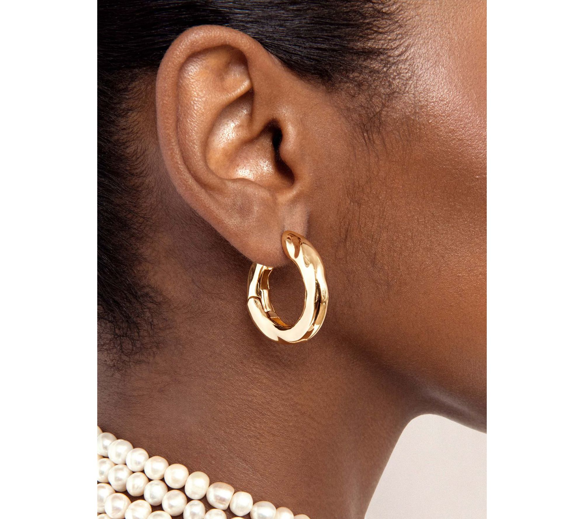 Add a bold touch to your look with these molten hoop earrings -- from daytime meetings to evening gatherings, their goldtone finish and sculpted curves catch the light with every move. The hinge snap bar closure offers security, making them a chic and comfortable pick for any occasion. From Ettika.