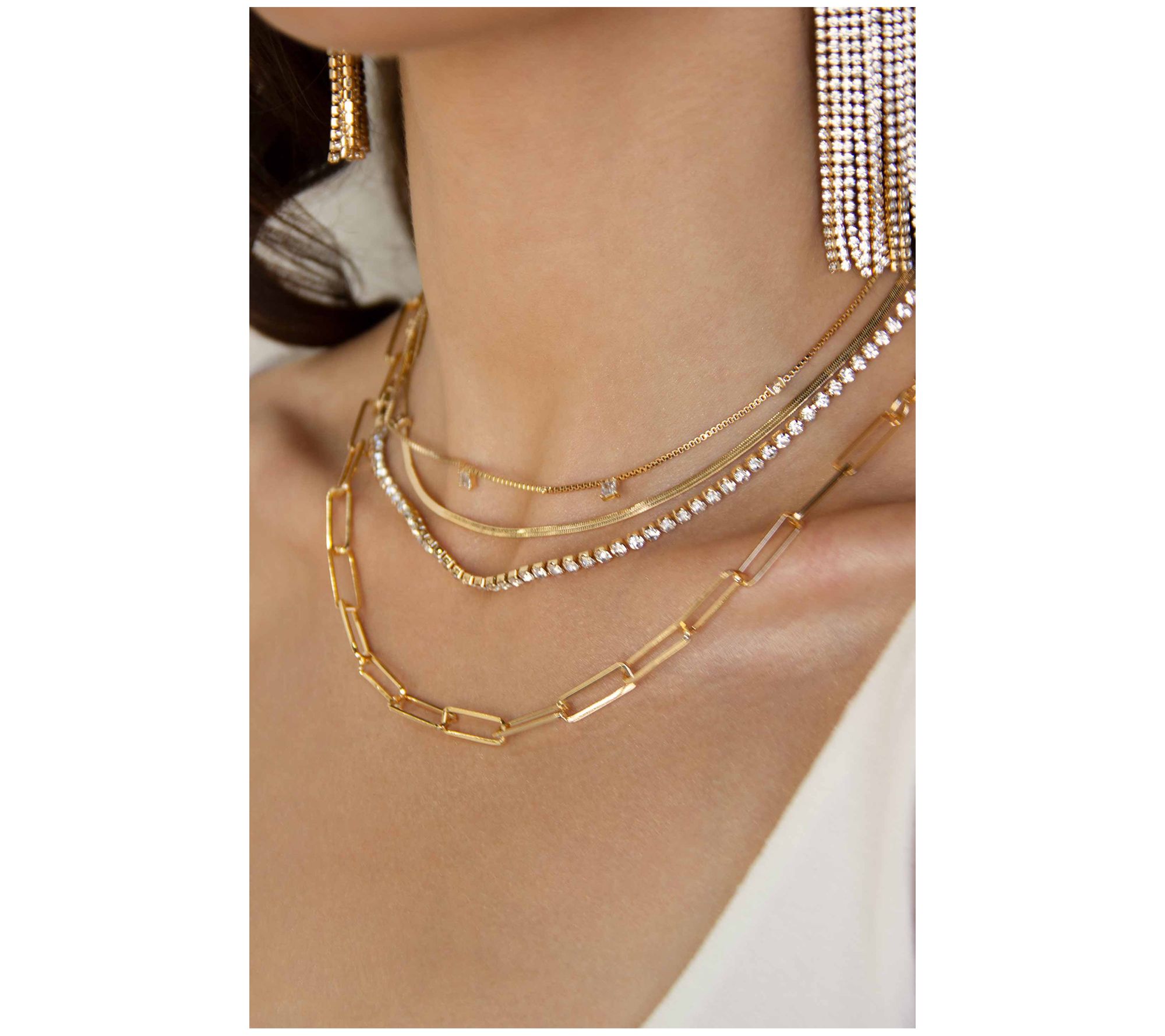 • Includes paperclip link chain and layered multi-strand necklace