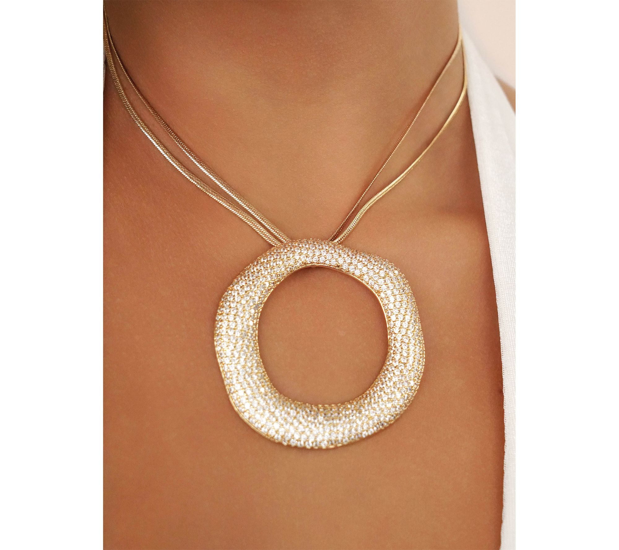• Open circle pendant with round, pave-set cubic zirconia; double snake chain