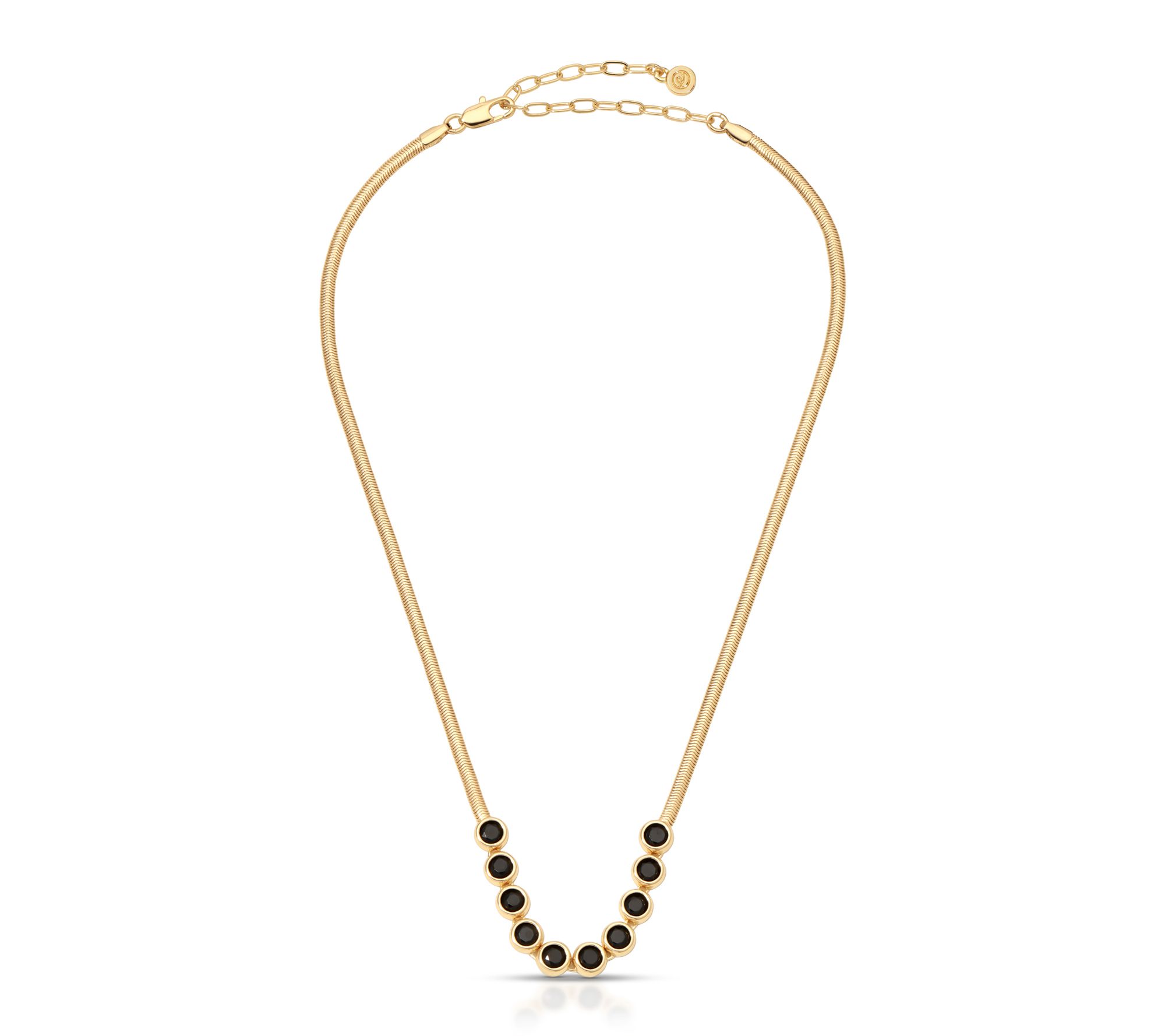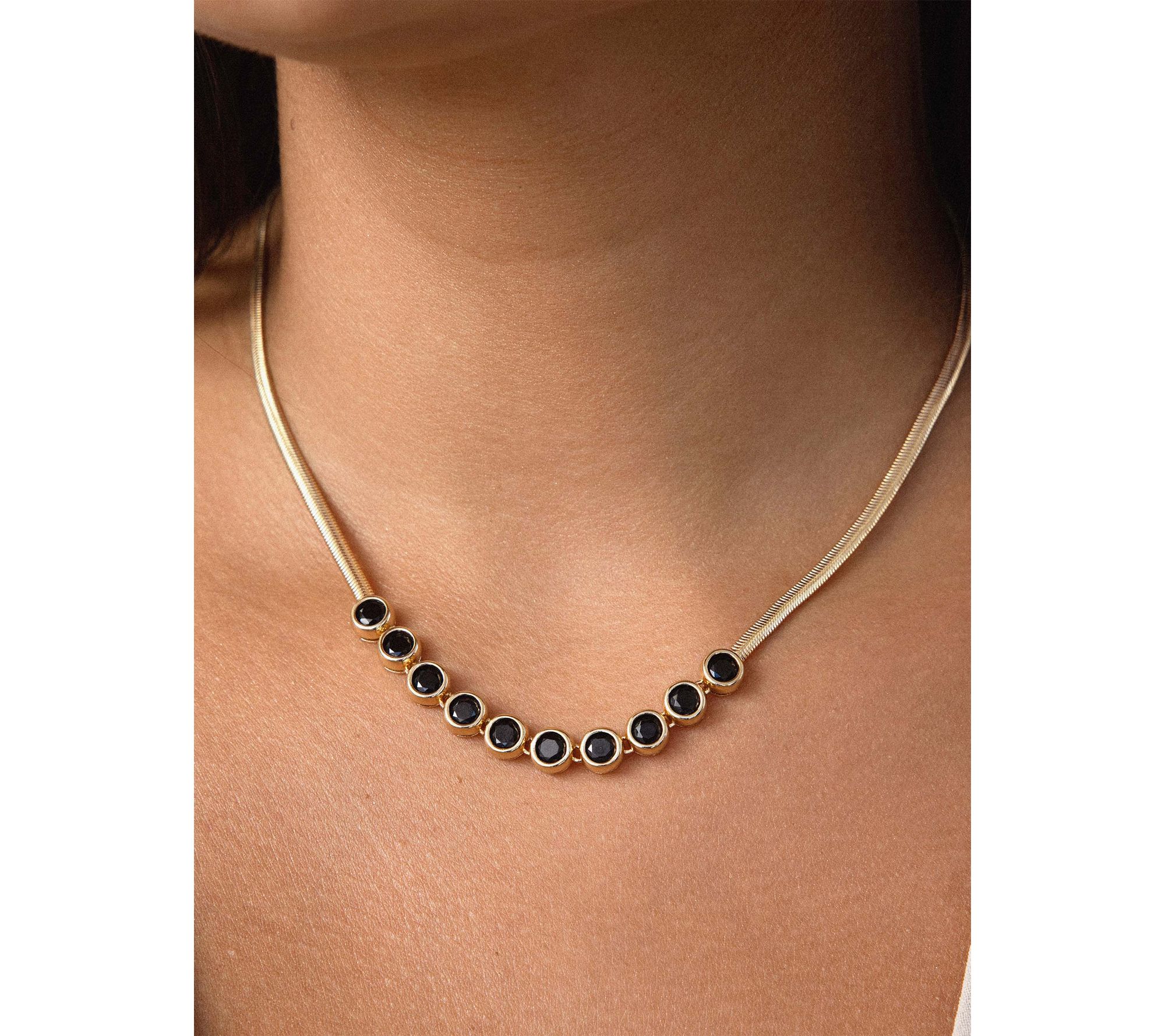 Add a touch of edgy sophistication to any outfit with this choker necklace featuring a sleek herringbone chain and striking round black cubic zirconia accents. Whether paired with your favorite little black dress or layered for a bold street-style look, its goldtone finish and dramatic sparkle make it a standout accessory for day or evening. From Ettika.