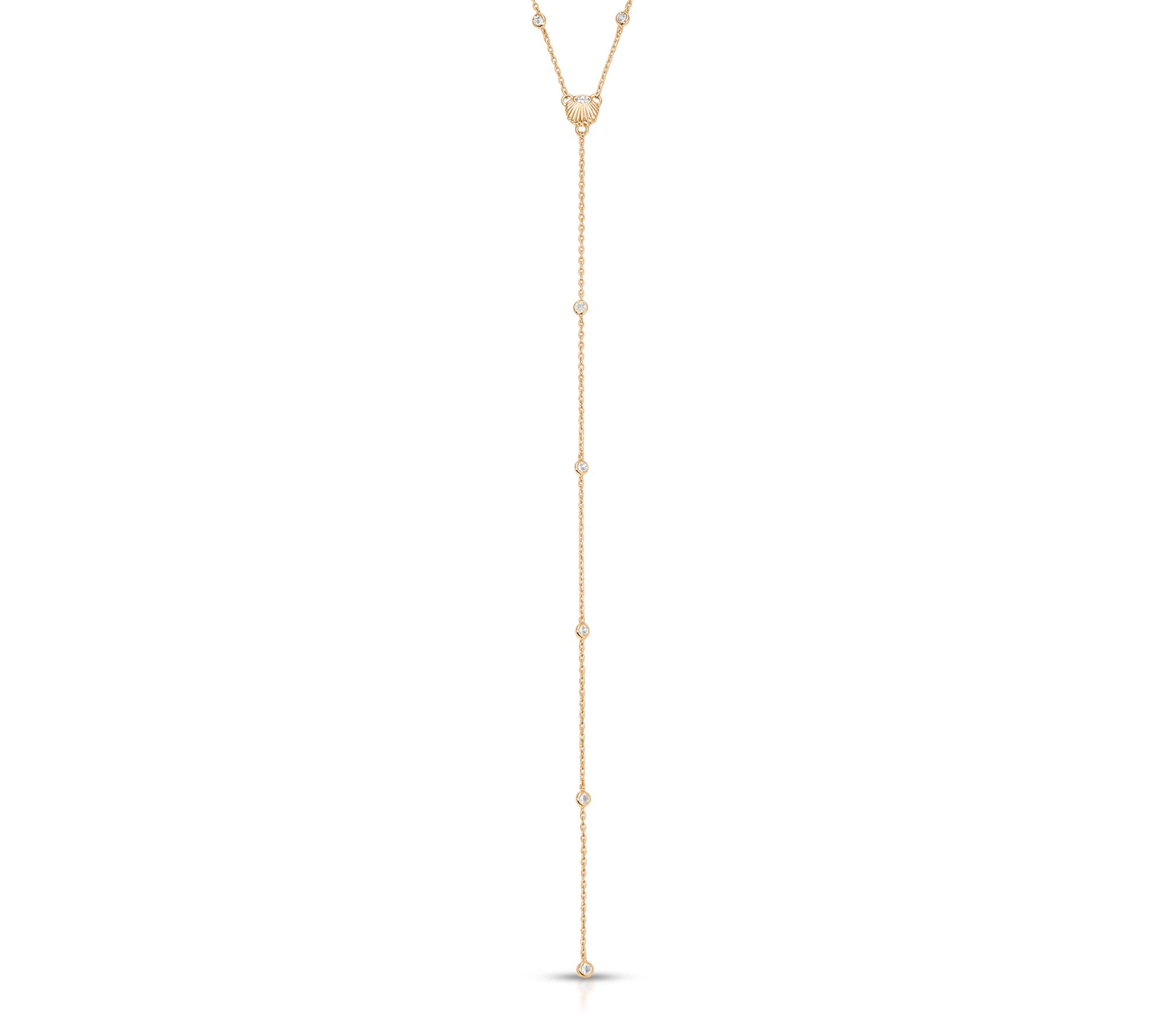 Let coastal inspiration elevate your everyday style with this shell lariat necklace, sparkling with cubic zirconia accents. Its goldtone finish and playful drop make it an ideal piece for layering or adding shimmer to a breezy sundress, whether you're at brunch or strolling along a boardwalk. From Ettika.