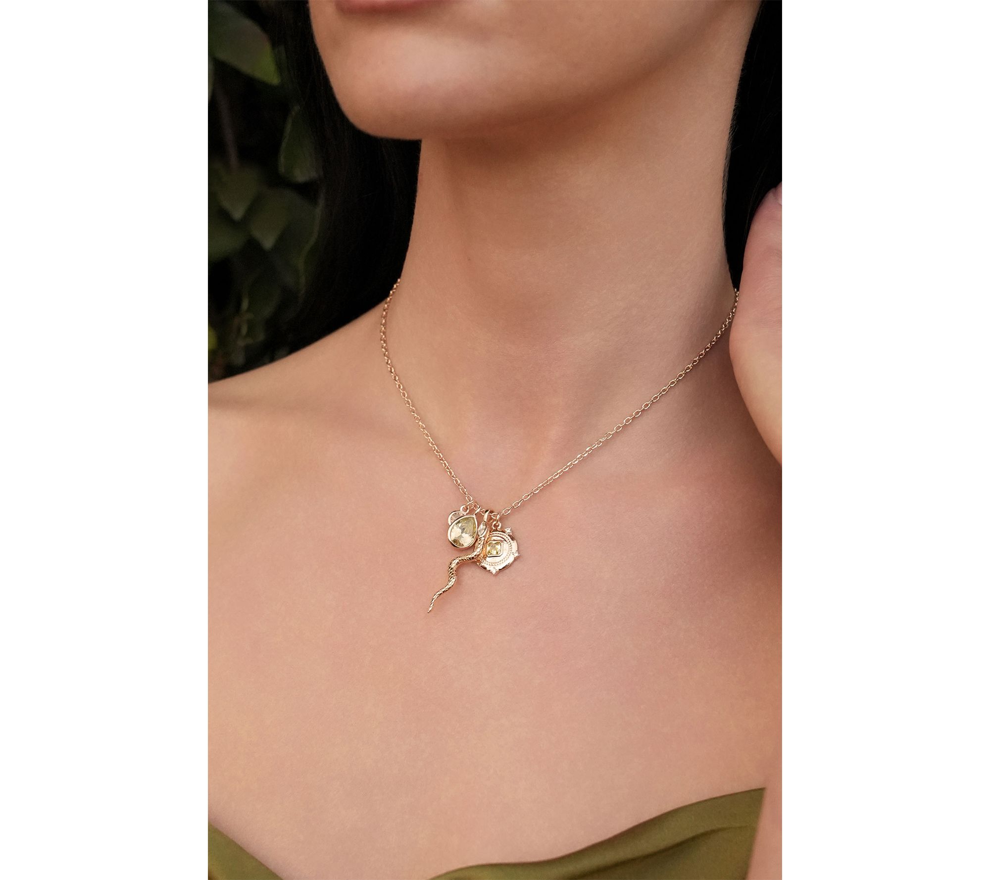 Add a playful twist to any look with this shimmering necklace -- a bold combination of snake and coin charms adorned with sparkling white and green cubic zirconia. Effortlessly eye-catching, this charm necklace brings a chic edge whether you're heading out for brunch or glamorizing your evening ensemble. From Ettika.