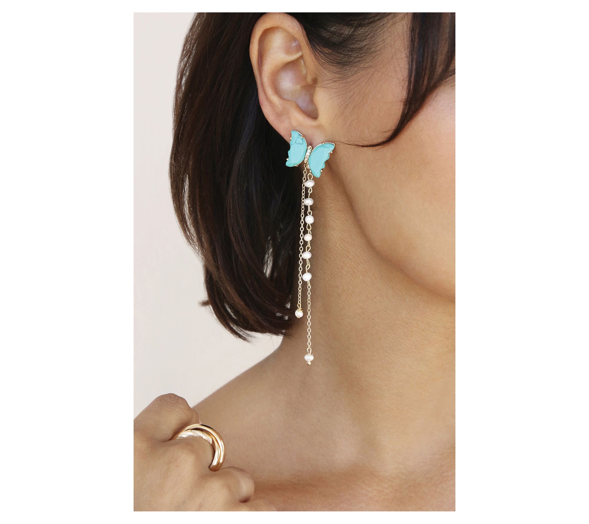 Adorn your ears with these enchanting butterfly pearl chain earrings. Perfect for adding a touch of whimsy and elegance to any outfit, these earrings feature delicate reconstituted turquoise butterflies and cultured freshwater pearls that dangle beautifully with every movement. From Ettika.