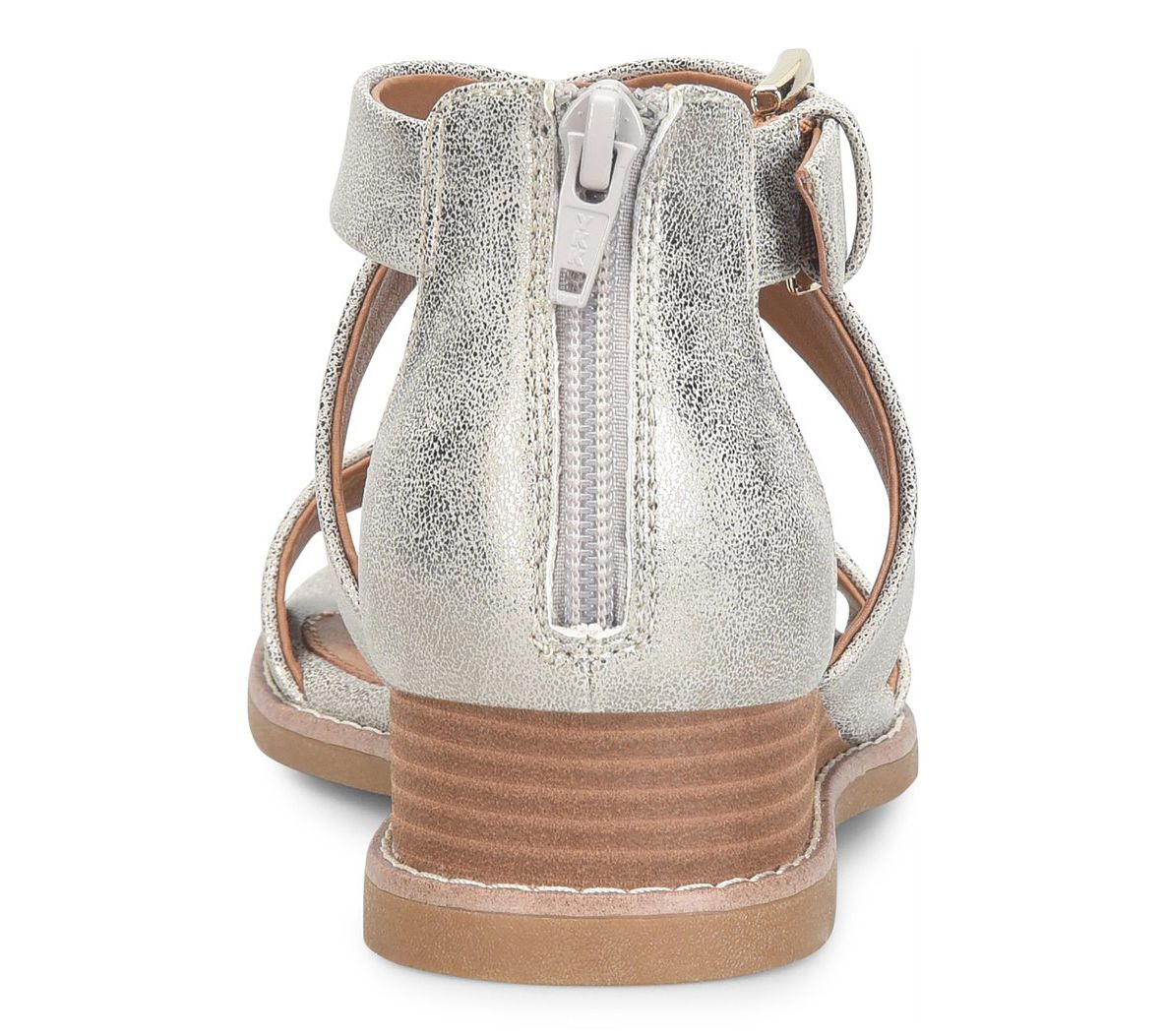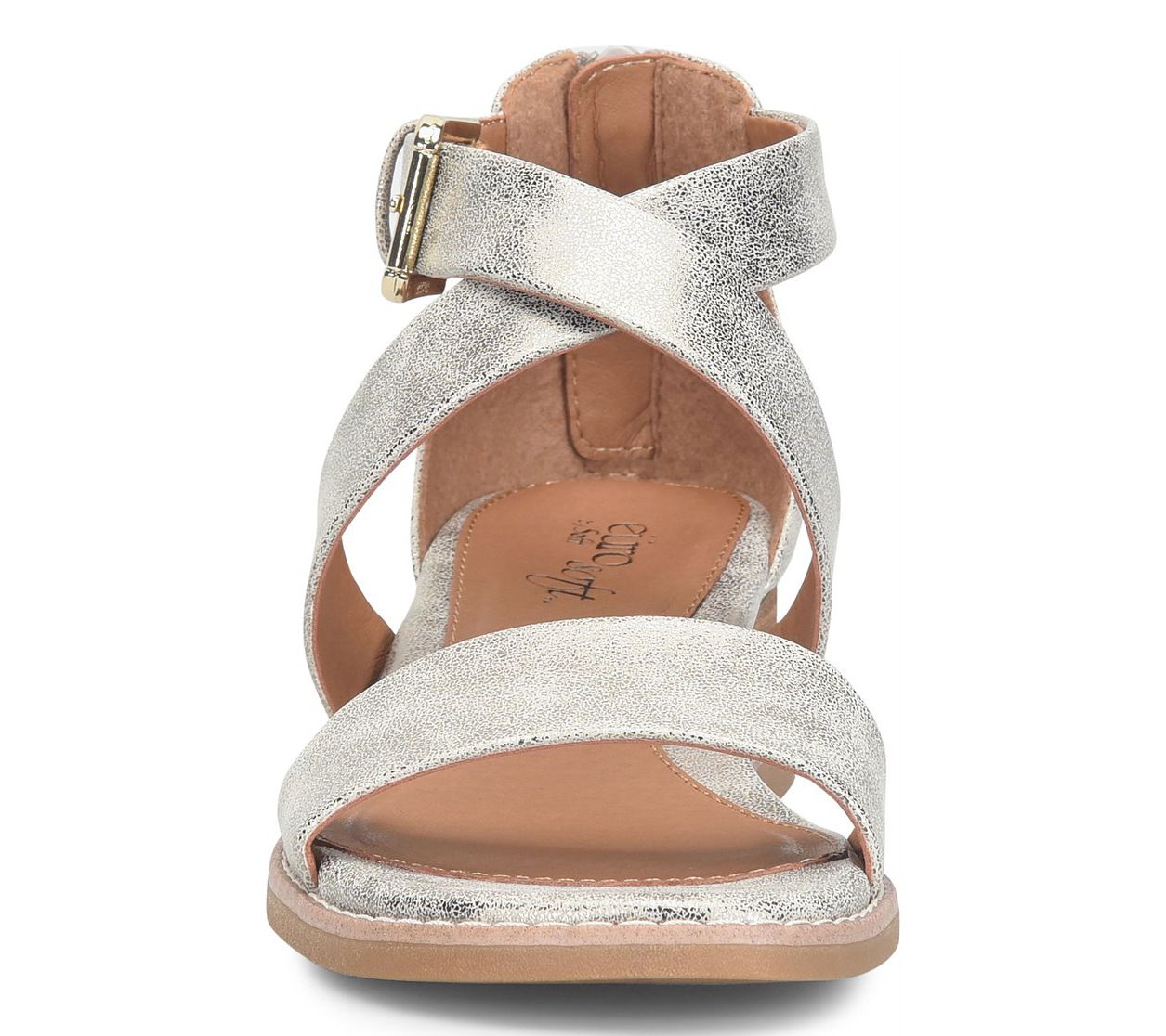 • Crisscross upper, adjustable buckle, rounded toe