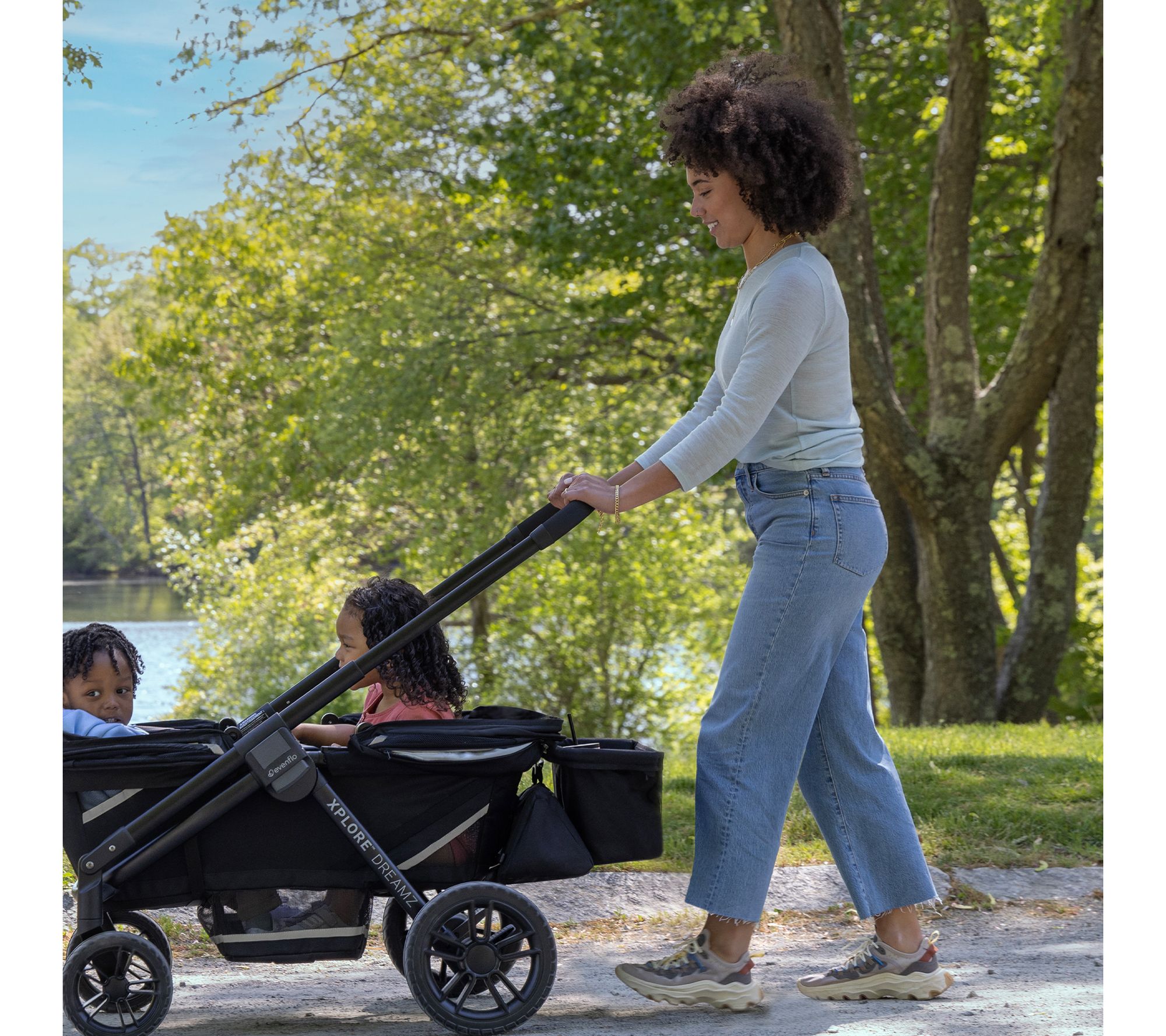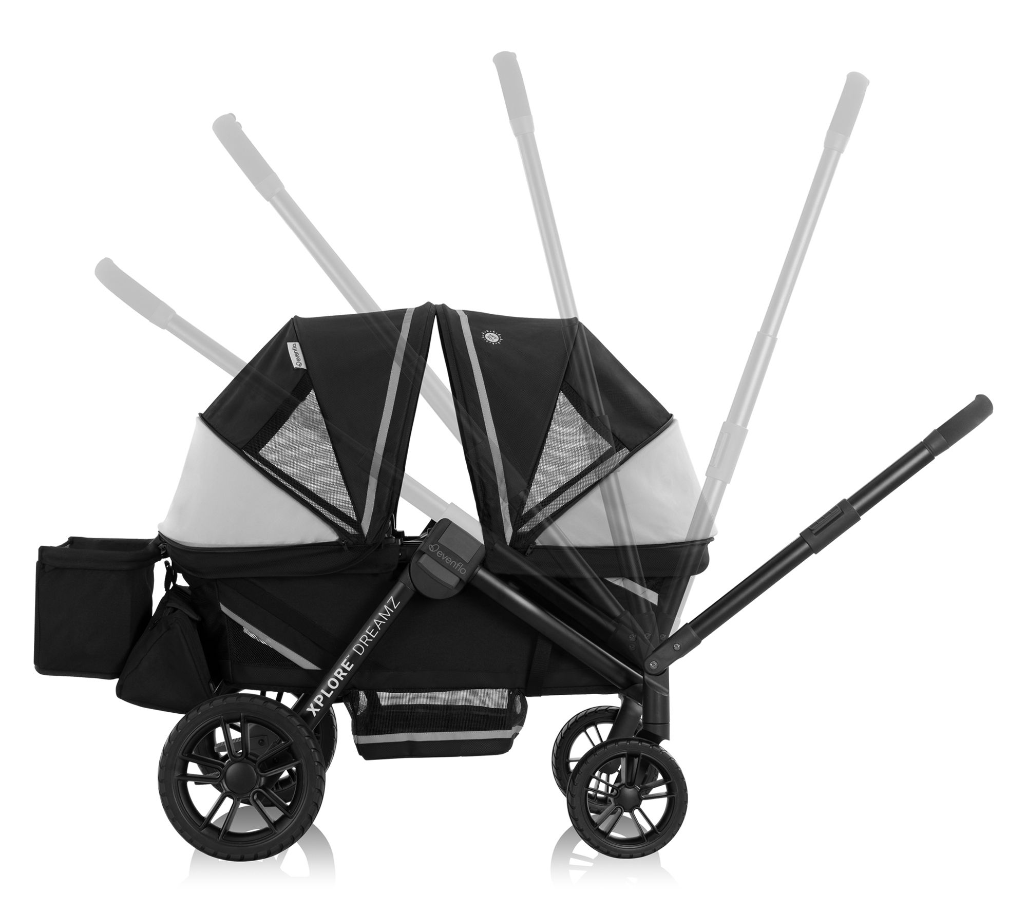 Heading out for a family adventure? The versatile Pivot Xplore Dreamz stroller wagon is your ultimate travel companion. Carry up to two children and easily switch from stroller mode to wagon mode with a quick flip of the handle, making it perfect for on-the-go naps with the included bassinet insert. Block the sun with its expandable canopies, while the all-terrain wheels promise smooth rides from city streets to sandy beaches. With added storage options and thoughtful design elements, it's built for comfort and convenience. From Evenflo.