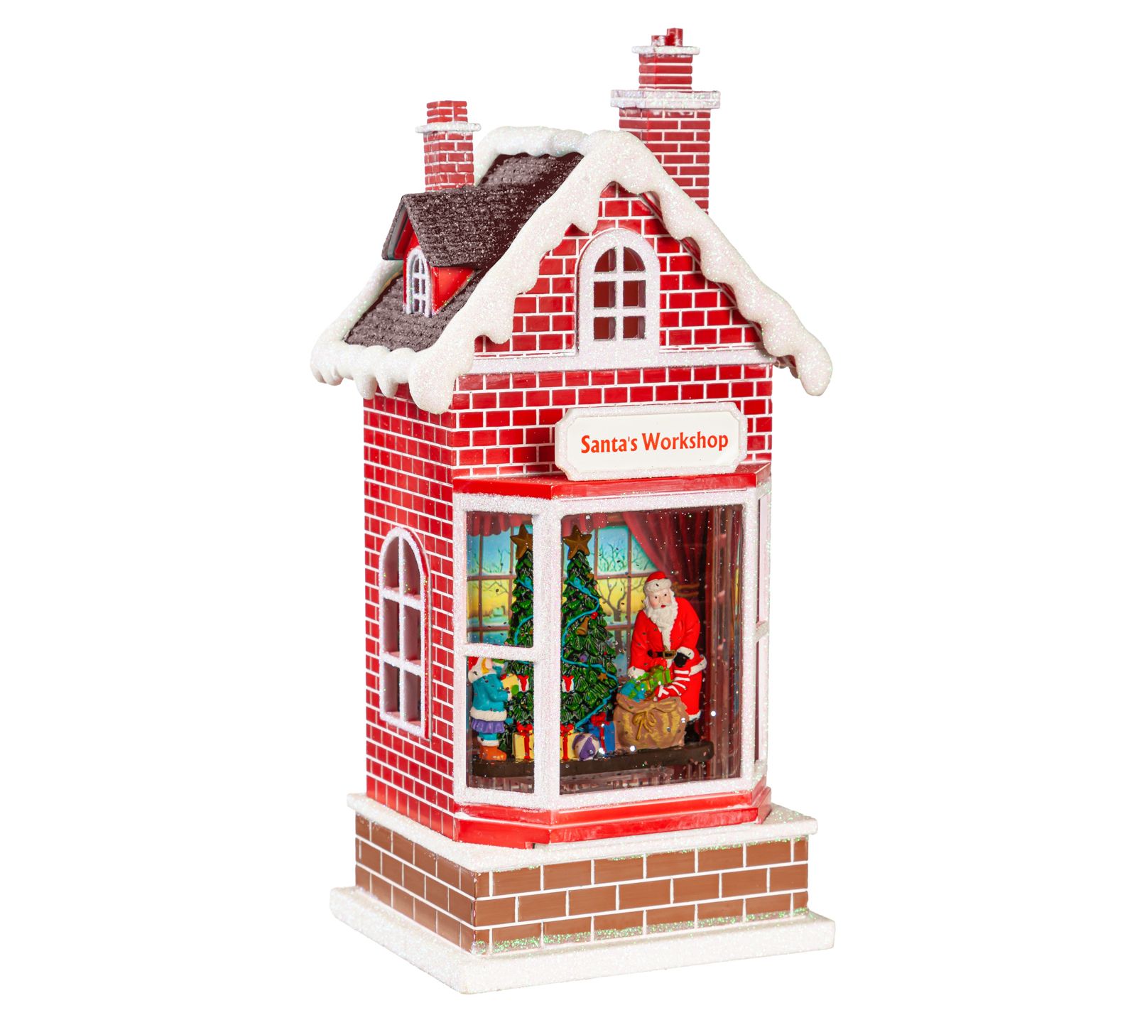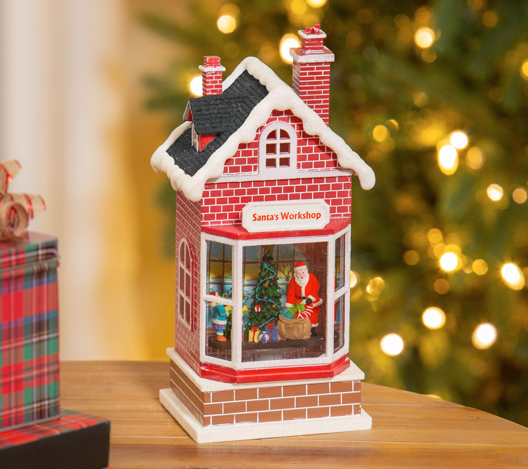 Bring a festive touch to your tabletop with this illuminated Santa's workshop that glows with soft light for a welcoming effect. From Evergreen Enterprises.