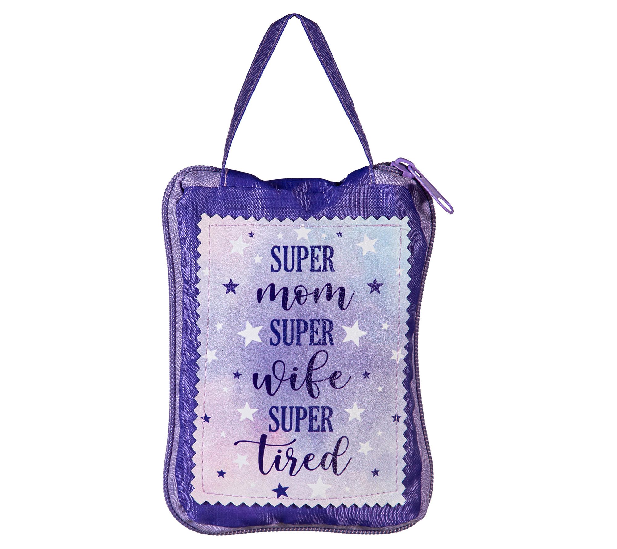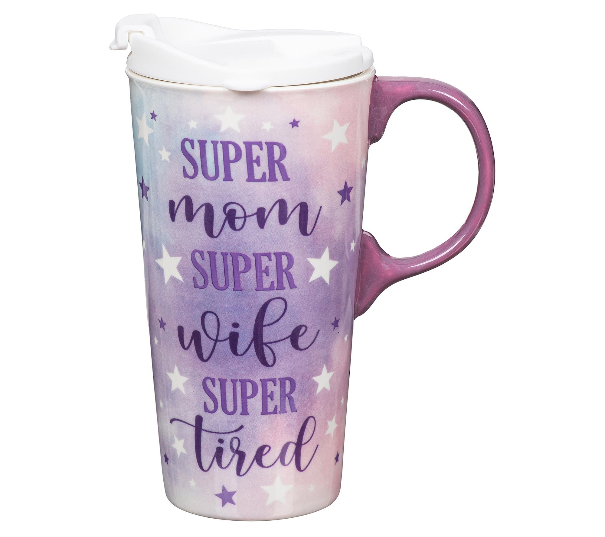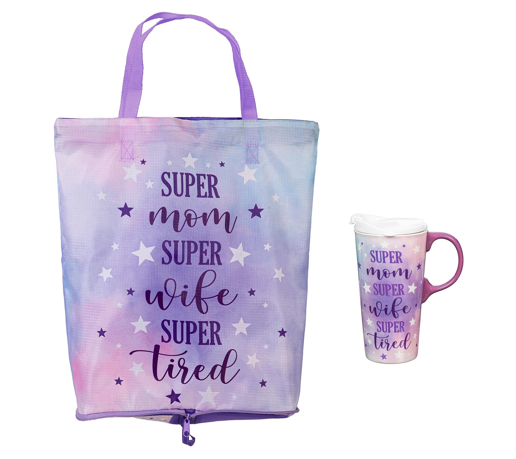 You're always juggling multiple roles, and this set understands. The chic ceramic travel mug with a playful 'Super Mom, Super Wife, Super Tired' design holds a generous 17 ounces of your favorite wake-me-up drink, neatly secured with its snug-fitting silicone lid. And when you're on-the-go, the coordinating fabric tote bag packs all your essentials stylishly. From Evergreen.