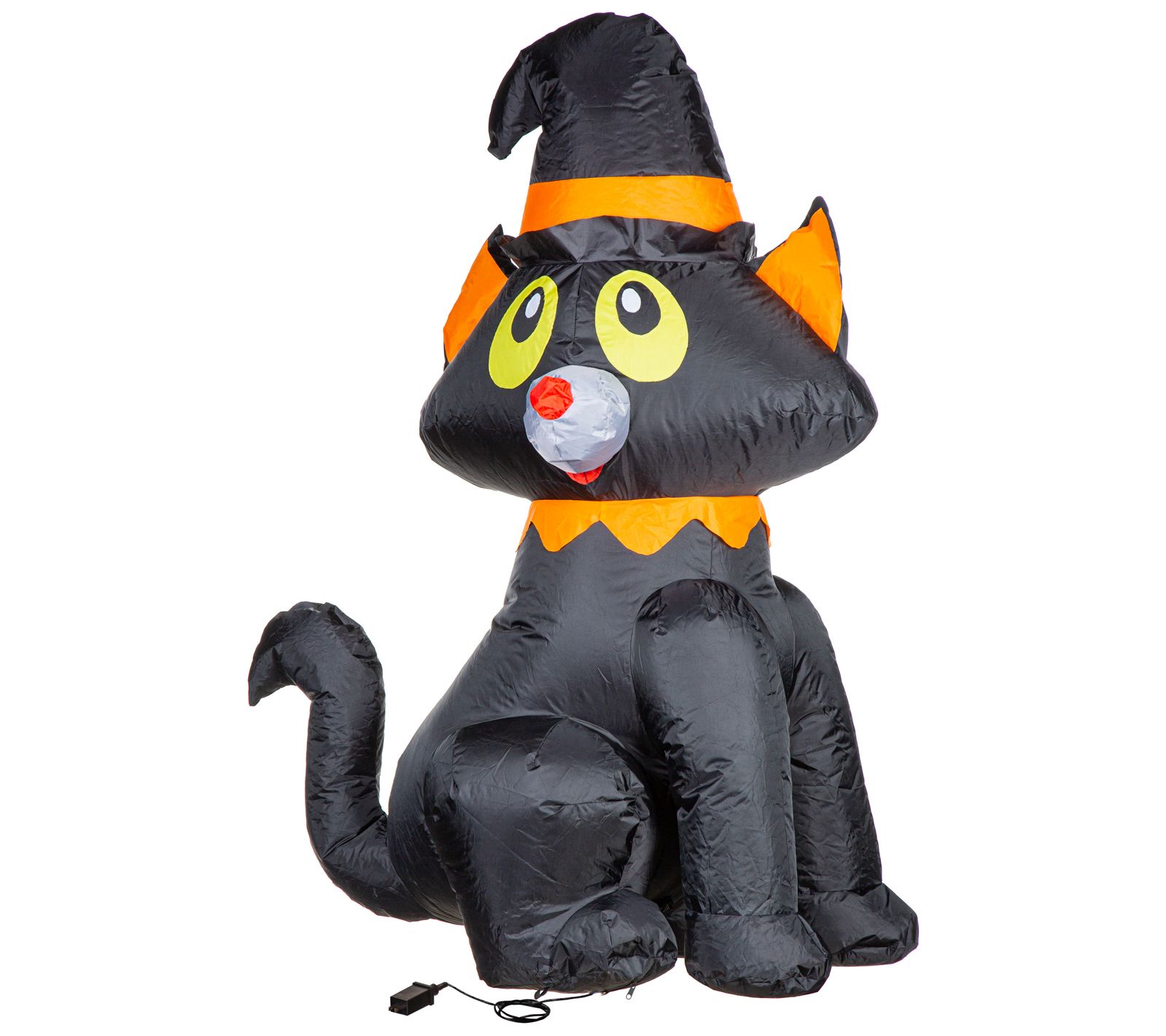 Dressed in a witch's hat and ready for Halloween, this mischievous black cat inflatable is a fun way to greet guests and light the way for trick-or-treaters. From Evergreen Enterprises.