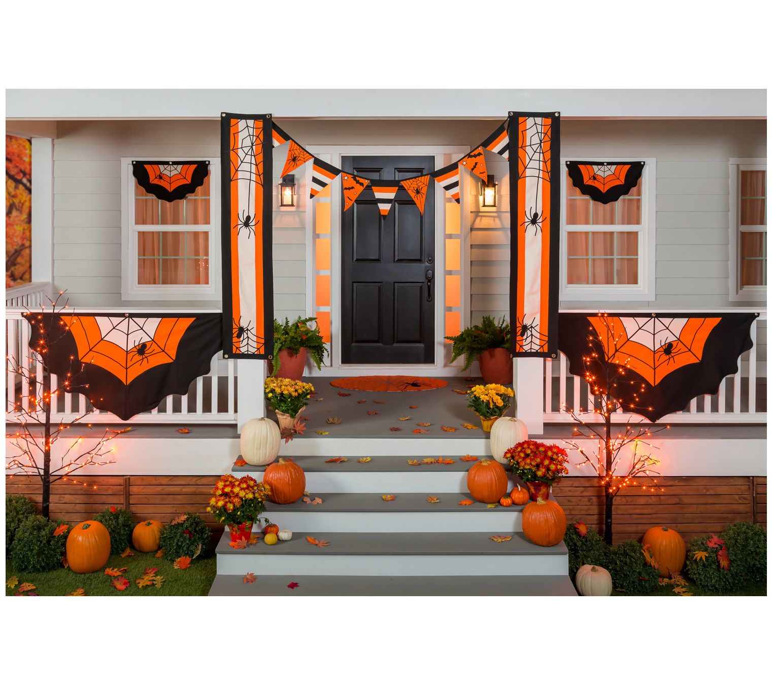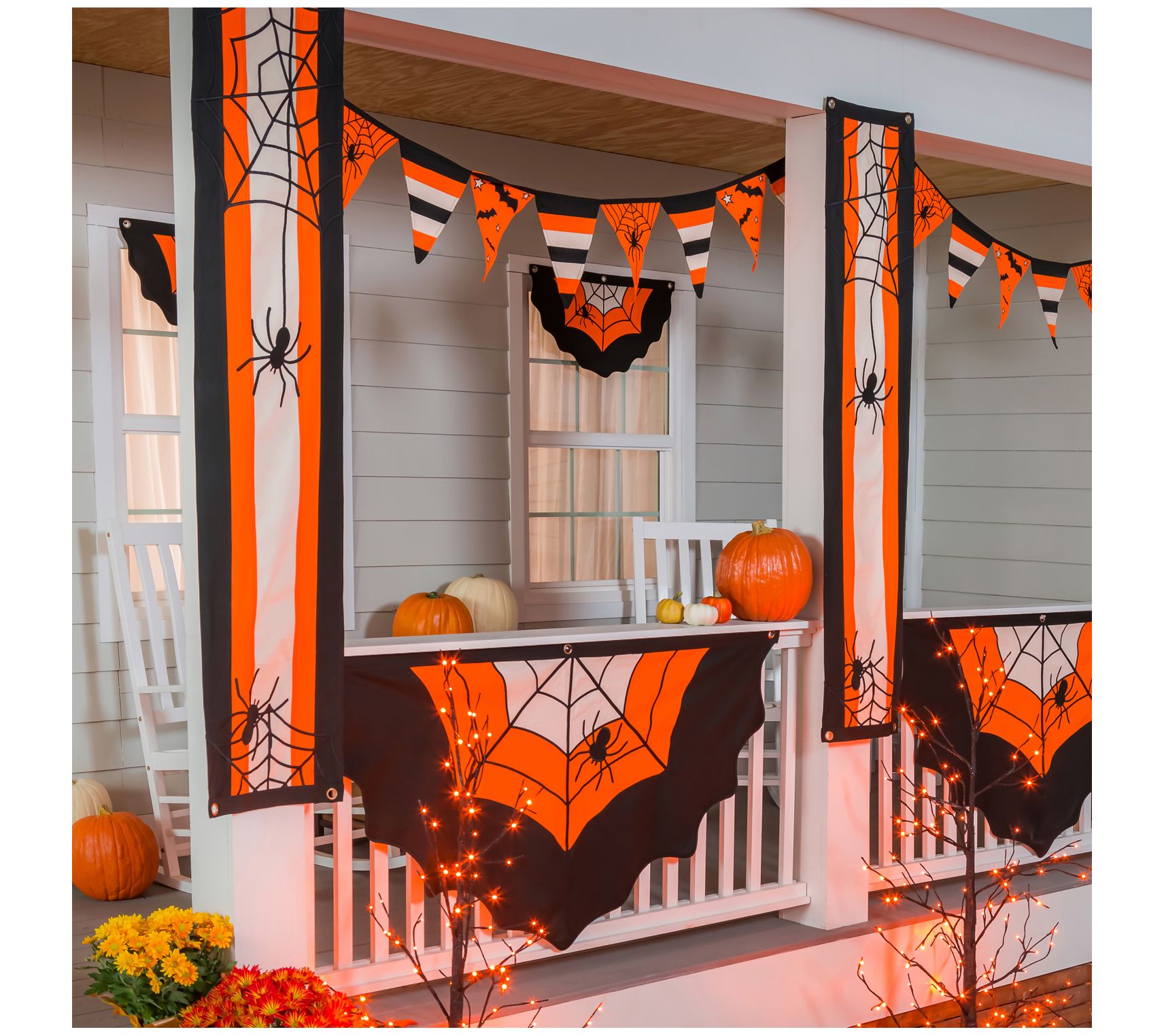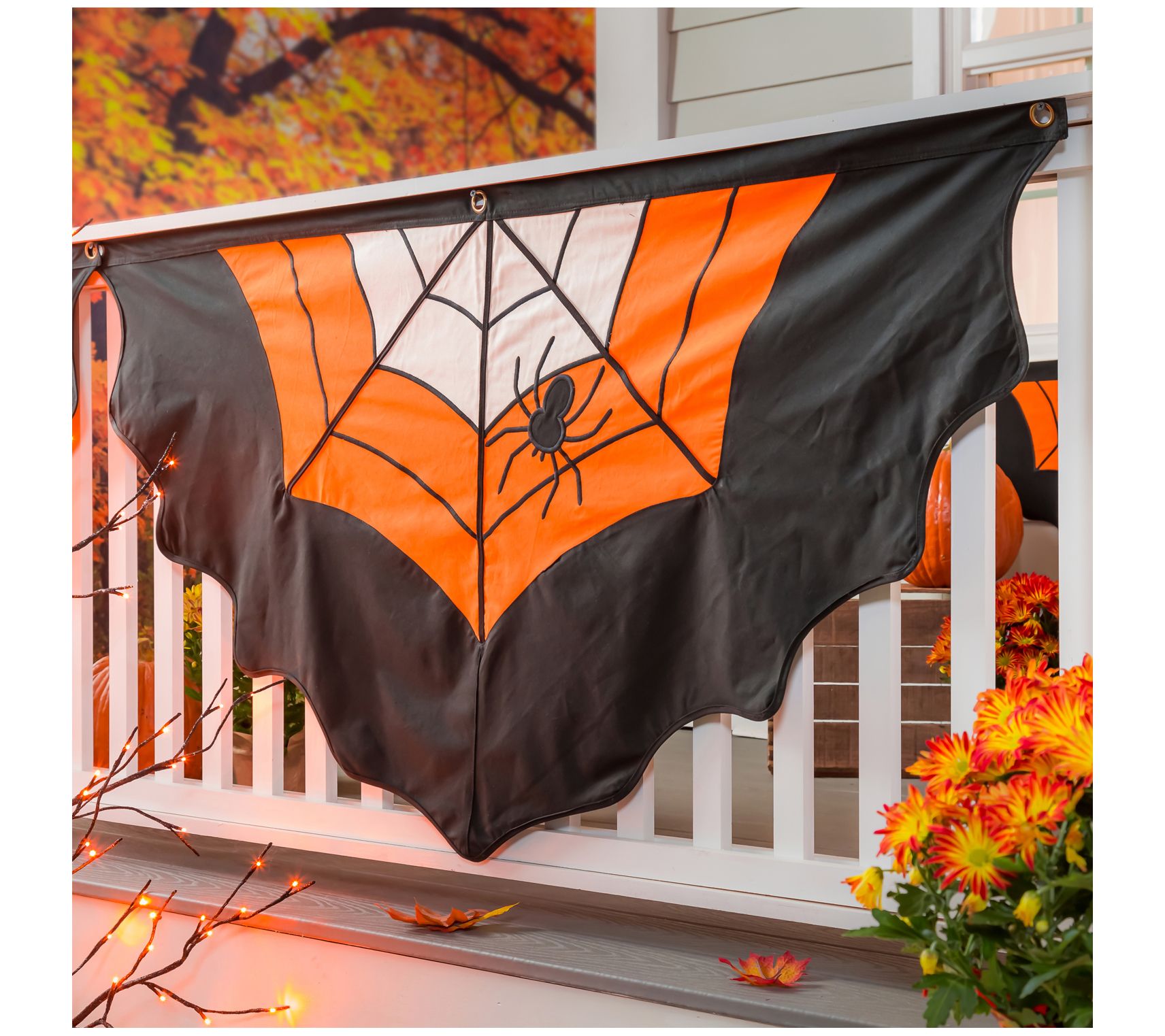 Add a touch of creepy fun to your home when you hang this cotton bunting that features scalloped edges, classic Halloween colors, and a big spider in her web. From Evergreen Enterprises.