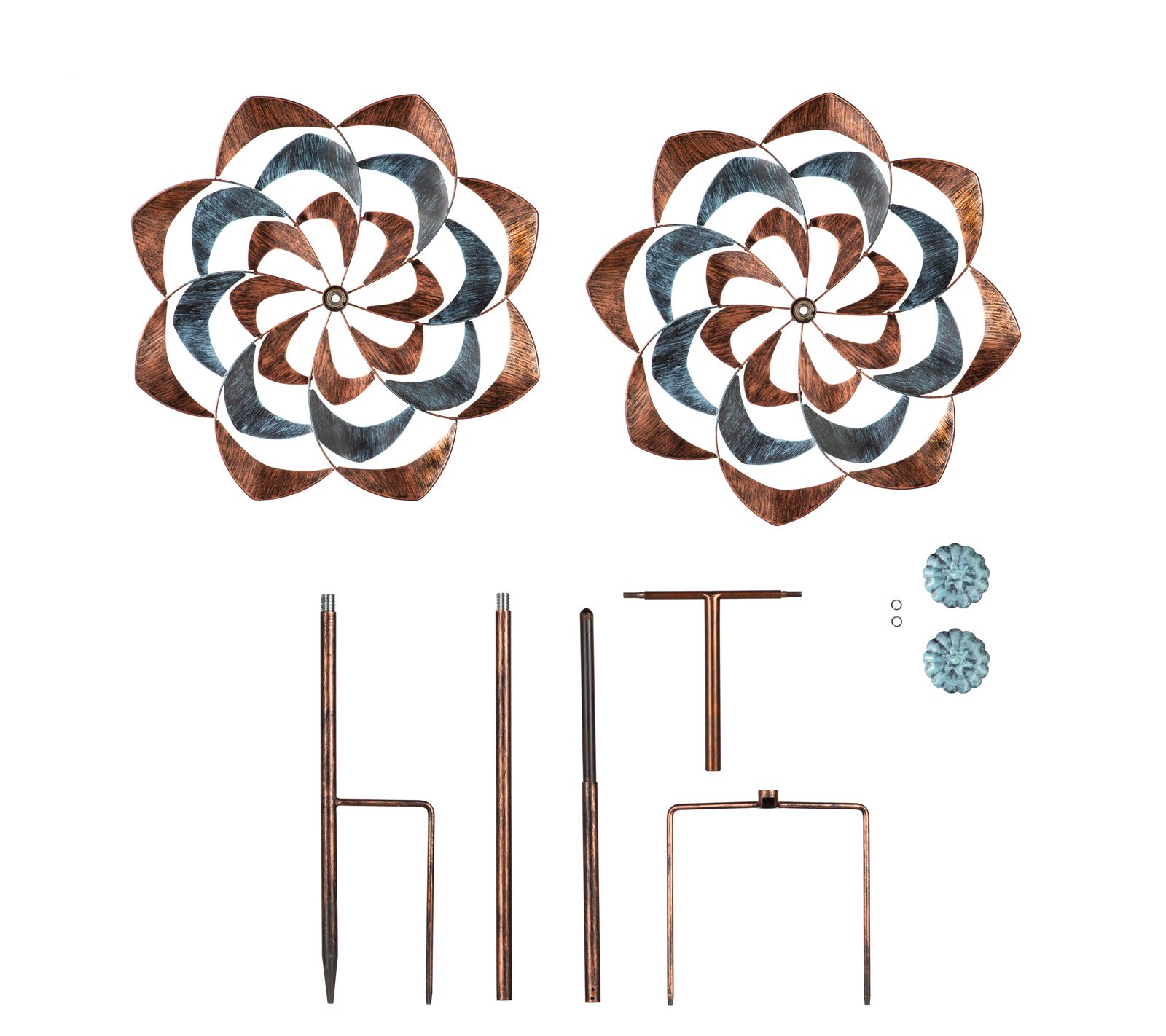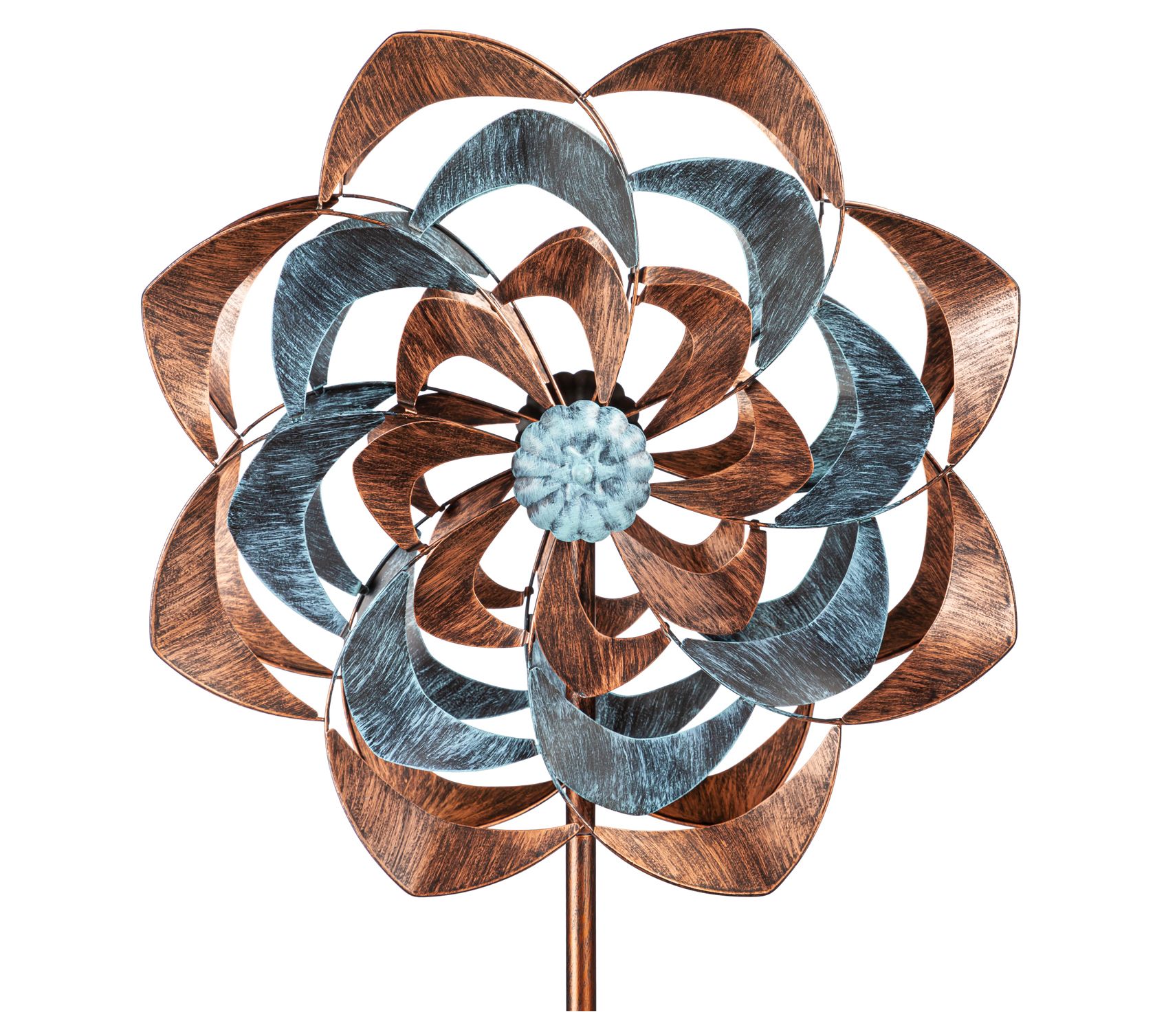 Add artisanal style and dimensional movement to any outdoor space with this wind spinner that features a striking blend of blue and coppery hues. From Evergreen Enterprises.