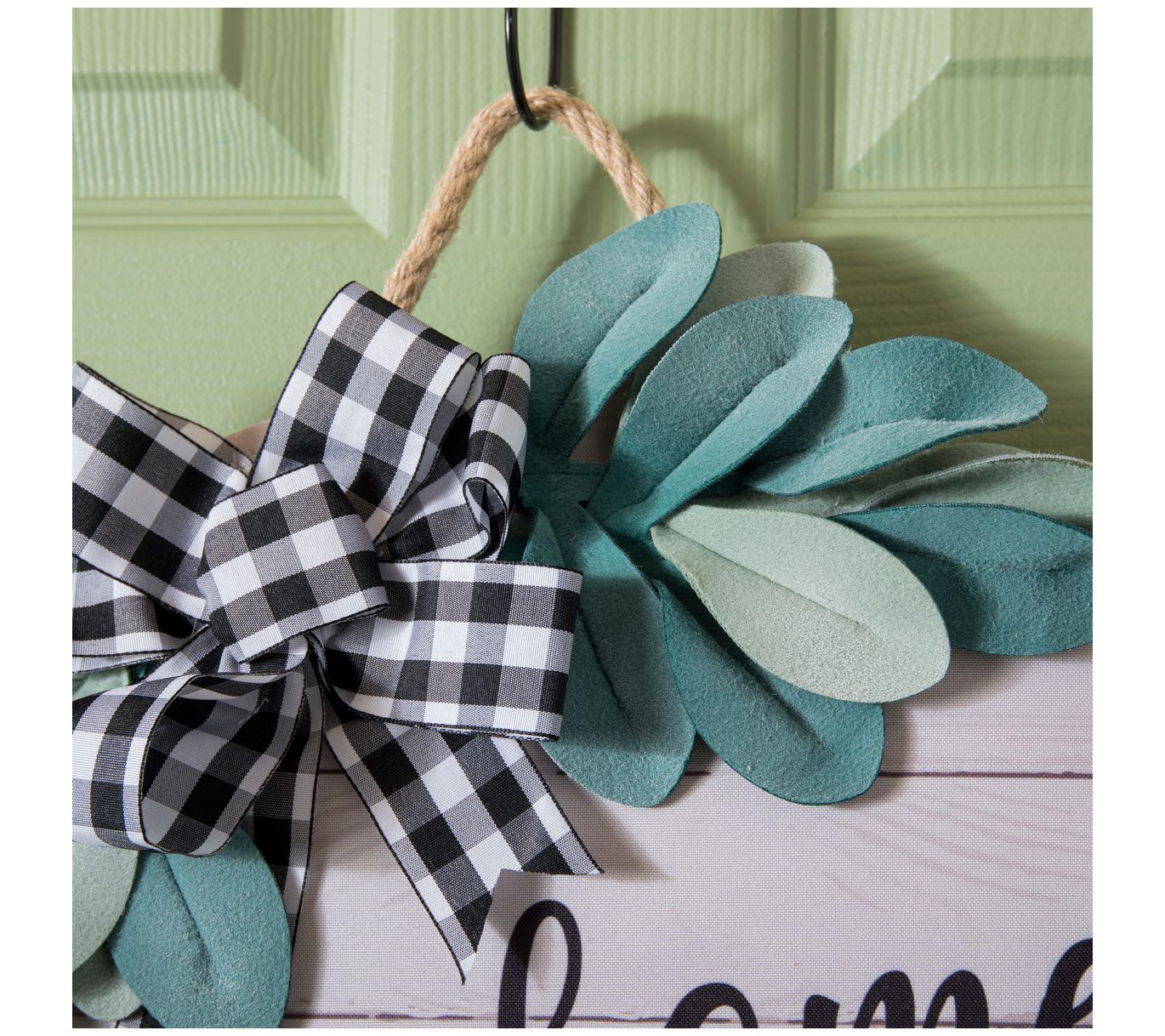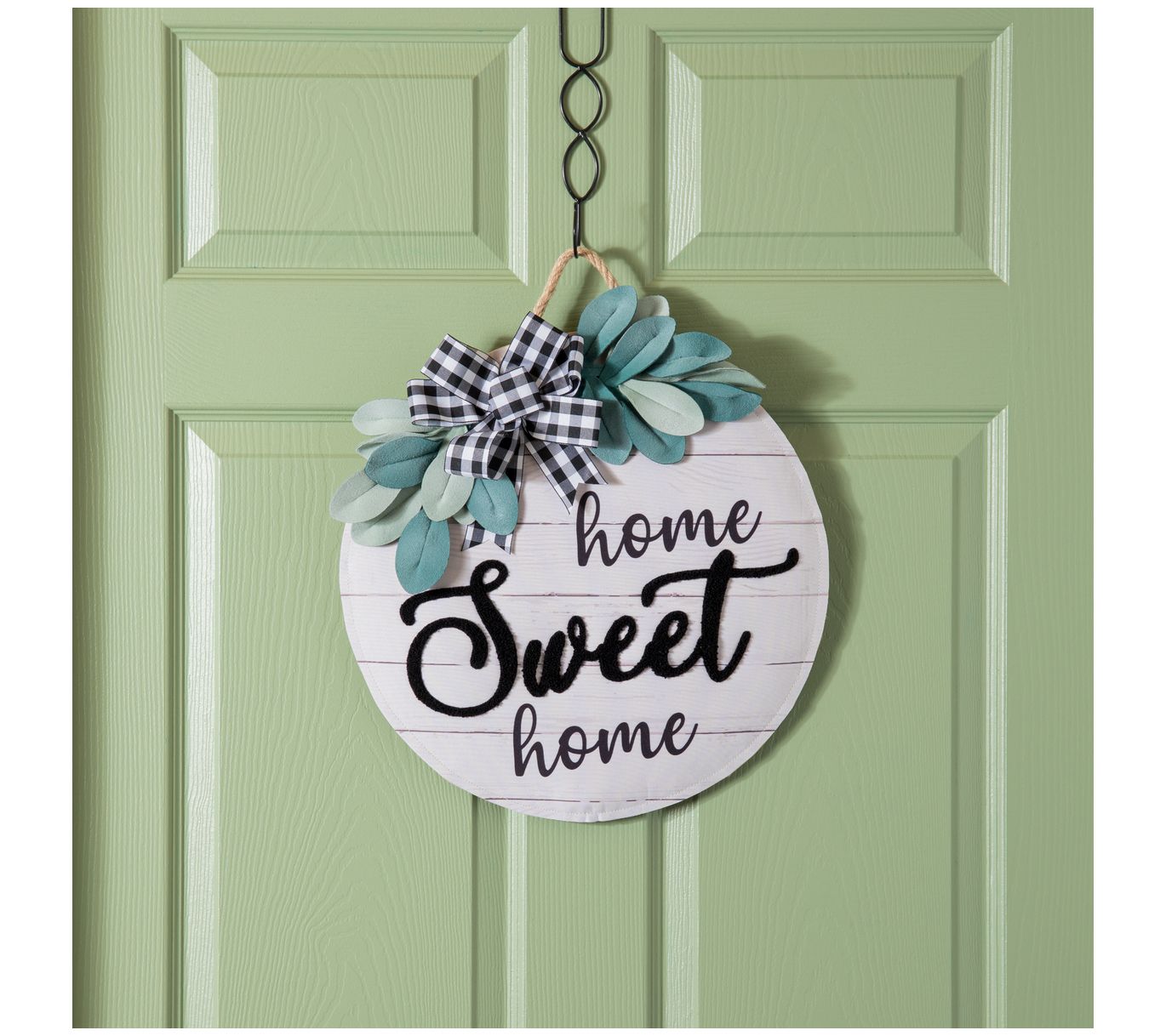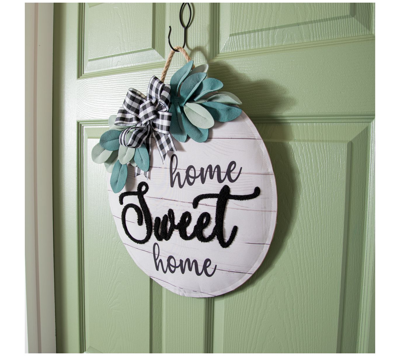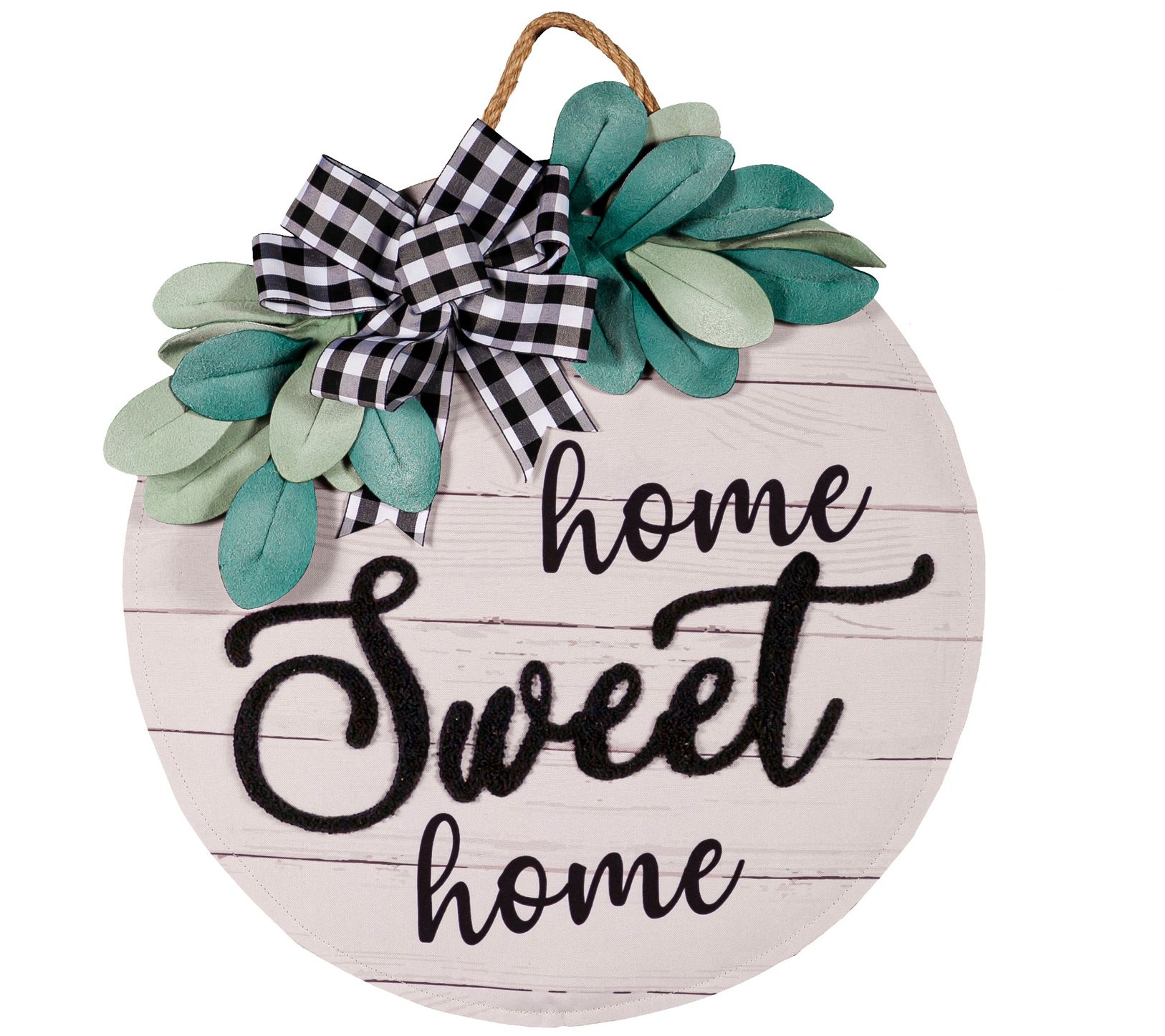 Welcome home! This Home Sweet Home door decor is topped with greenery accents and a plaid bow to give your entryway an instant refresh. From Evergreen Enterprises.