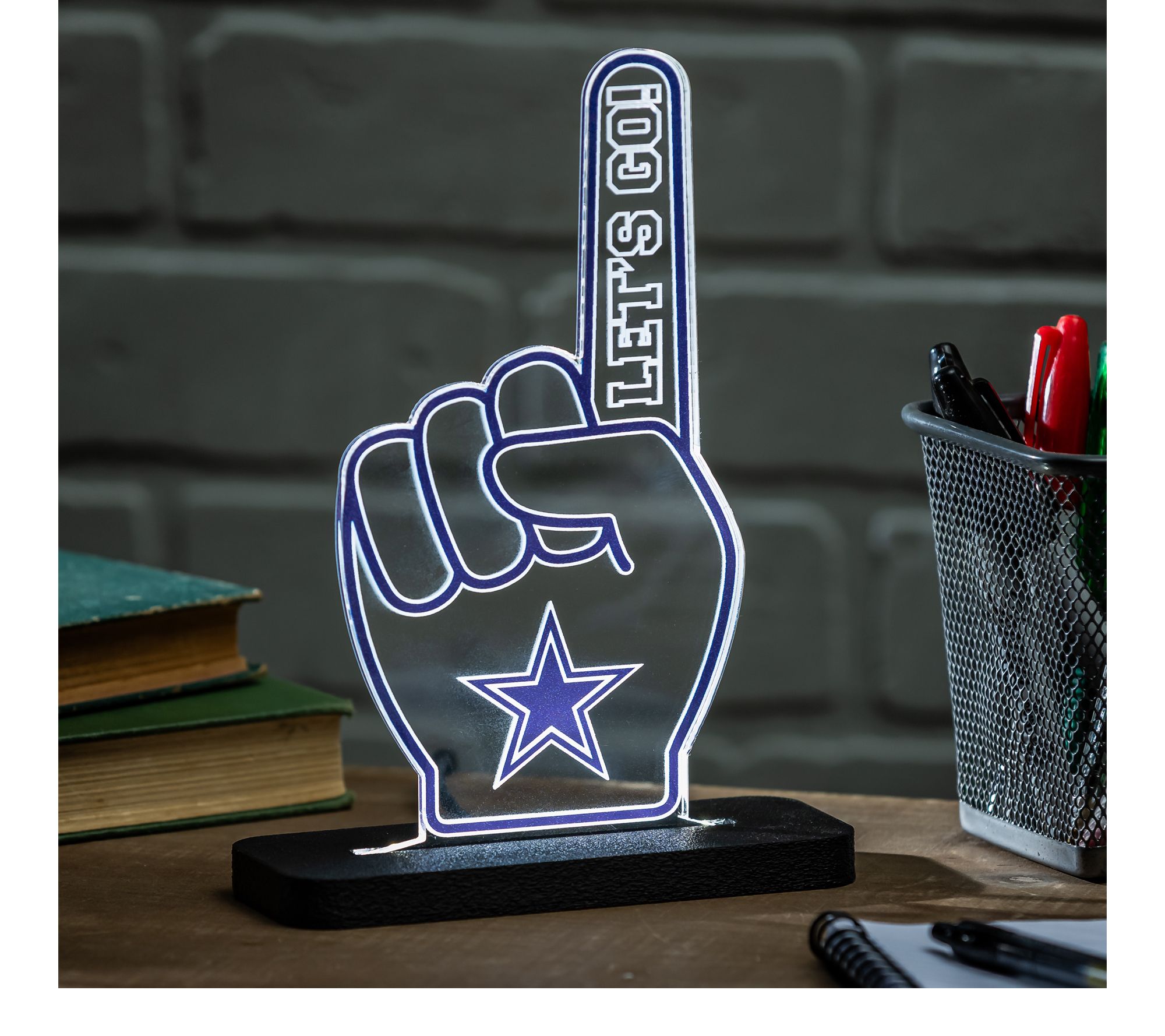 Show your team spirit in a bold new way with this LED foam finger table sign. Whether you're hosting game-day parties or adding a sporty touch to your home office, this lamp brings vibrant energy and your favorite NFL team's pride front and center. From Evergreen.