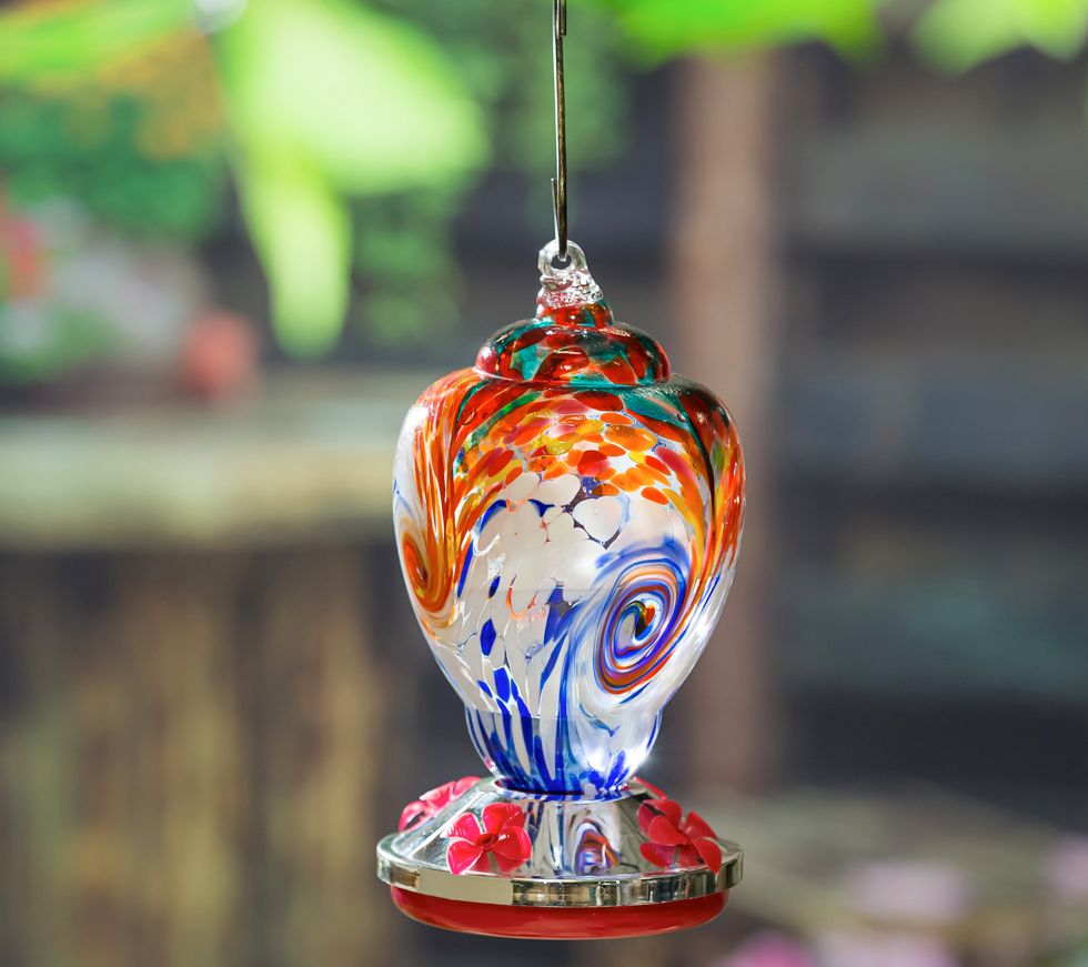 Showcasing a multicolored speckled wave design and loads of vibrant color, this glass hummingbird feeder is a fun way to liven up your garden while giving your feathered friends a beautiful place to dine. From Evergreen Enterprises.