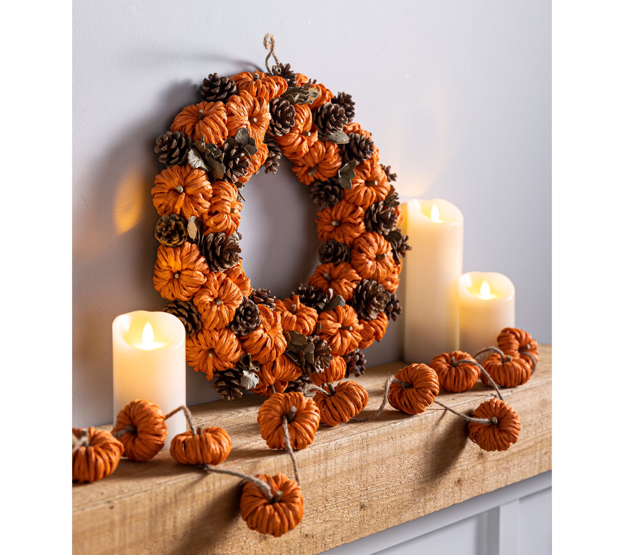 Give your fall decor a gourd-geous update with this lifelike pinecone and pumpkin wreath that welcomes your guests with warm autumnal charm. From Evergreen Enterprises.