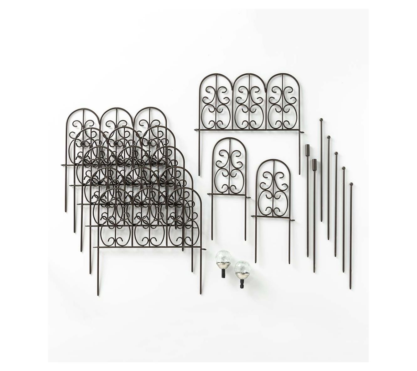 • Includes six large 18" sections of edging, two small 6" sections of edging, two crackle glass solar balls with 4 AAA Ni-MH rechargeable batteries, two globe stakes, and five fencing pins