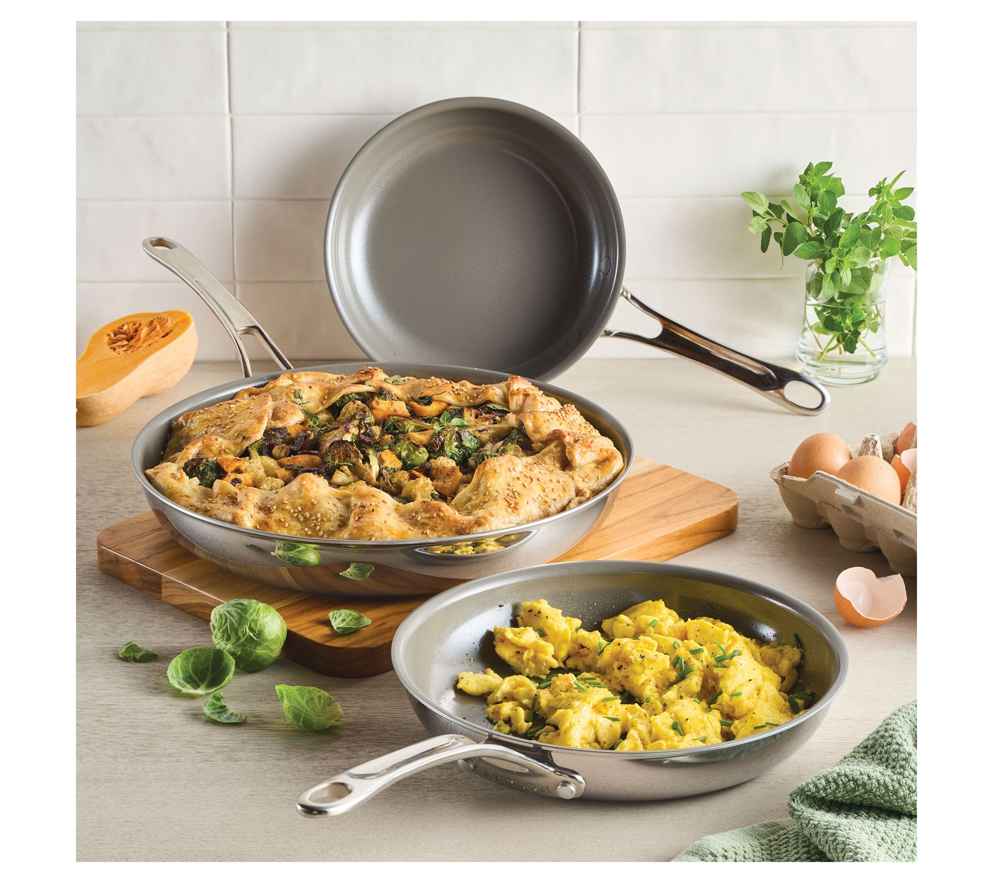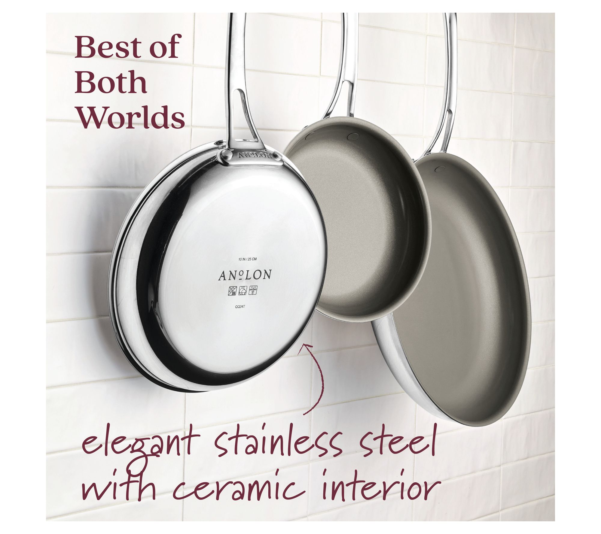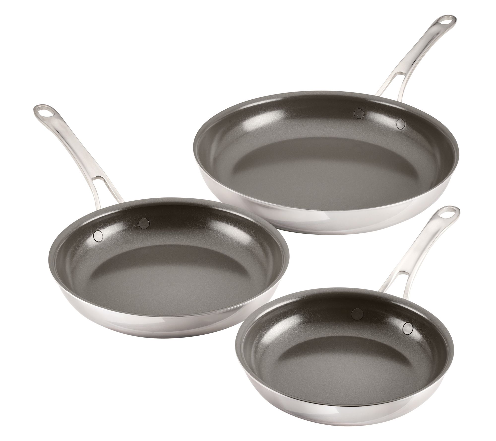 Experience a blend of sophistication and performance with the EverLast ceramic nonstick three-piece frying pan Set. Whether you're flipping pancakes or searing steaks, these pans provide even heating and effortless food release. Delight in the simplicity of ceramic nonstick combined with the reliability of clad stainless steel. From Anolon.
