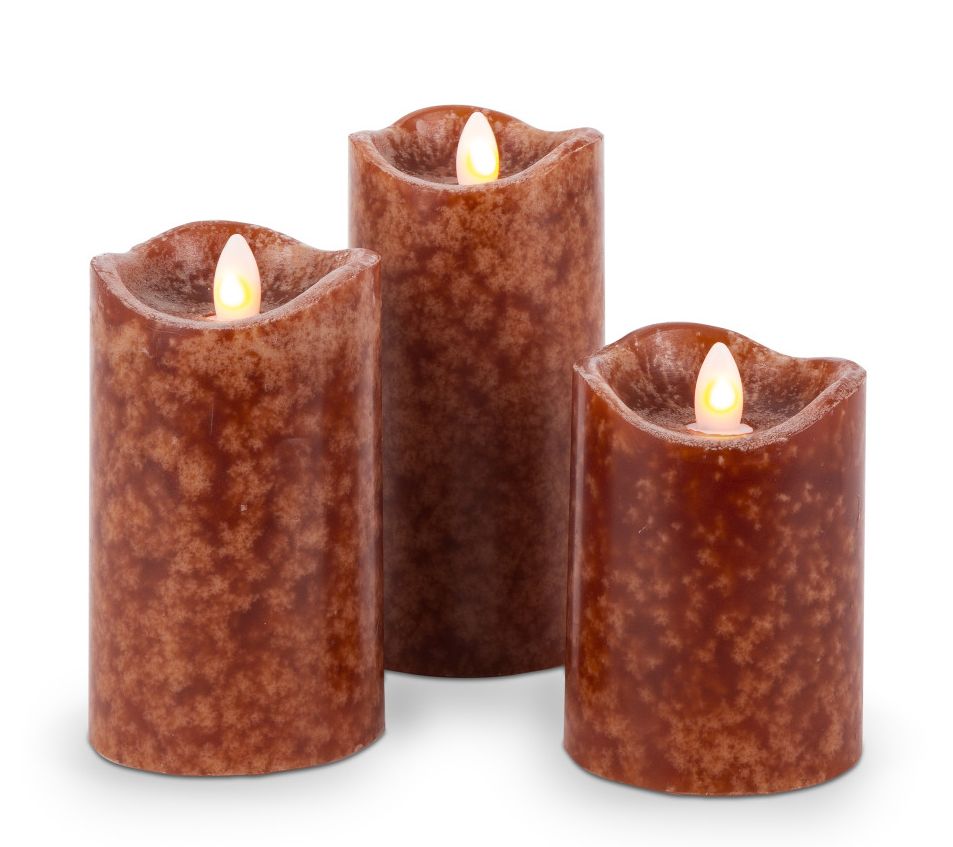 Fill a room with a pleasant glow by displaying these russet-colored pillar candles featuring realistic flame effects. From Everlasting Glow.