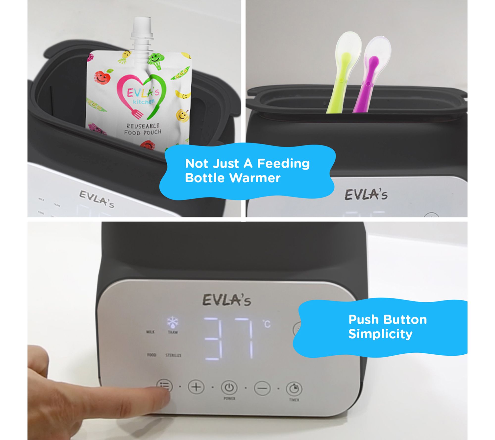 • Defrosts and heats formula, breastmilk, and baby food evenly with precise temperature control