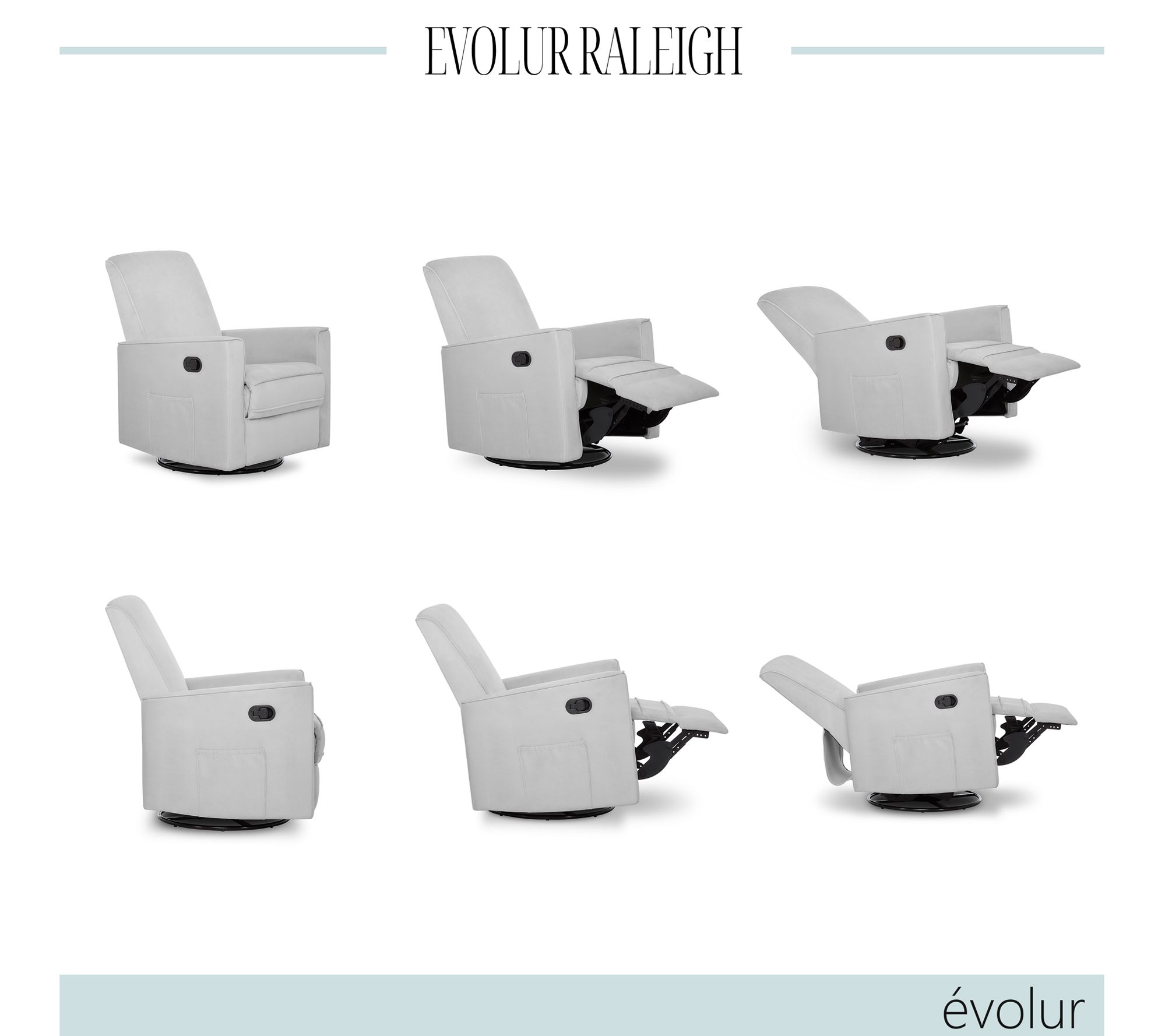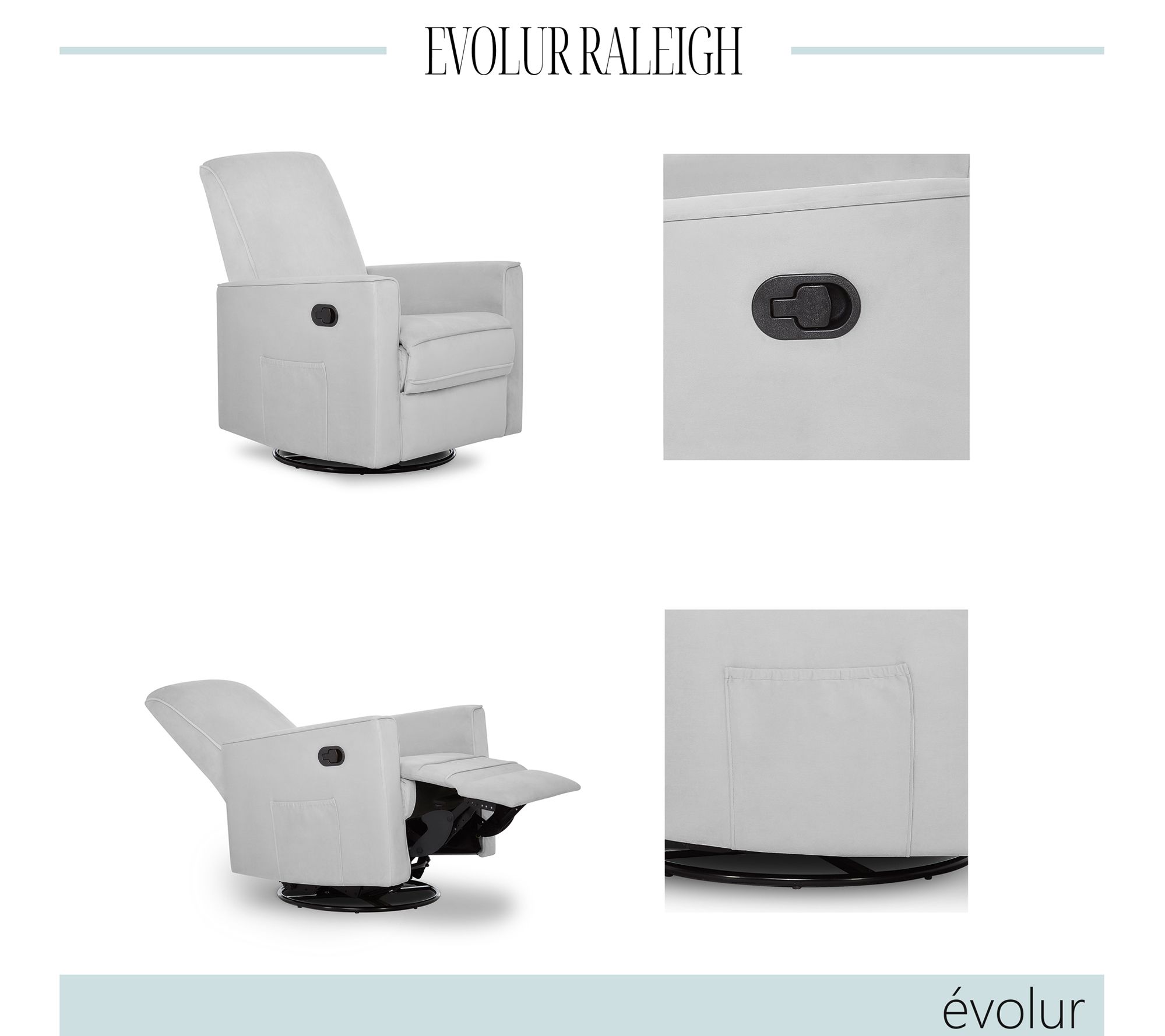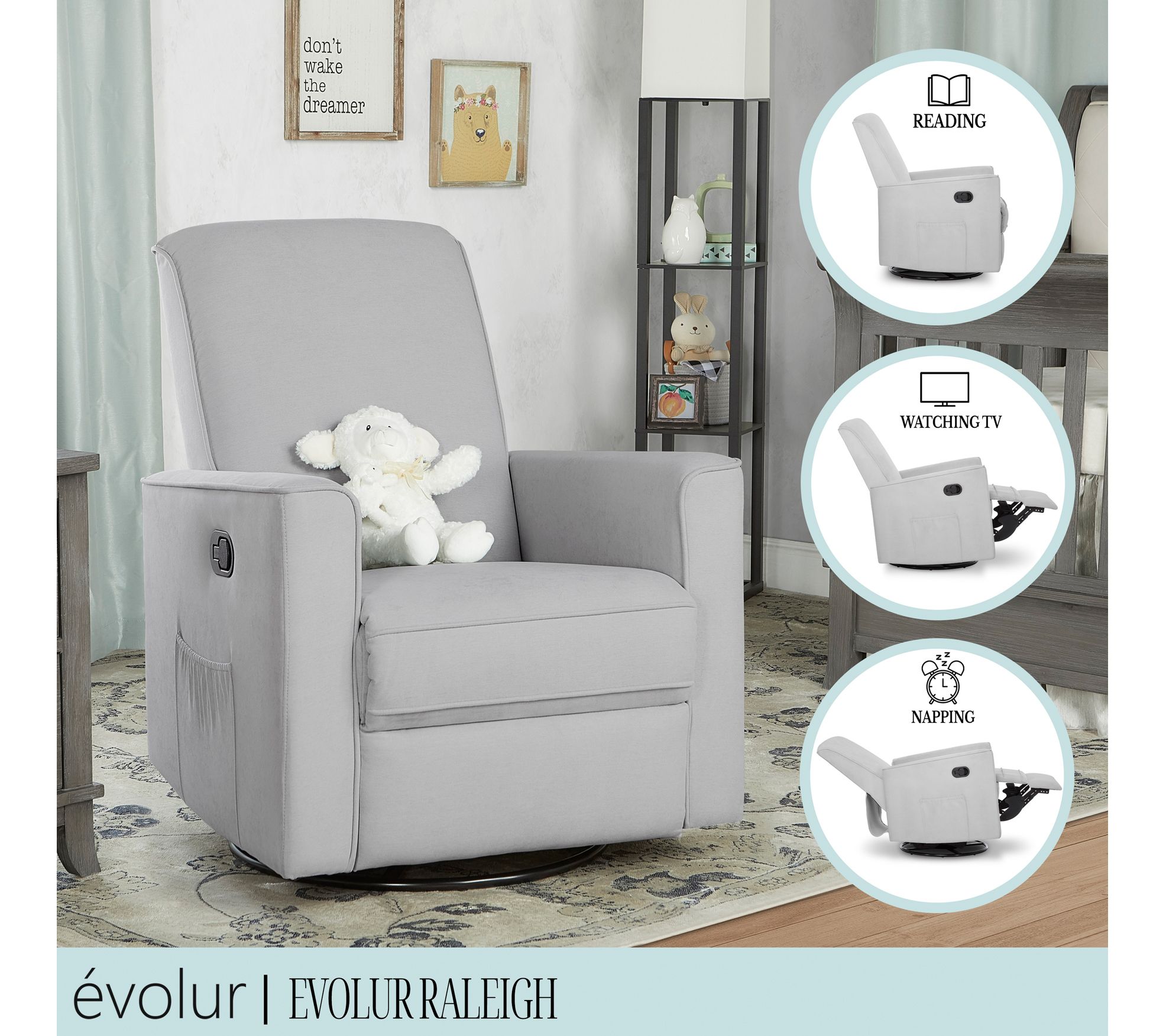 Settle in for a snuggle in the incredibly cozy comfort of this reclining glider. Upholstered in soft fabric and equipped with reclining, gliding, and swiveling mechanisms, it's the perfect spot for feeding or rocking your little one. From Evolur.