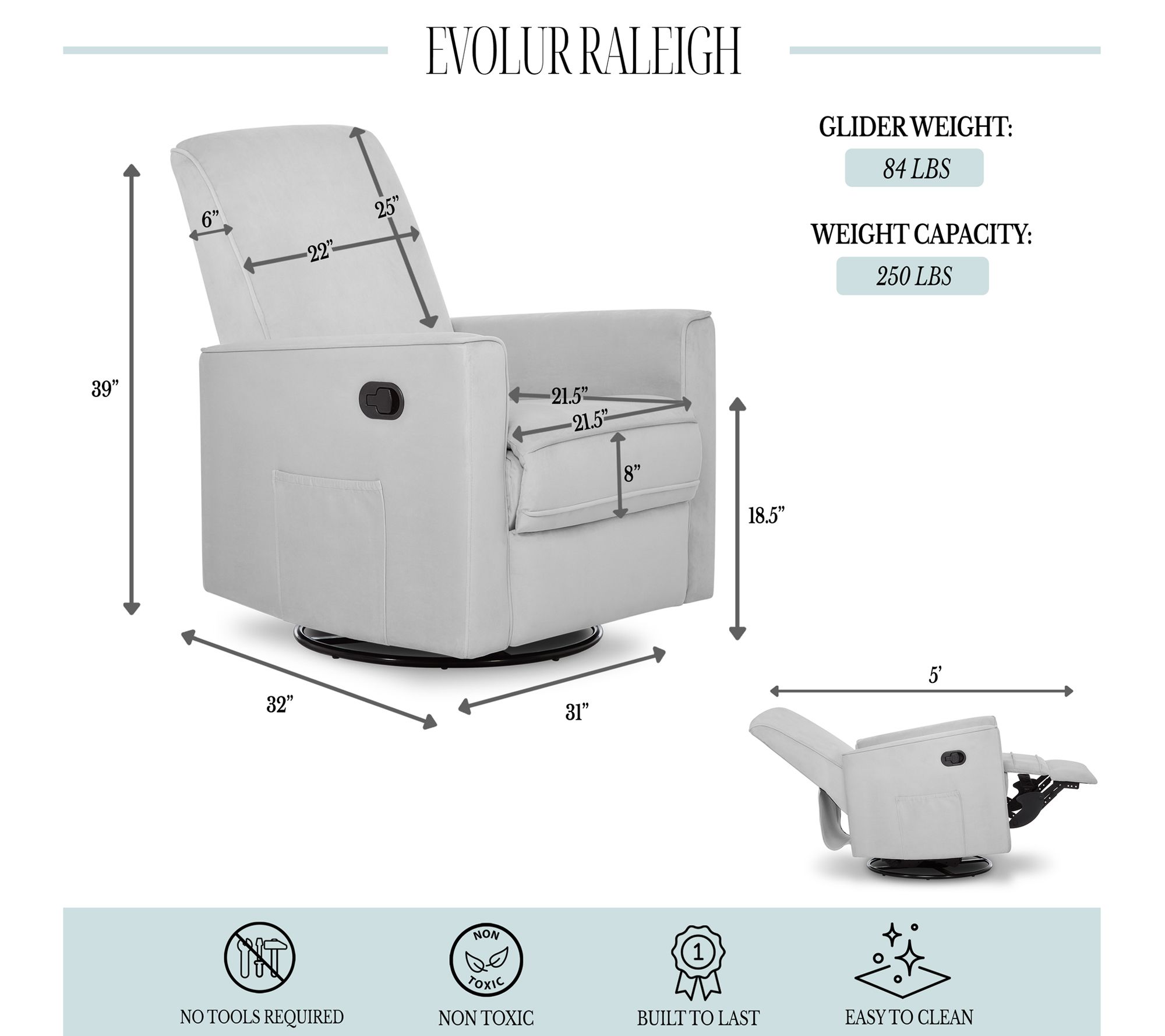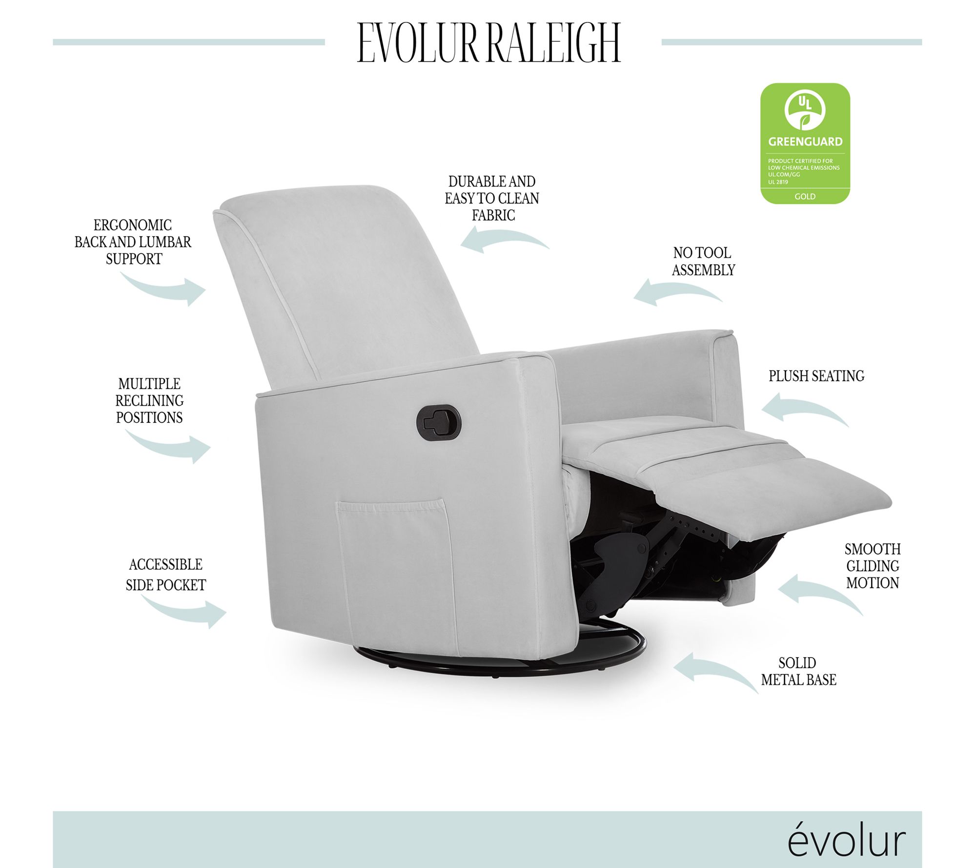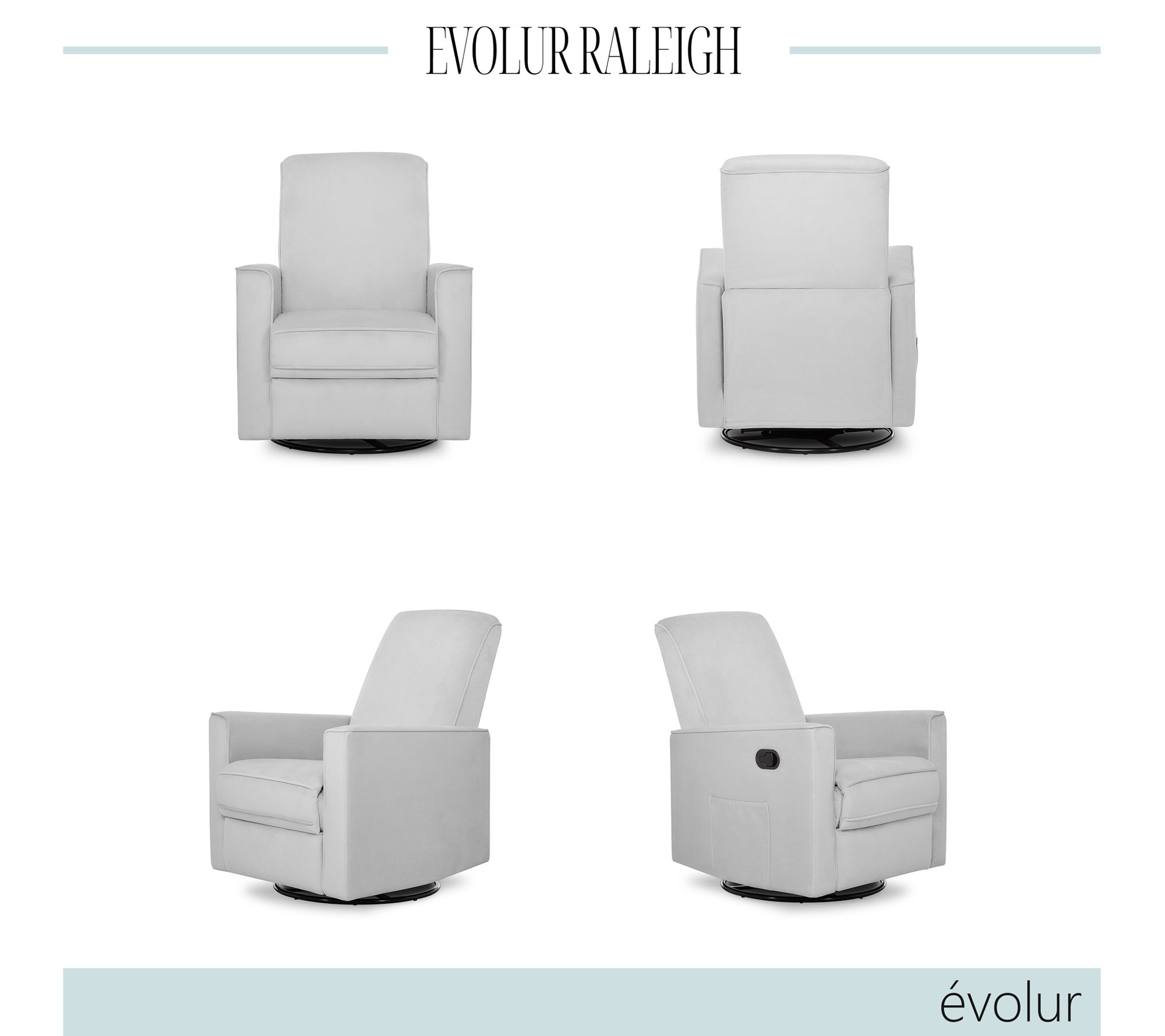 Settle in for a snuggle in the incredibly cozy comfort of this reclining glider. Upholstered in soft fabric and equipped with reclining, gliding, and swiveling mechanisms, it's the perfect spot for feeding or rocking your little one. From Evolur.