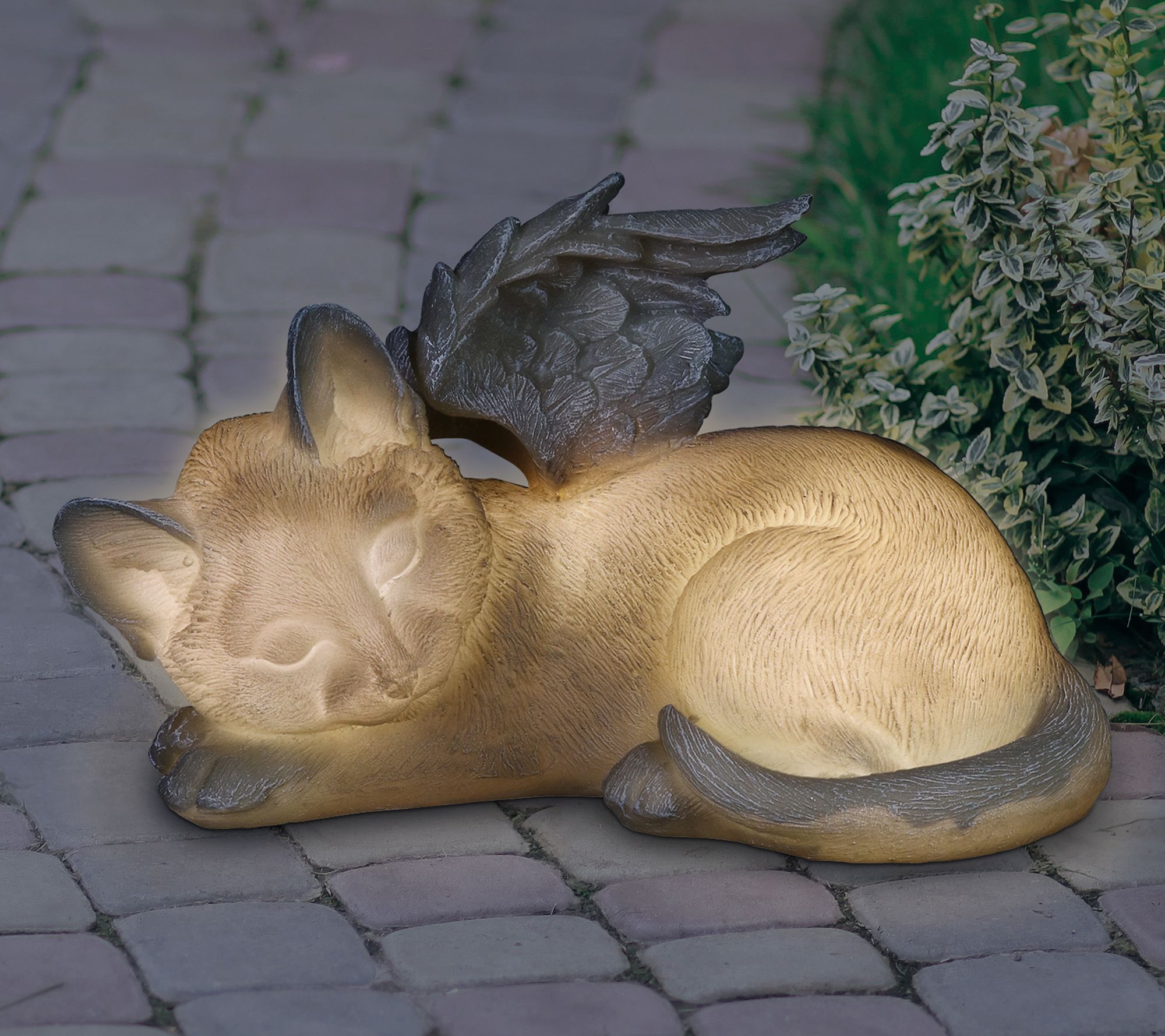 • Solar-powered cat statue illuminates at dusk