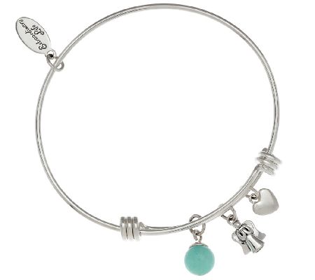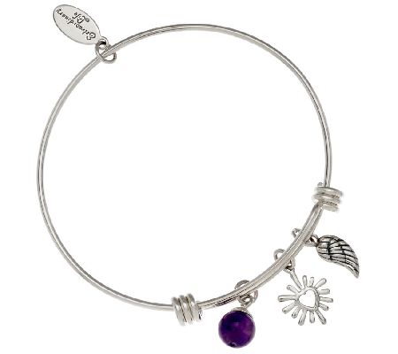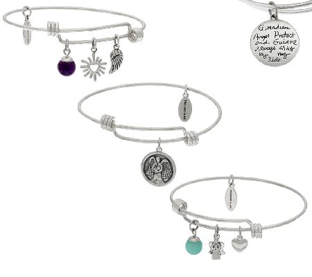 Express your style--and your spirit--with this set of trend-right bangles. Mix and stack three sterling silver bangles that expand to fit your wrist, heart, and soul just right. Each beautiful bangle features an inspirational charm, message, and gemstone bead used to help you express yourself through wearable art. This set comes boxed with an equally inspirational quote card--perfect for gifting to those who lead a charmed life.