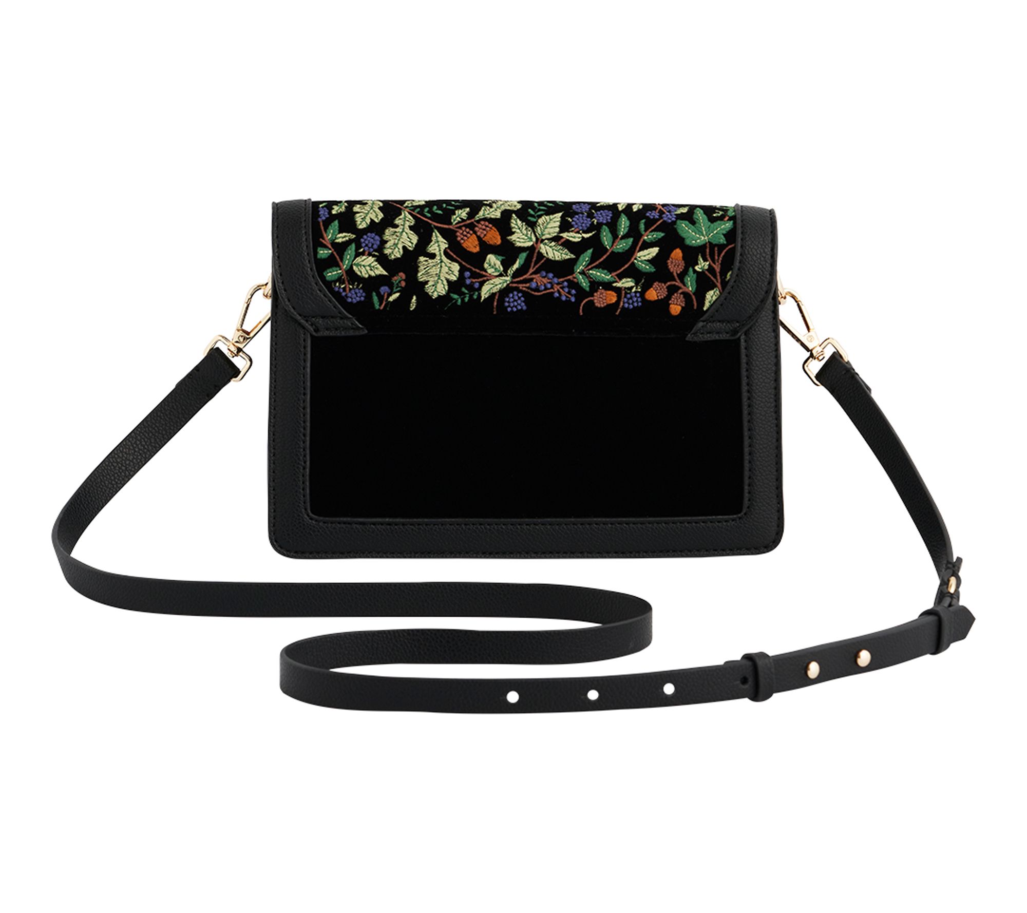 Fold-over flap with clasp fastening; embroidered acorns and ivy accents; goldtone hardware; adjustable and detachable single strap