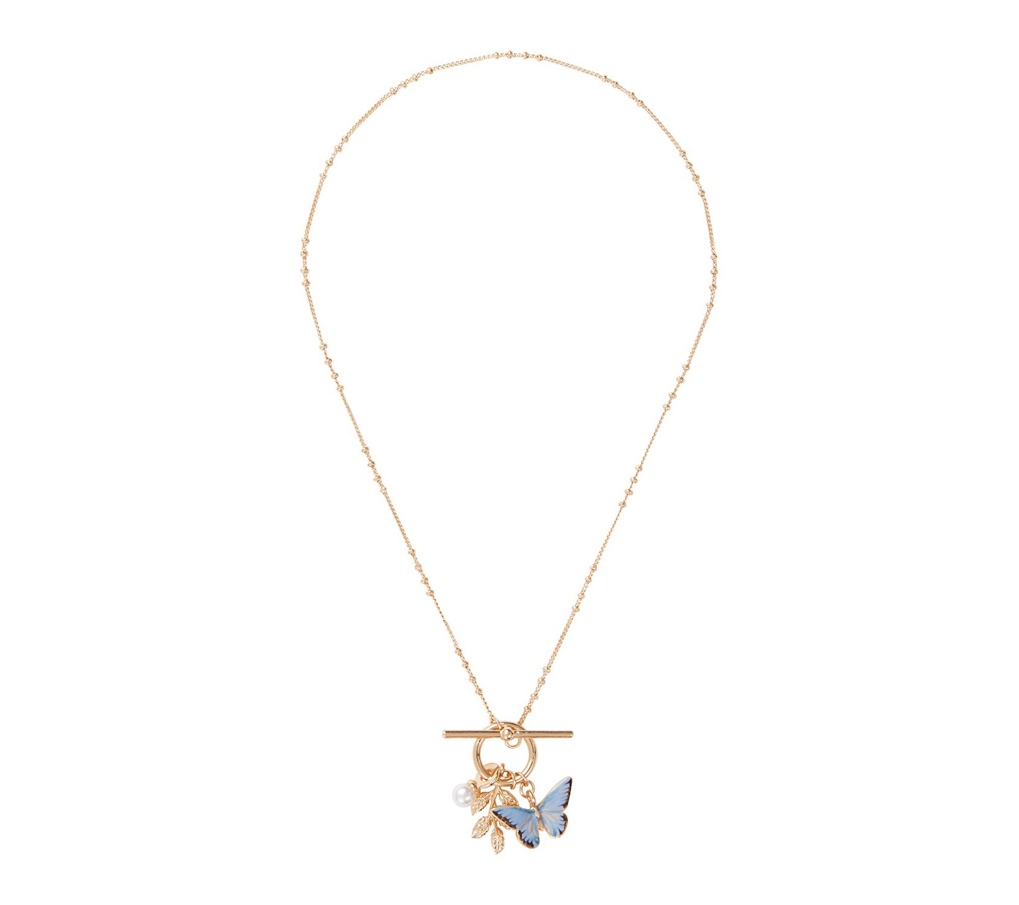 • Clustered charm design; enamel-painted blue butterfly; beaded chain; intricate nature-inspired detailing; simulated cultured pearl accent