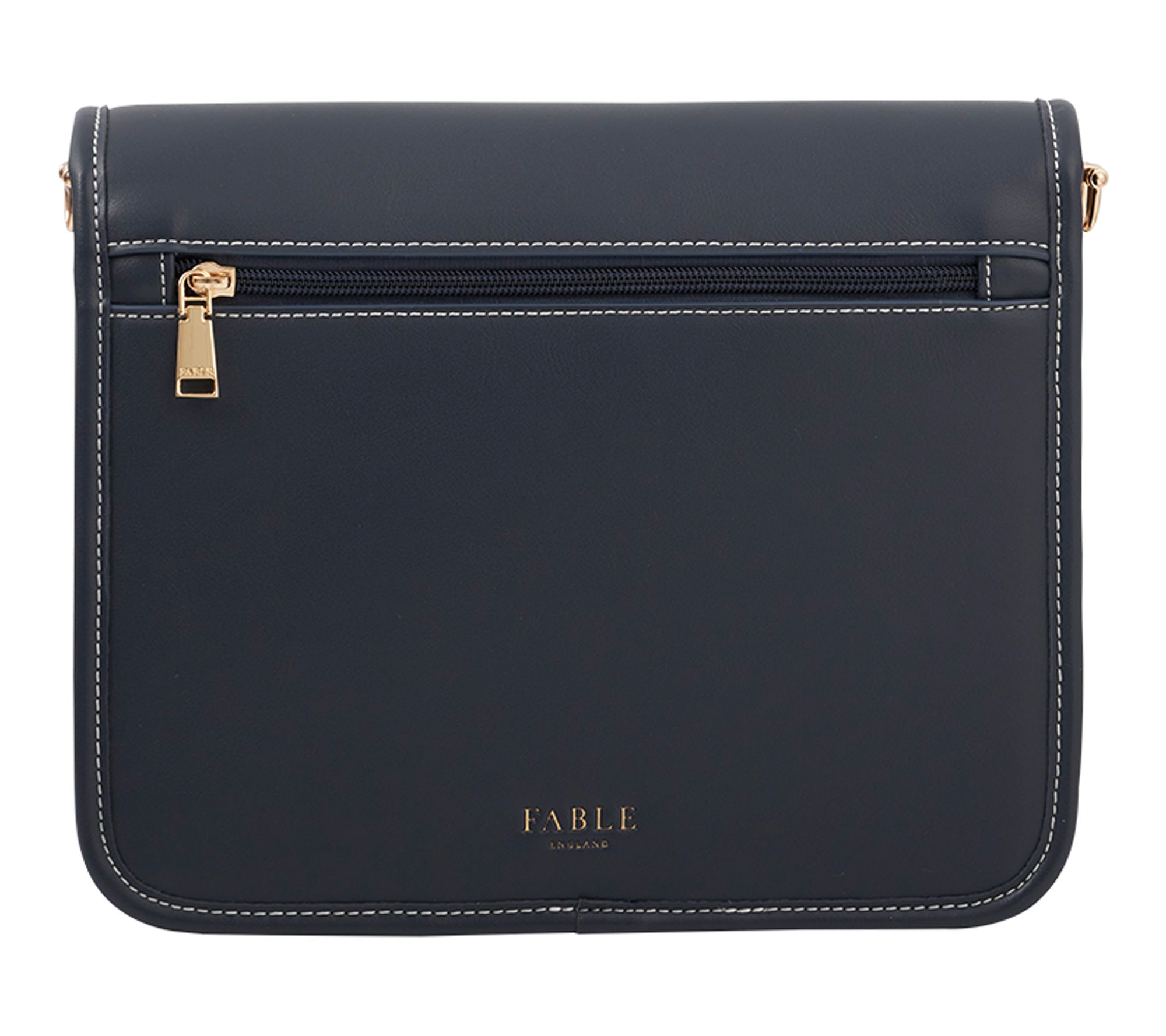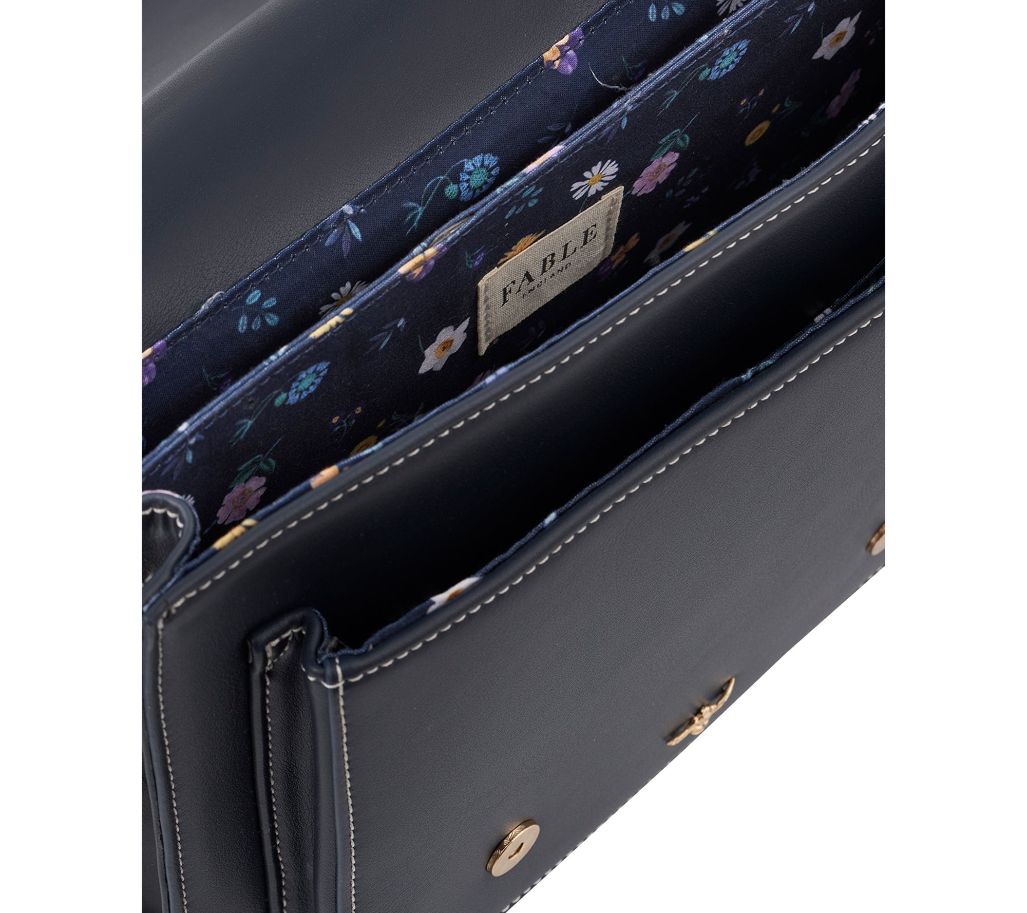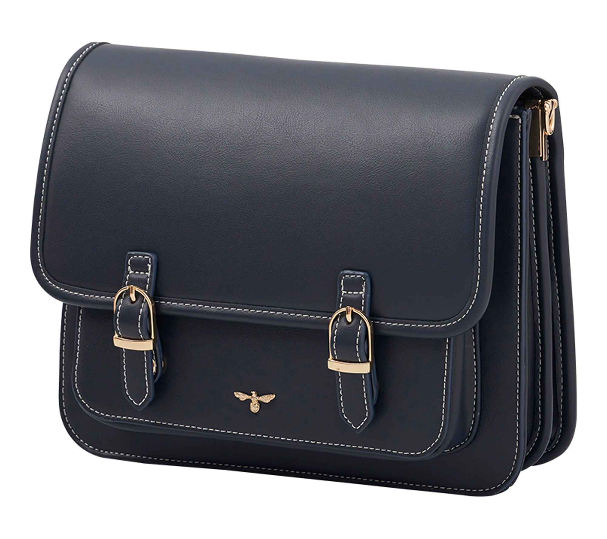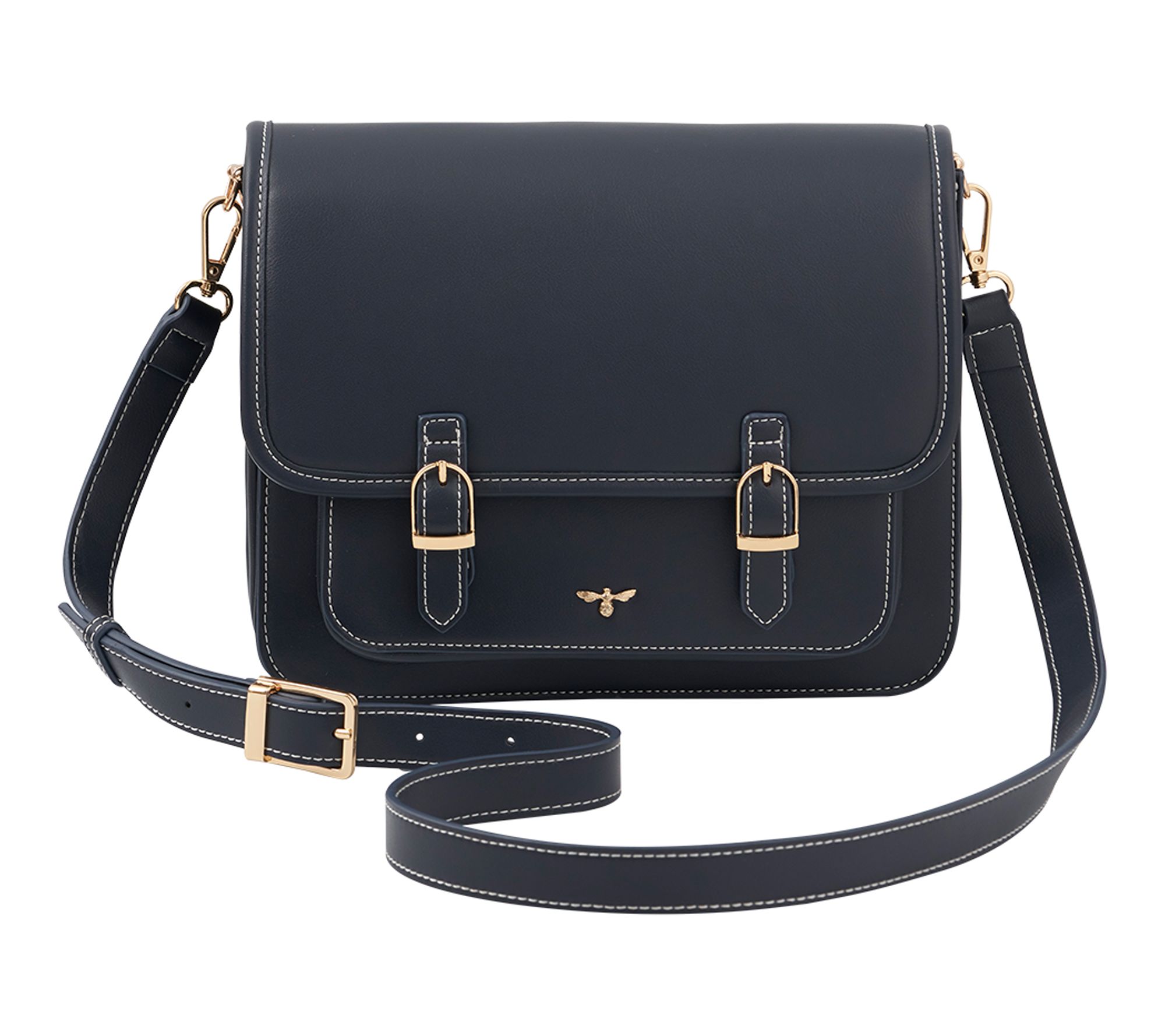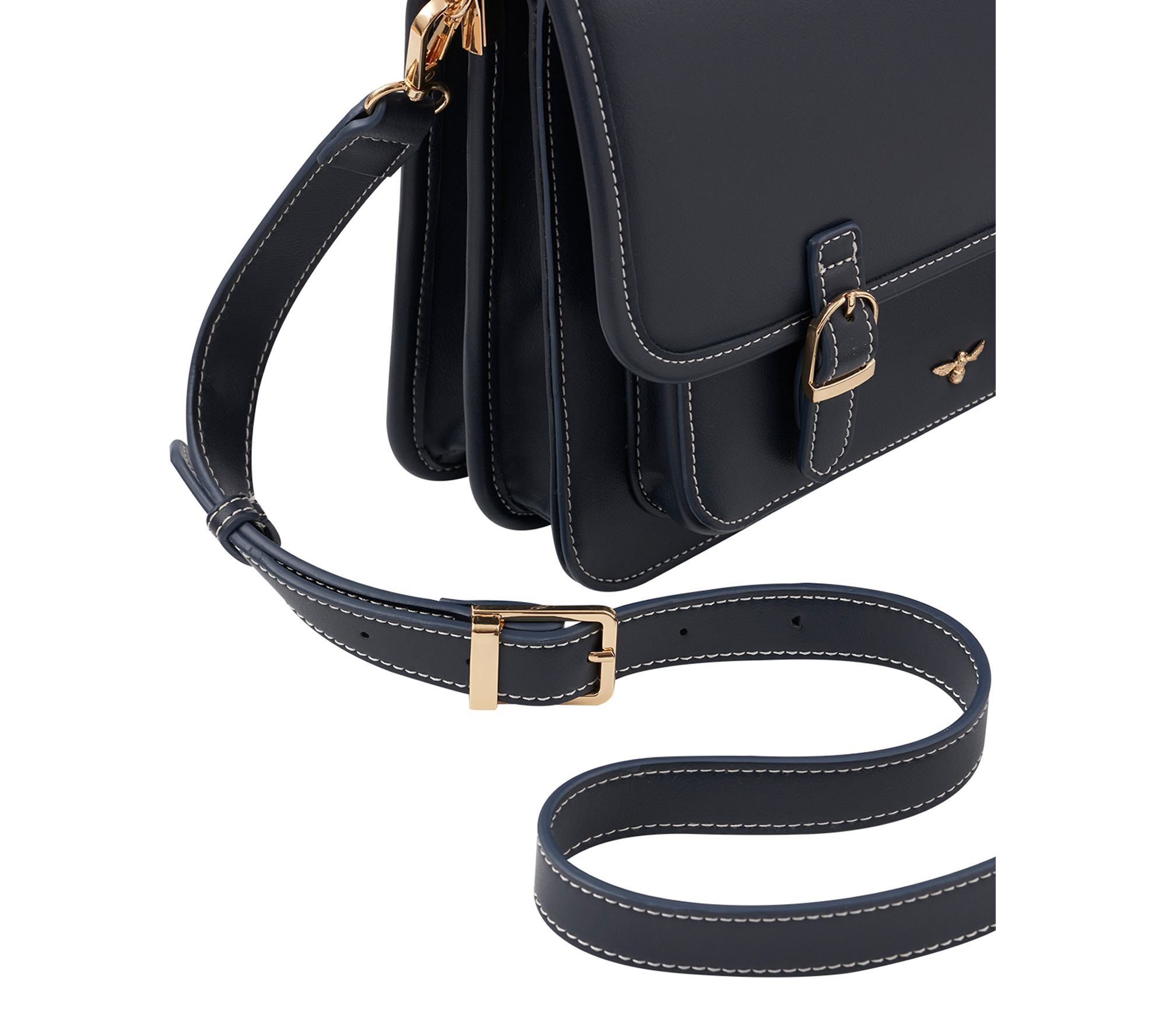 • Magnetic snap closure, goldtone hardware, detachable and adjustable single strap, two goldtone buckles, signature Fable bee plaque, contrast stitching
