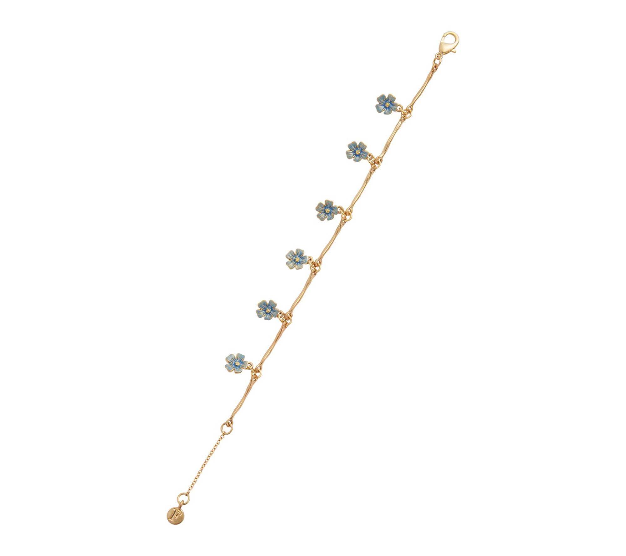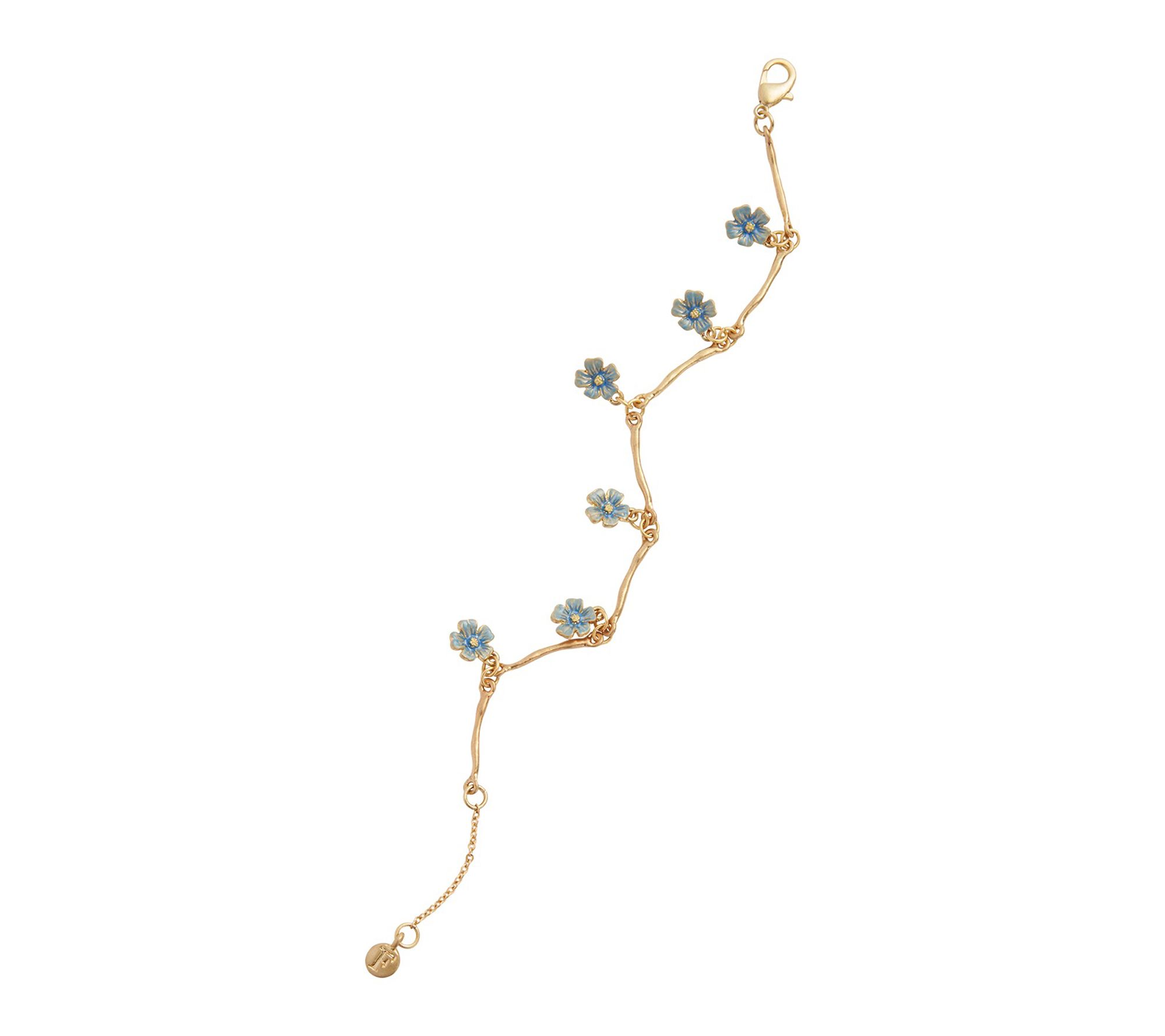 • Features six enamel forget-me-not flower charms connected by twig-like forms; organic, fairytale-inspired design