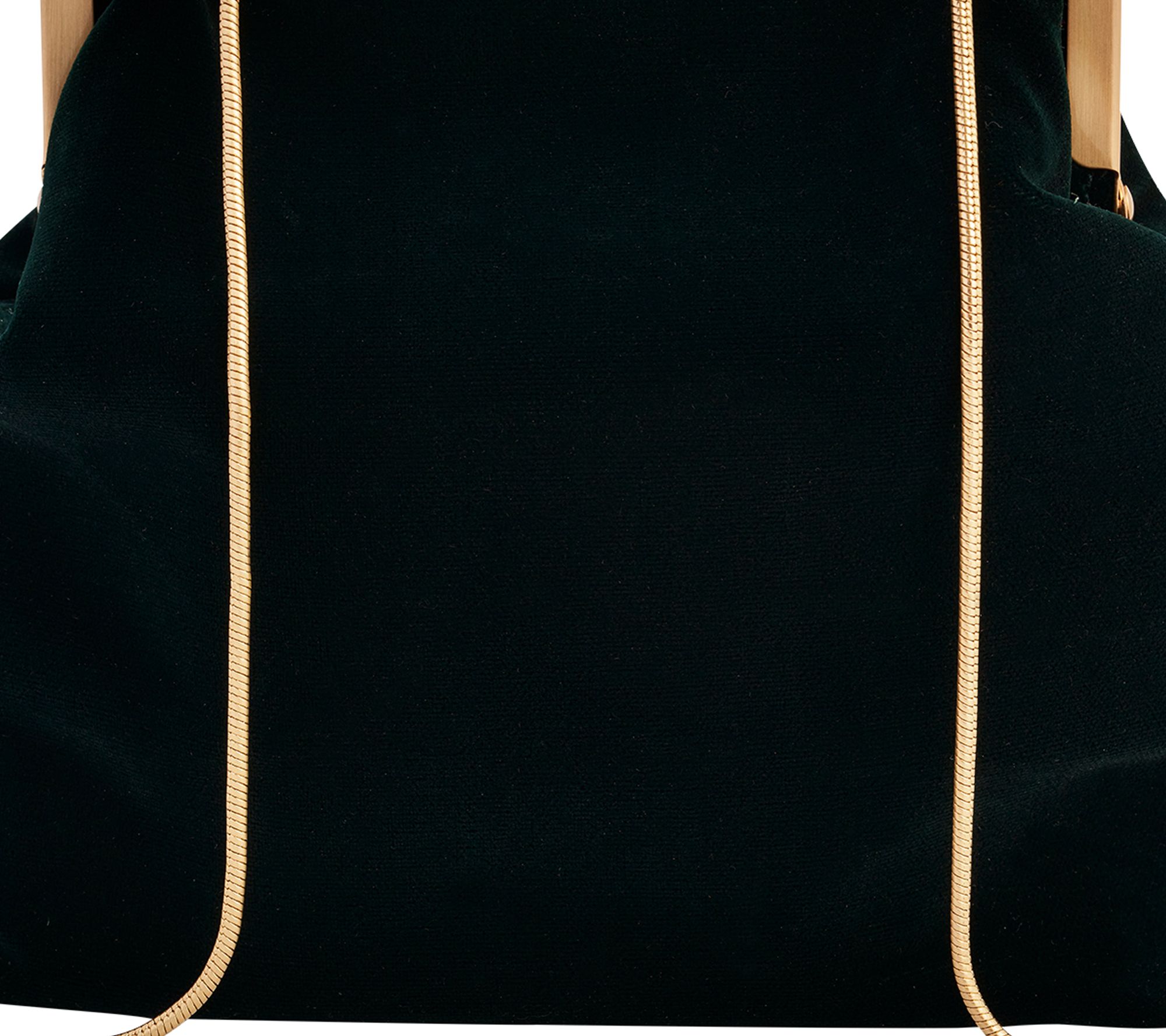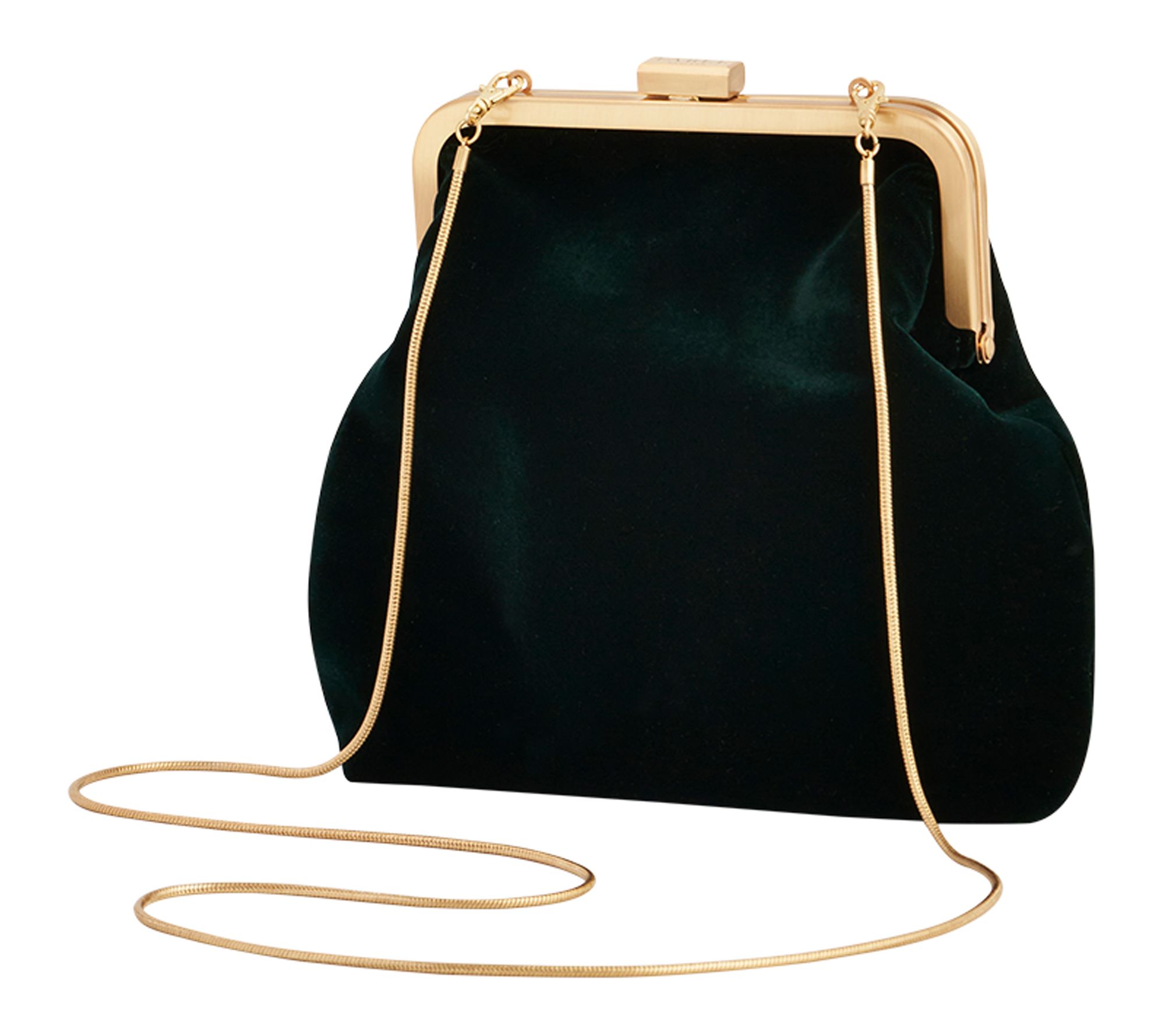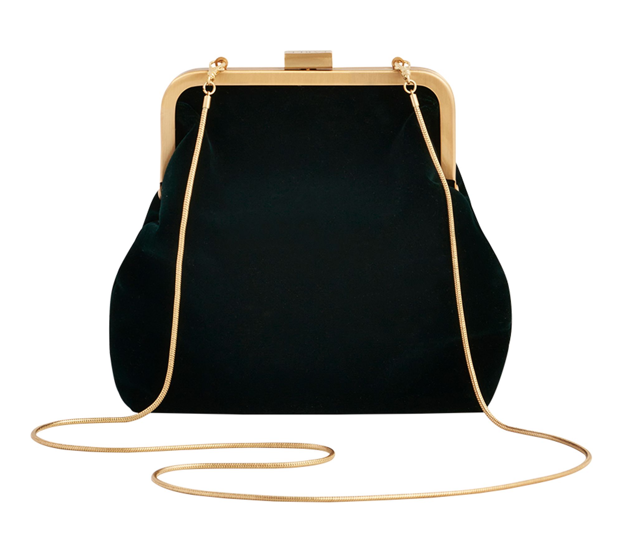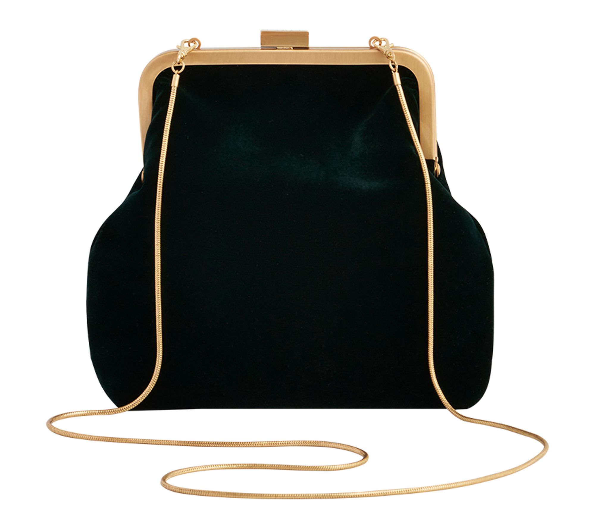 • 1920s-inspired frame clasp, goldtone snake chain, detachable single strap can be worn crossbody, deep forest green velvet exterior
