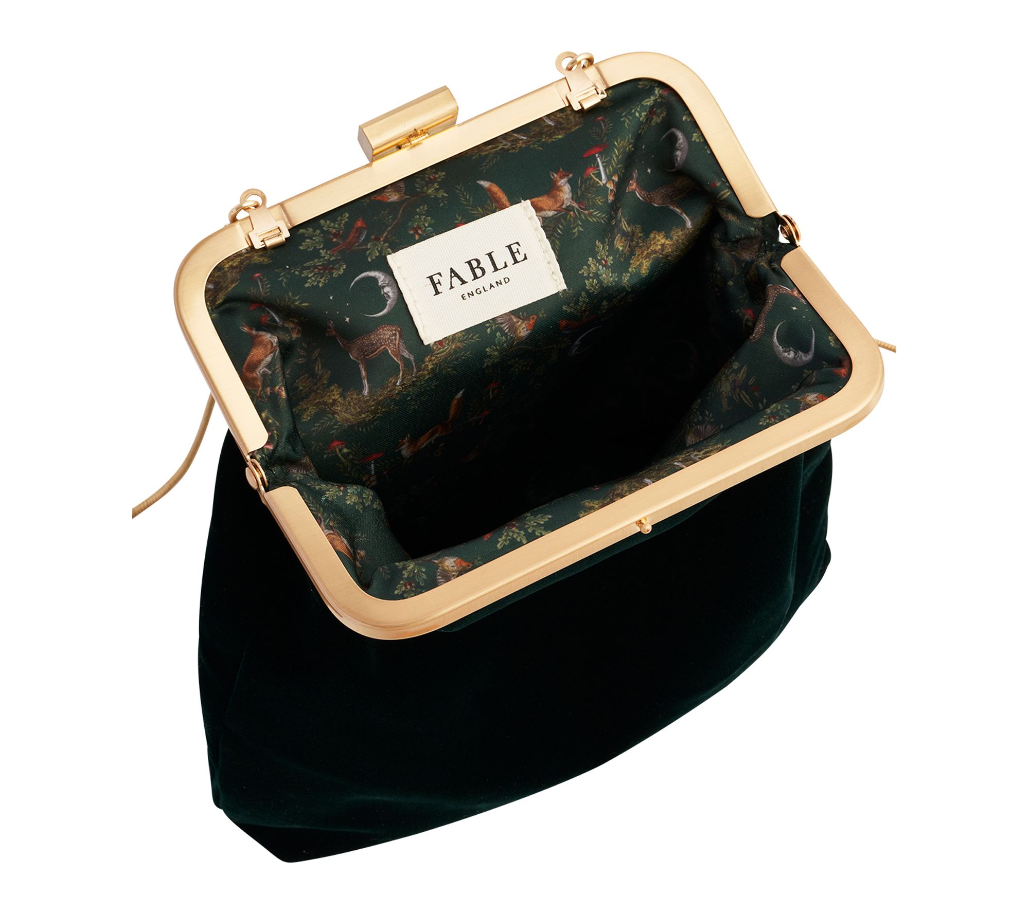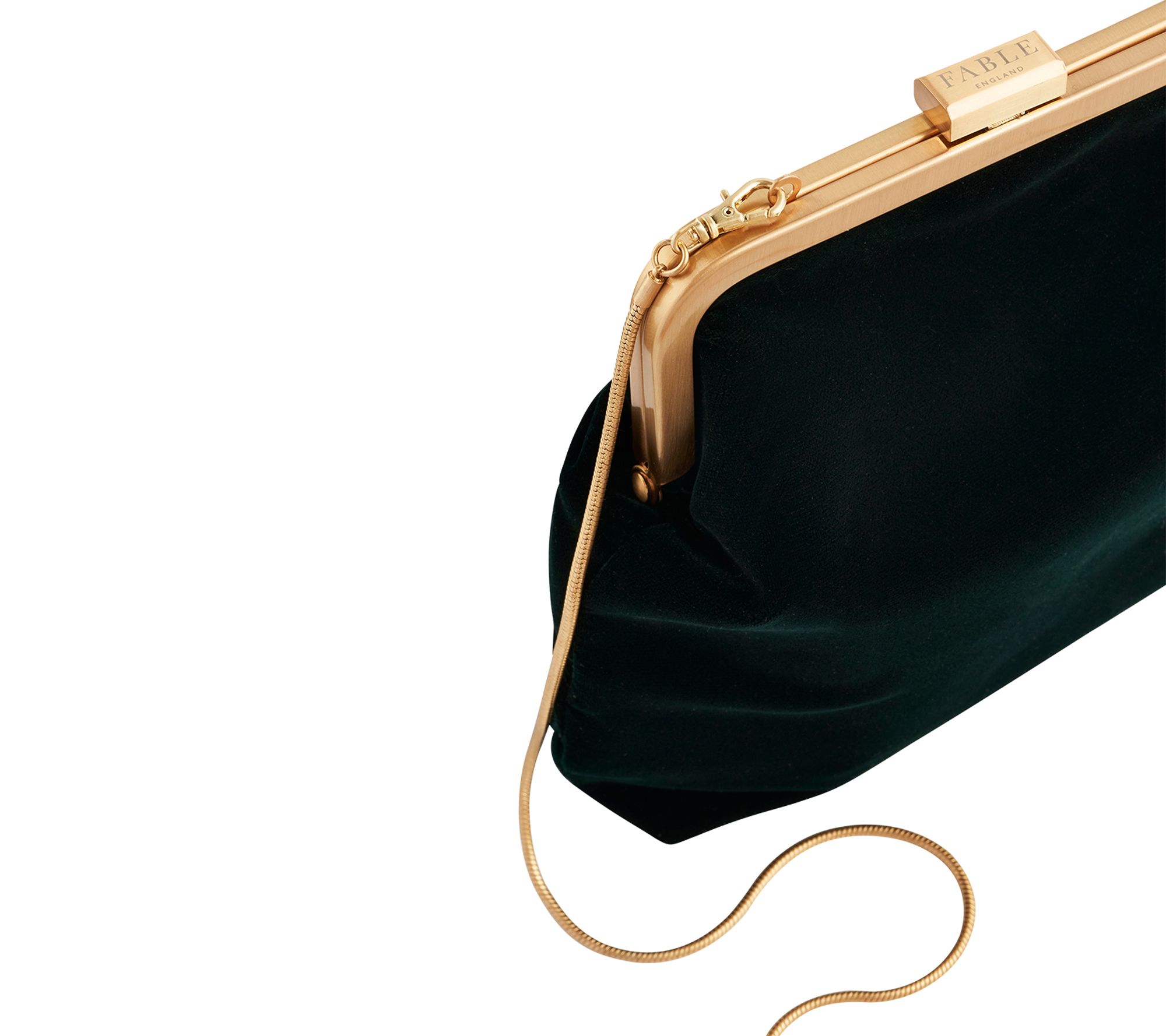 Turn heads at your next evening out with this clutch -- where rich woodland green velvet and a 1920s-inspired frame clasp bring vintage glamour to every dinner or moonlit stroll. The delicate goldtone snake chain strap adds refined elegance, while the compact profile keeps your look effortlessly chic from cocktails to special occasions. From Fable England.