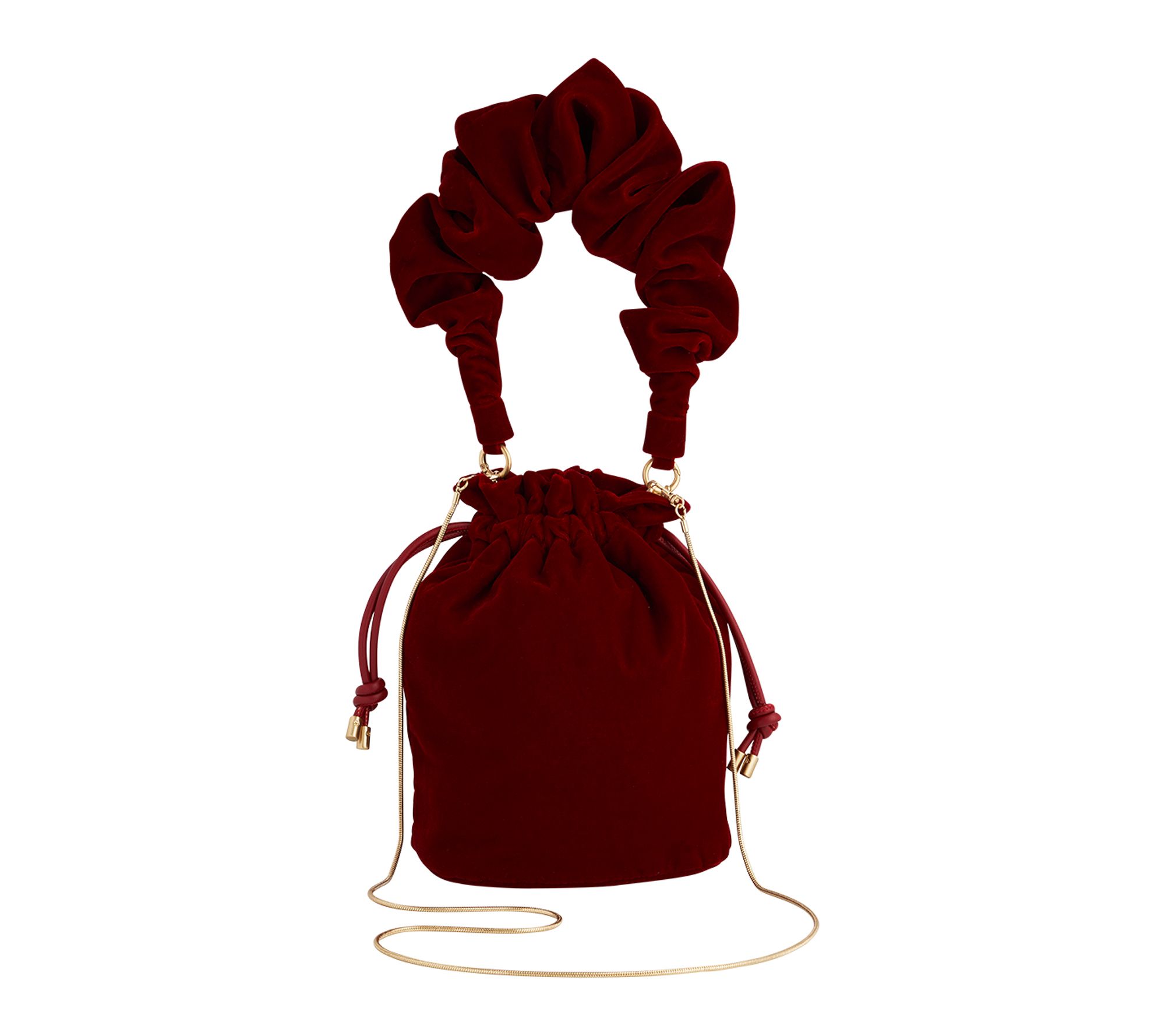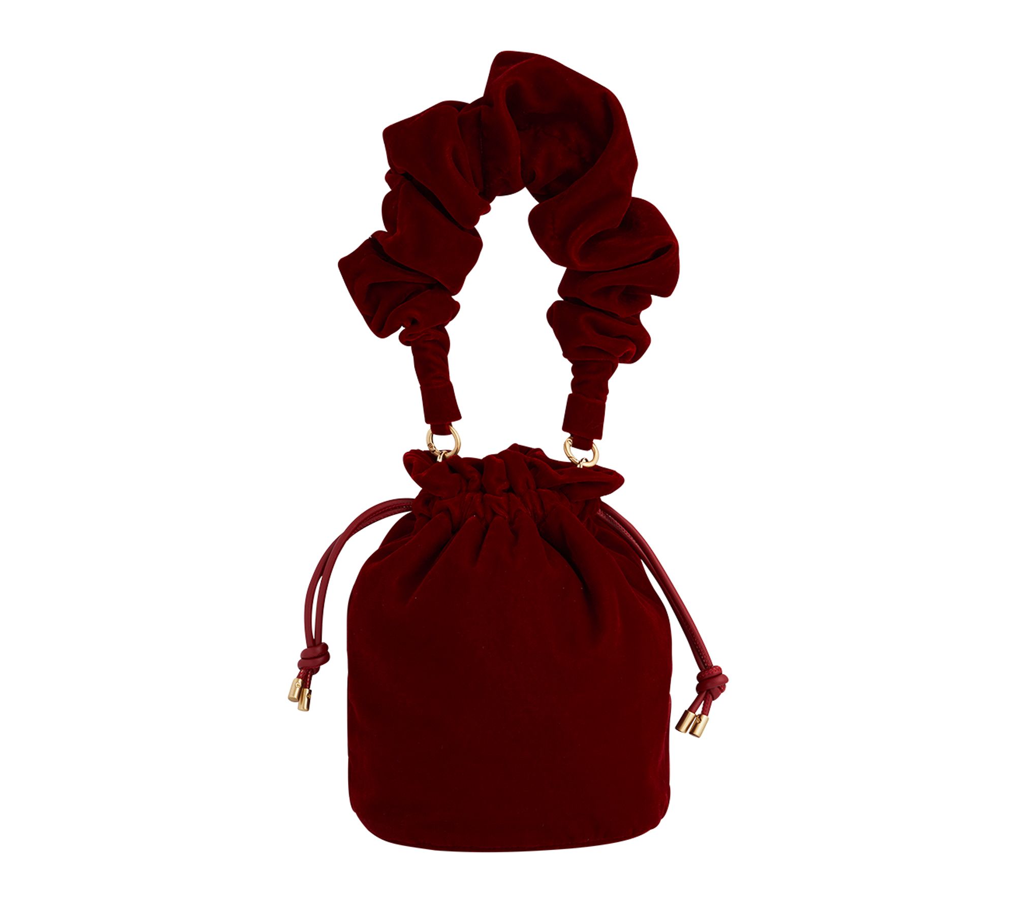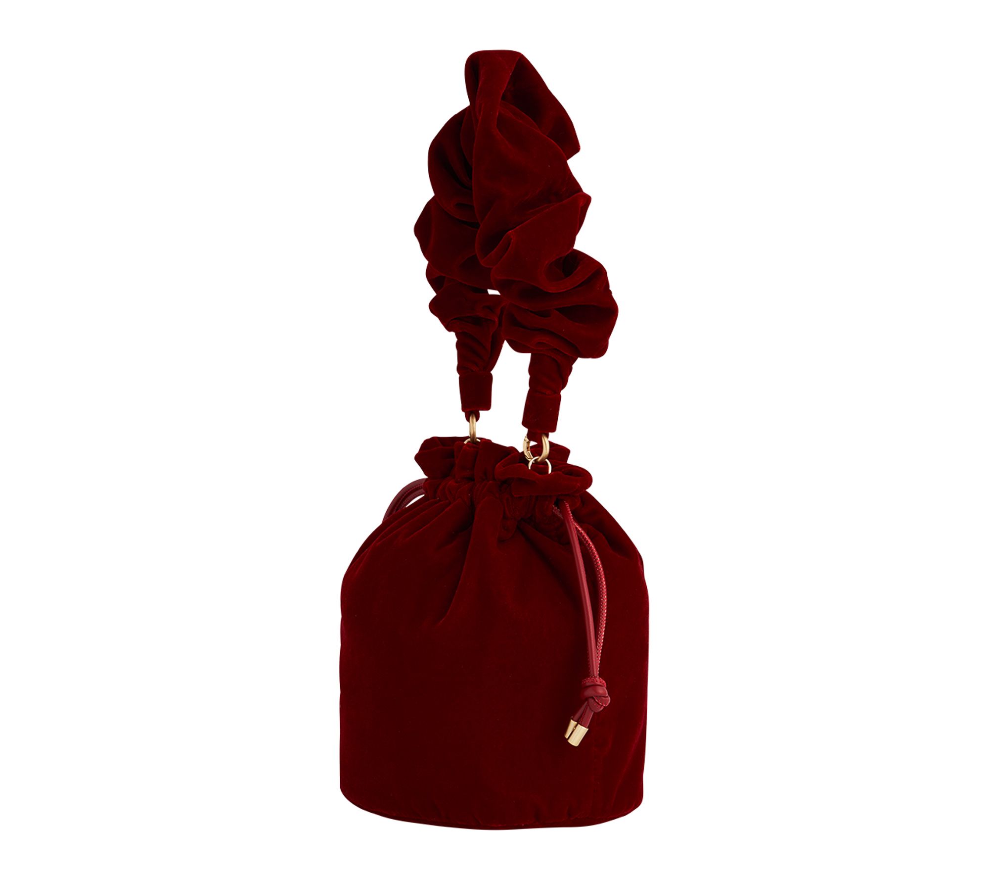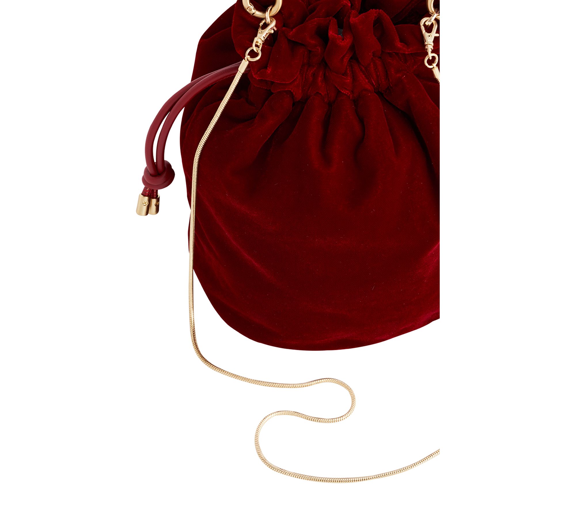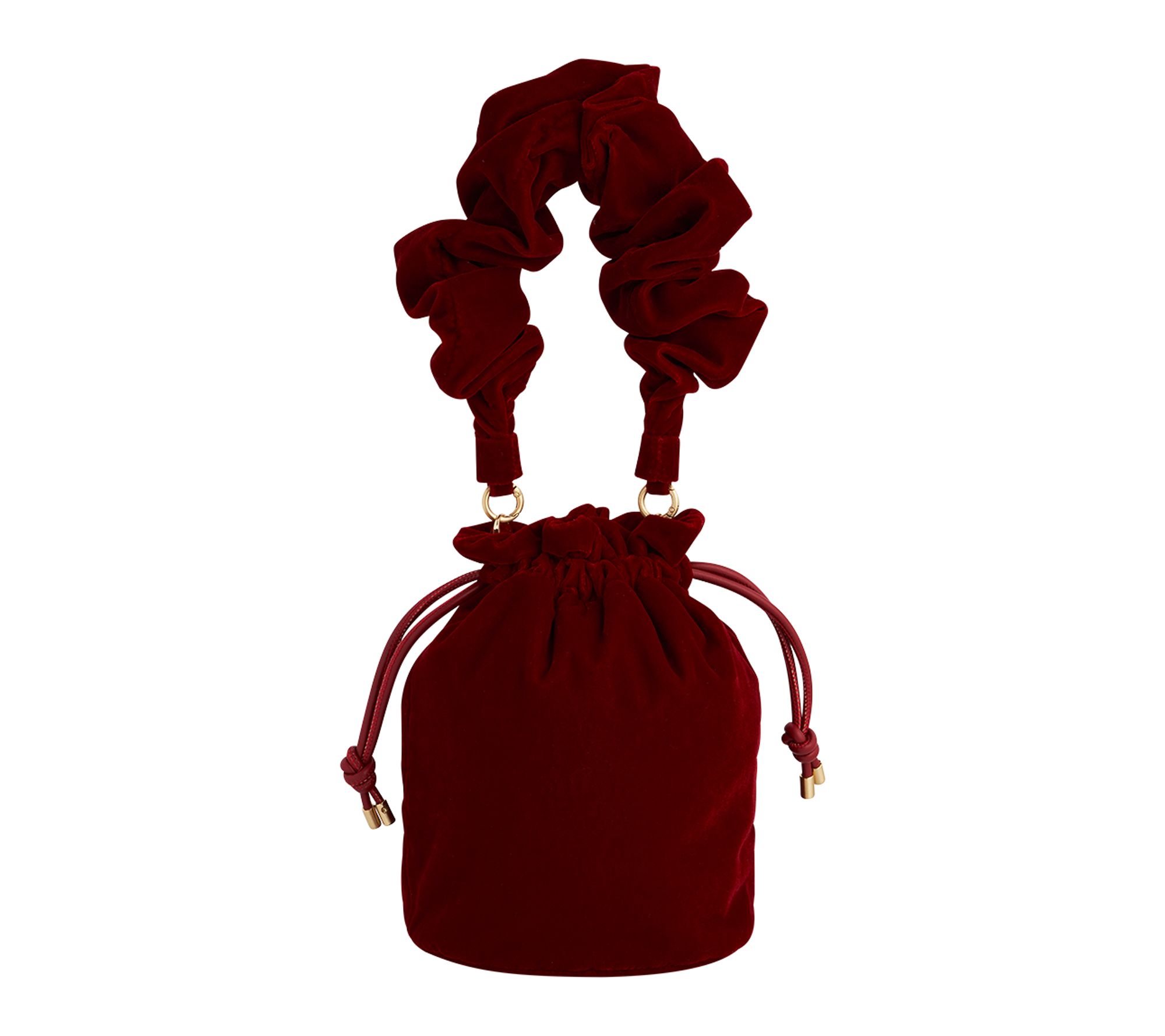 Luxurious velvet-like fabric and a vibrant ruby hue make this bucket bag a dreamy companion for everything from festive evenings out to casual brunches. The playful ruffled handle and charming drawstring closure invite you to effortlessly carry your essentials with grace, while goldtone accents bring just the right amount of shine. From Fable England.