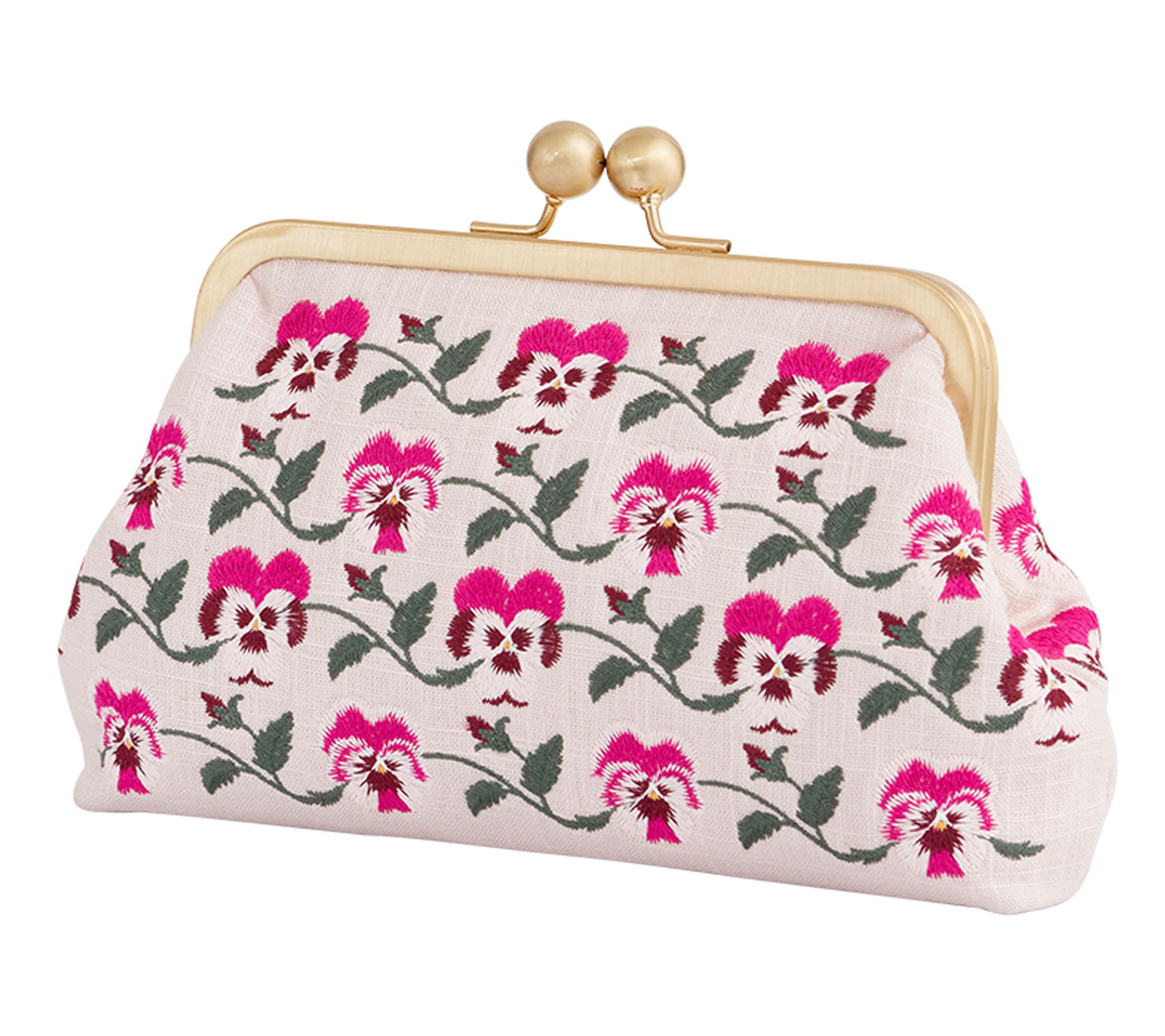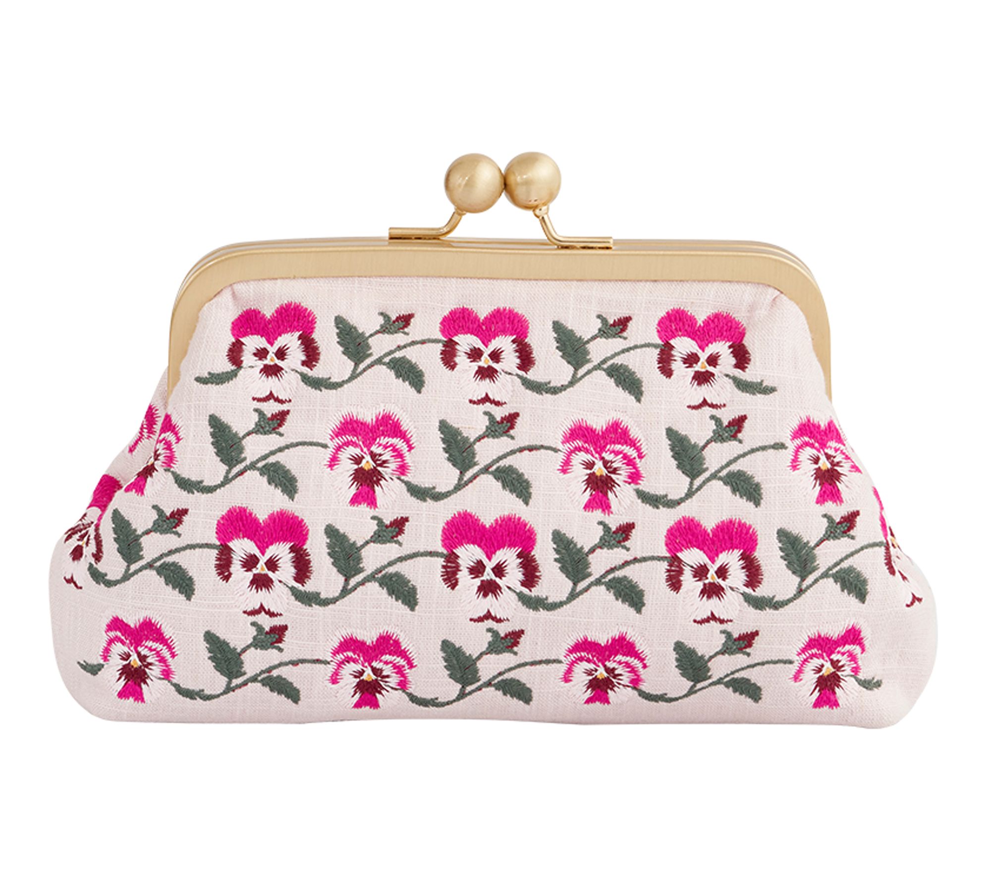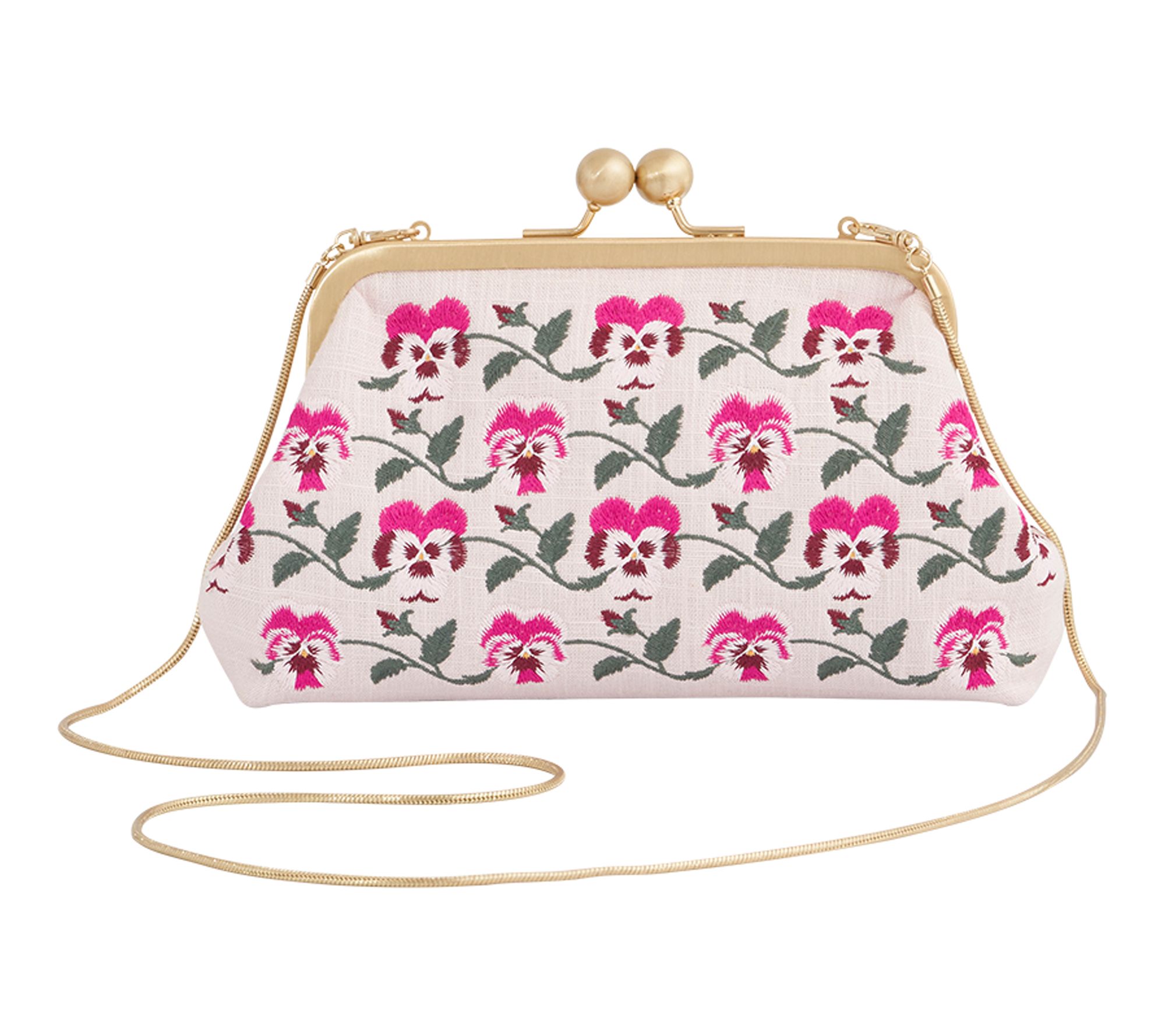 • Embroidered exterior; twist lock closure; detachable single strap; goldtone hardware