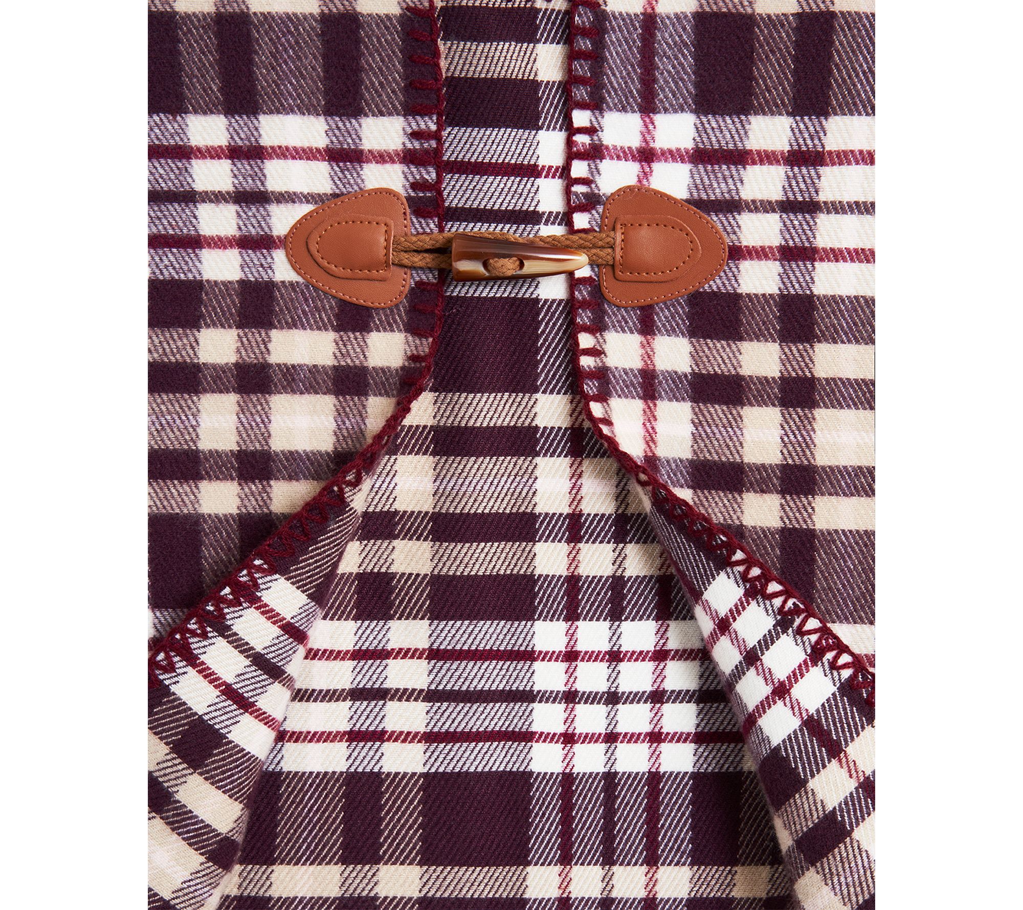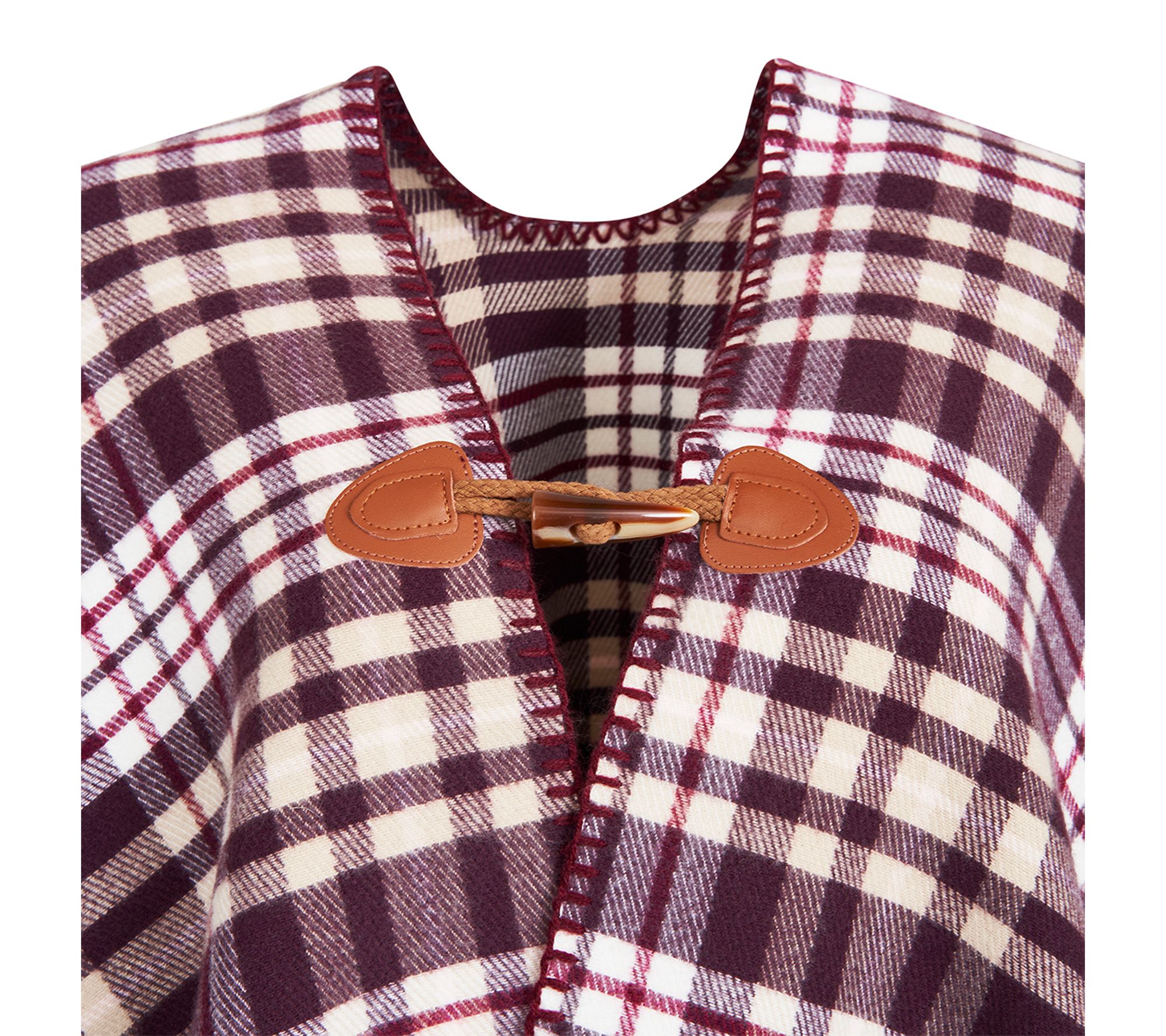 Bring a touch of quiet, woodland elegance to your fall and winter wardrobe with this sleeveless cape. Woven in earthy caramel and chocolate hues, the oversized design offers a soft layer of warmth, ideal for brisk evening strolls or cozy gatherings. Toggle closure and a checkered pattern add subtle flair to every outing. From Fable England.