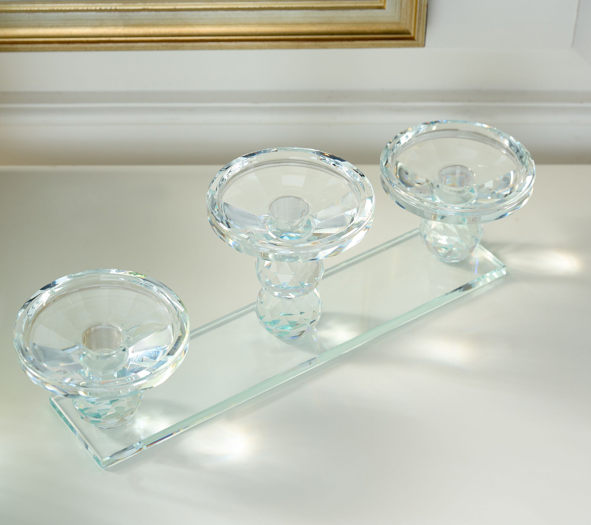 Faceted glass spheres; rectangular glass base with three affixed pedestals