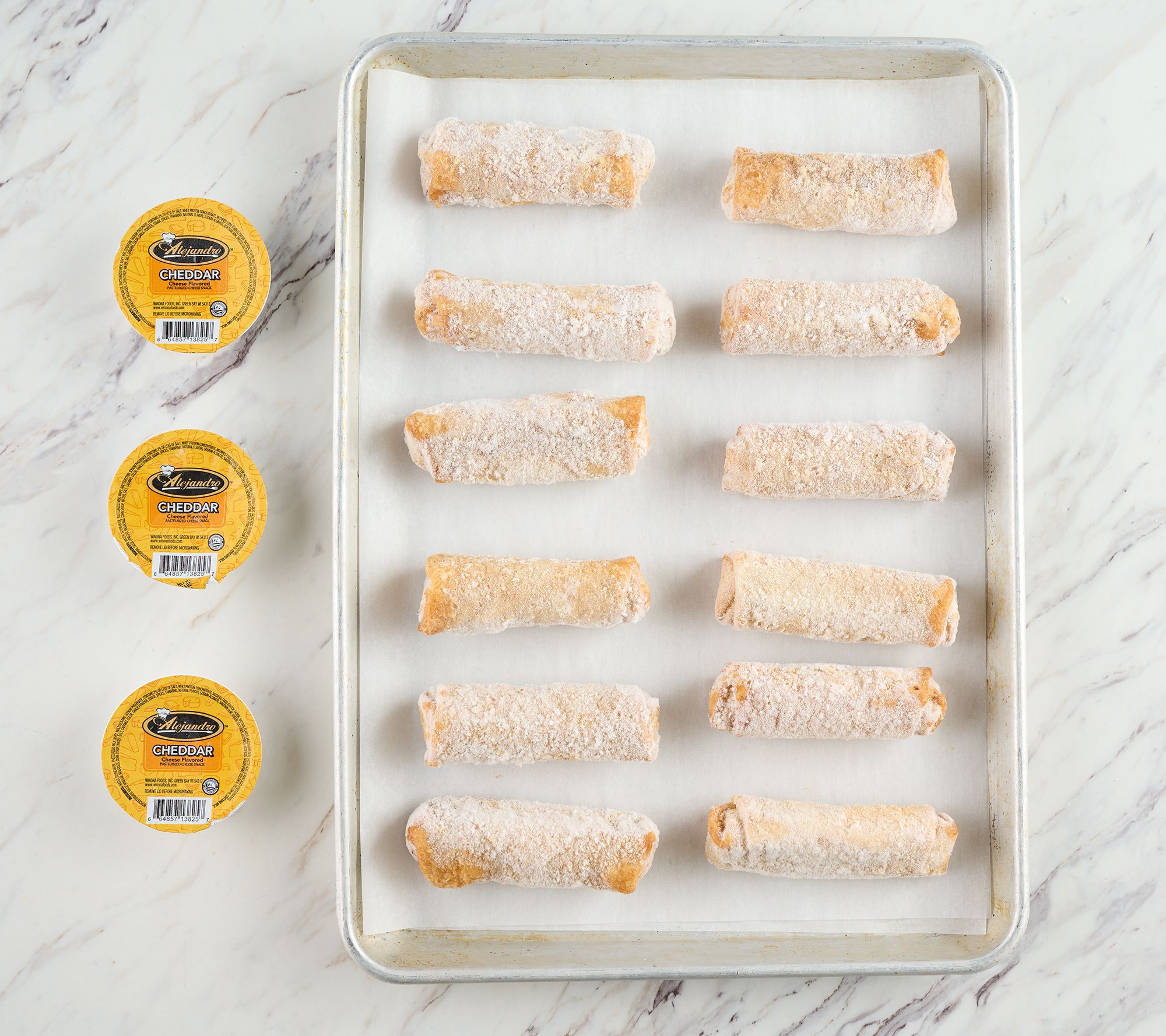 Includes 12 3-oz cheesesteak egg rolls and three 1.5-oz cheddar cheese cups