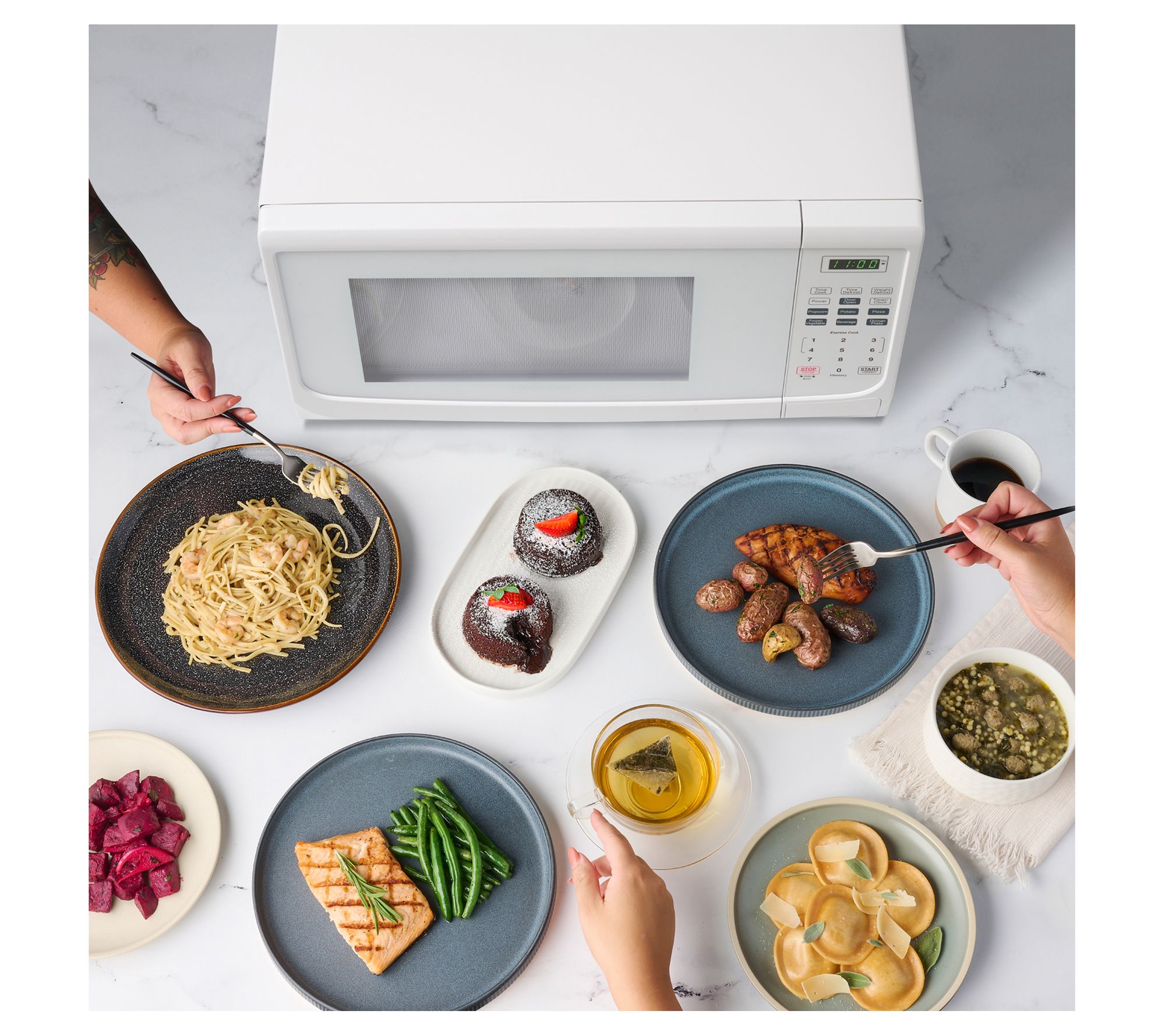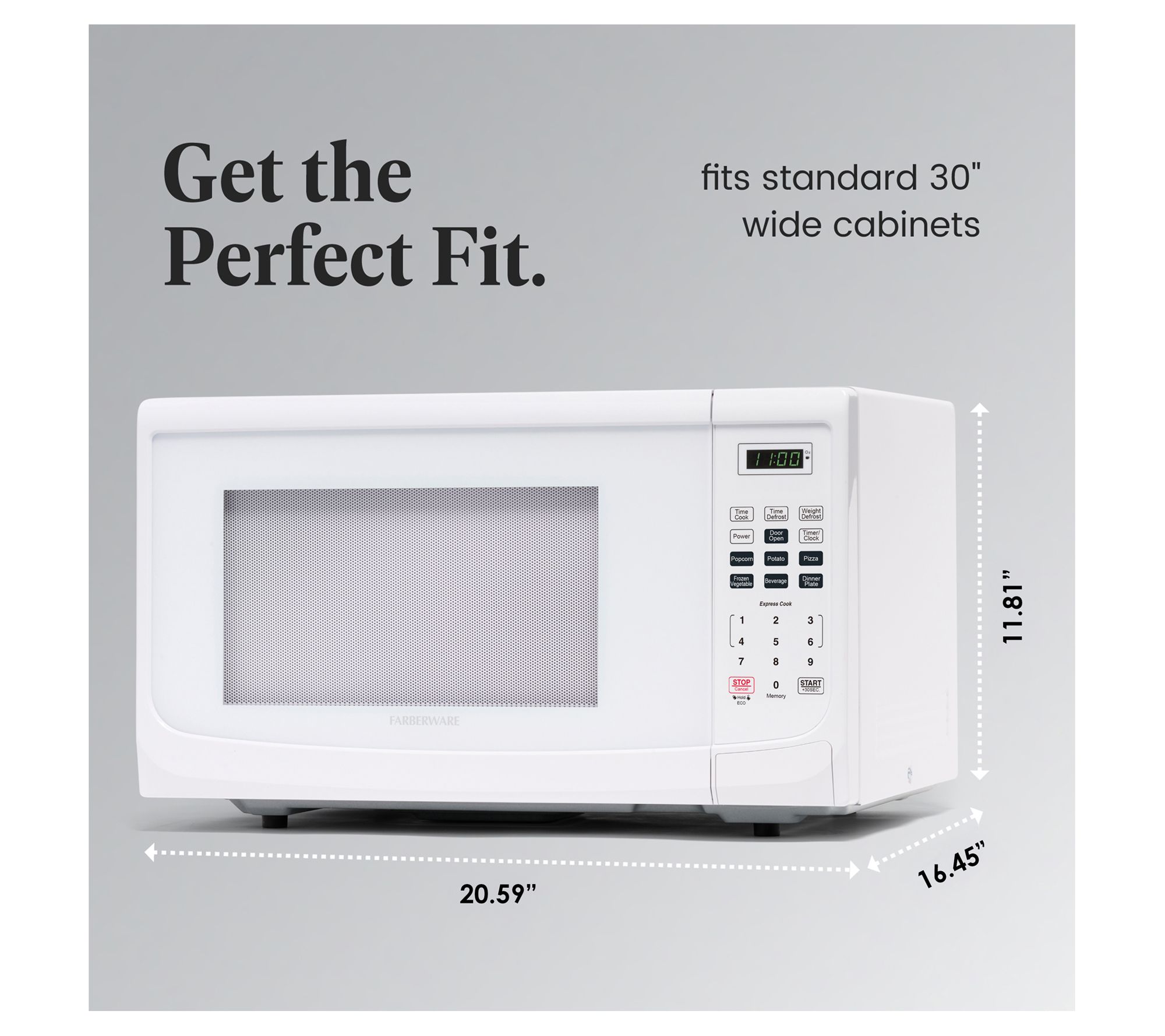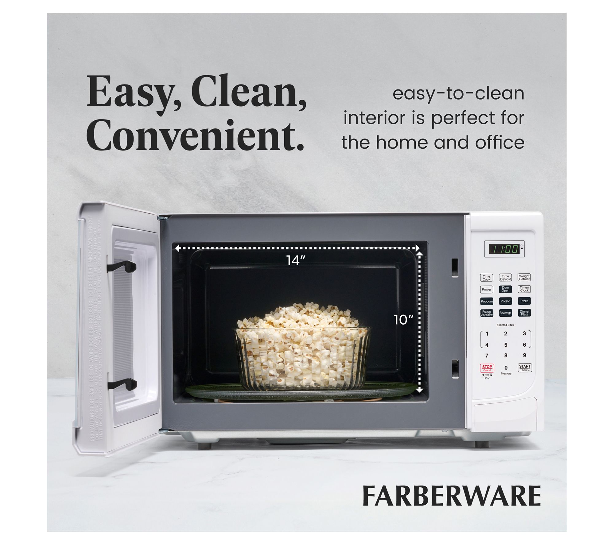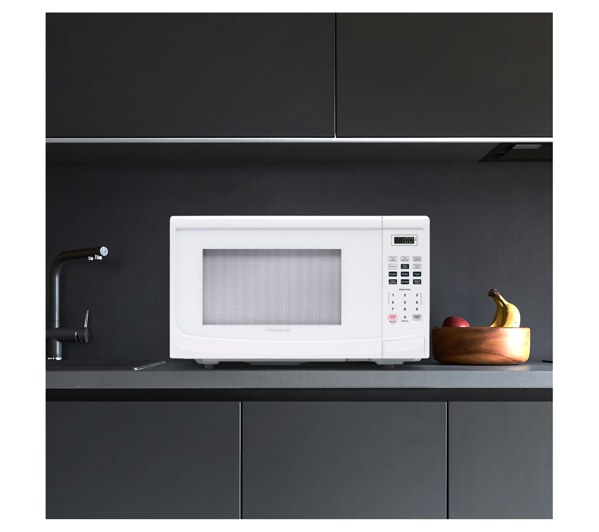 Perfect for pizza, baked potatoes, and popcorn for movie night, this convenient microwave features plenty of power, a rotating turntable, and preprogrammed functions to easily cook your favorite foods. From Farberware.