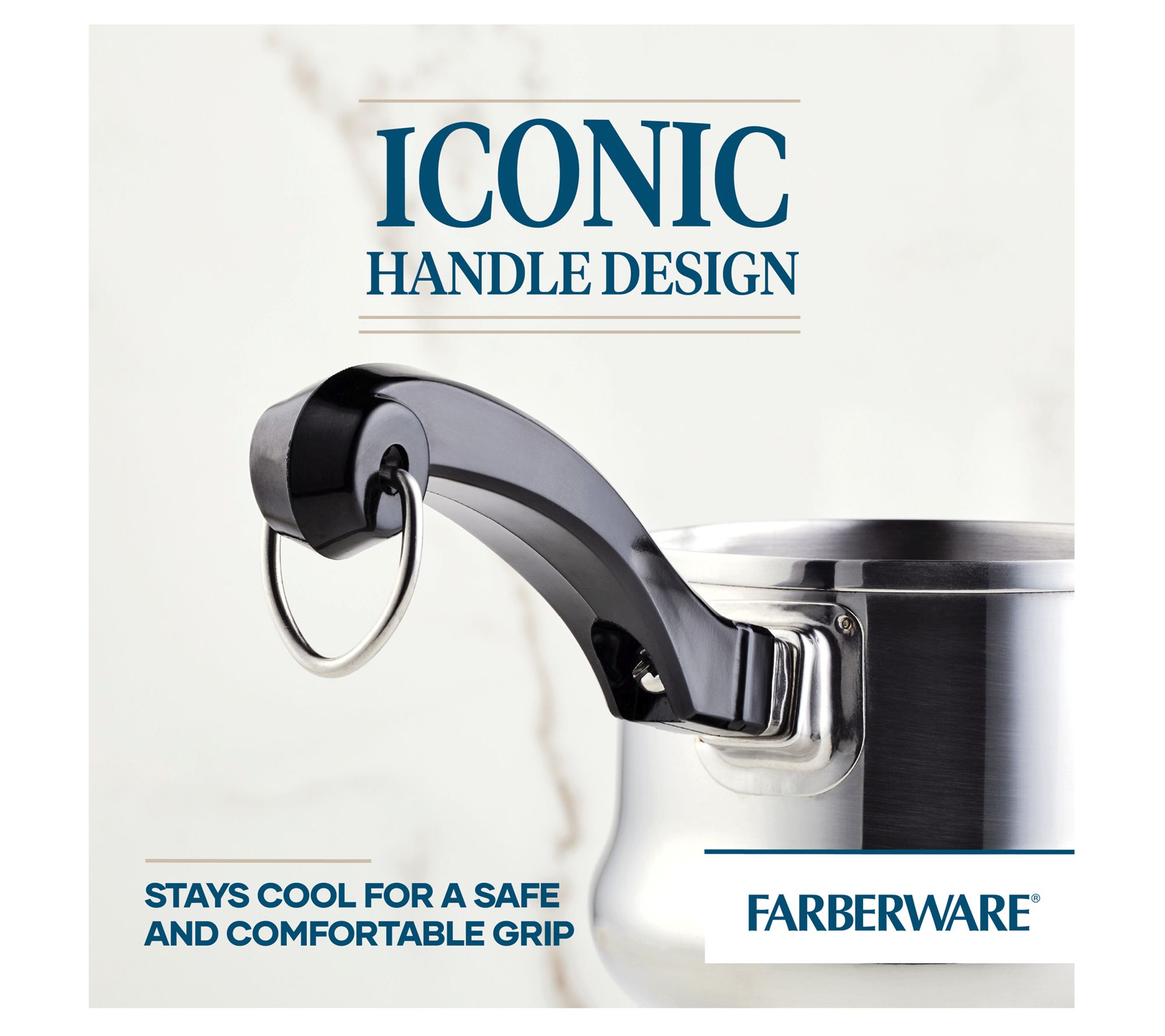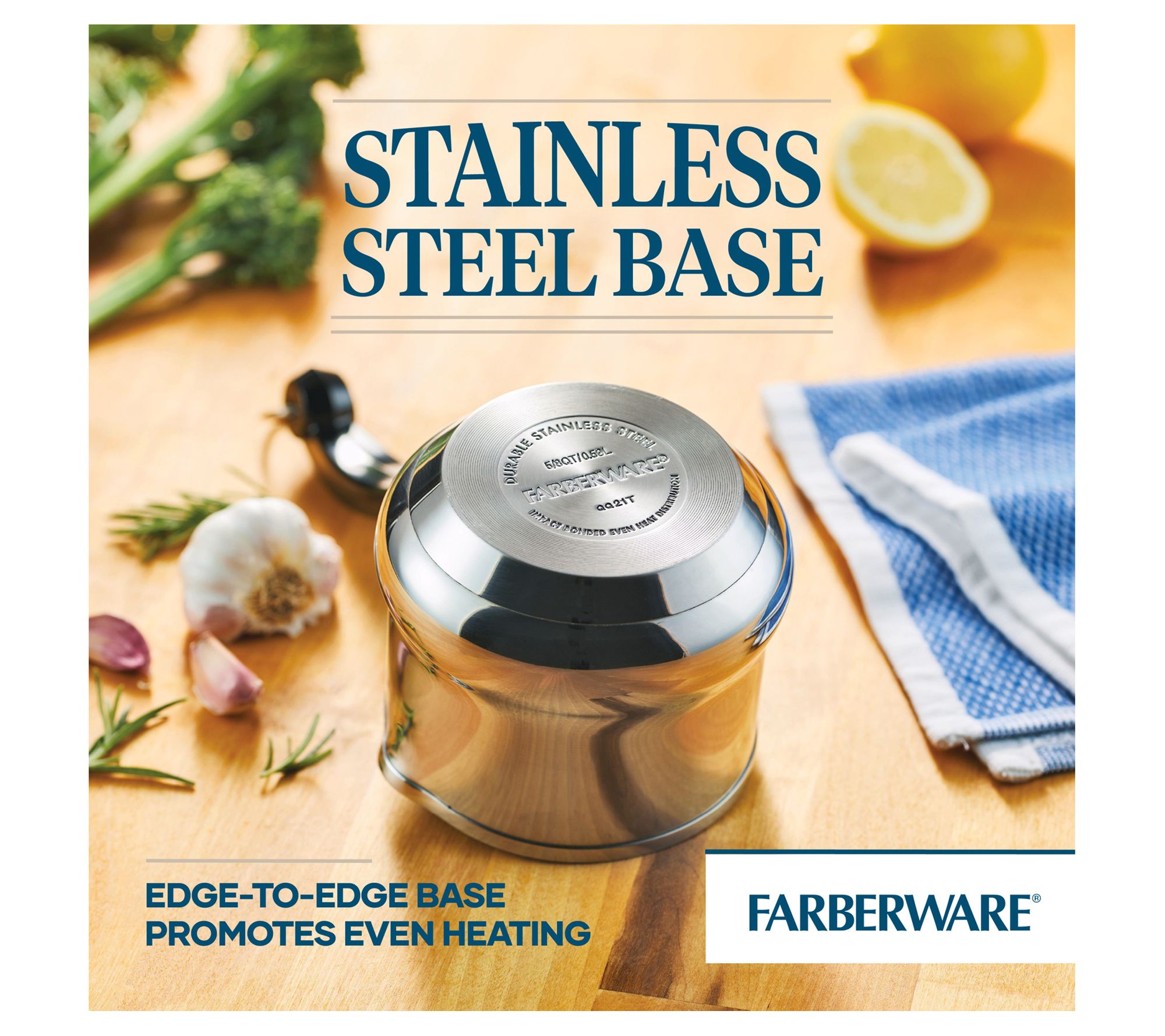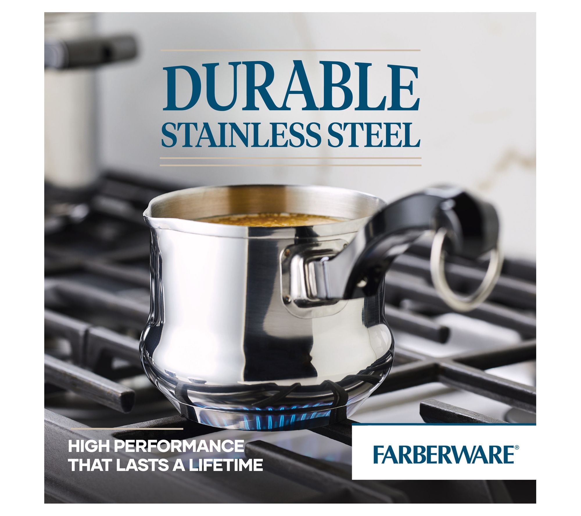 Perfect for melting butter, heating milk, or crafting creamy sauces, the Farberware Classic Series stainless steel warmer melting pot will be your new go-to kitchen tool. Featuring a spout designed for effortless pouring, this butter warmer packs the quality of larger cookware into a compact, 0.625-qt size. Dishwasher safe and oven safe to 350F, it complements your kitchen collection beautifully. From Farberware.