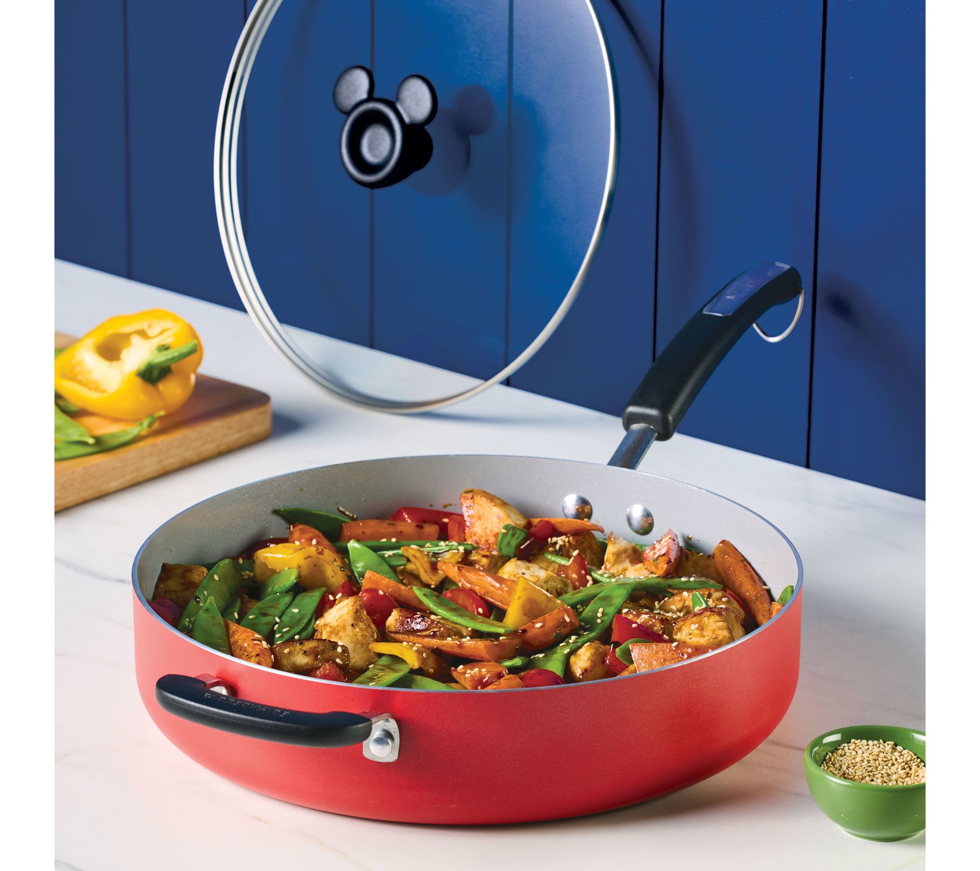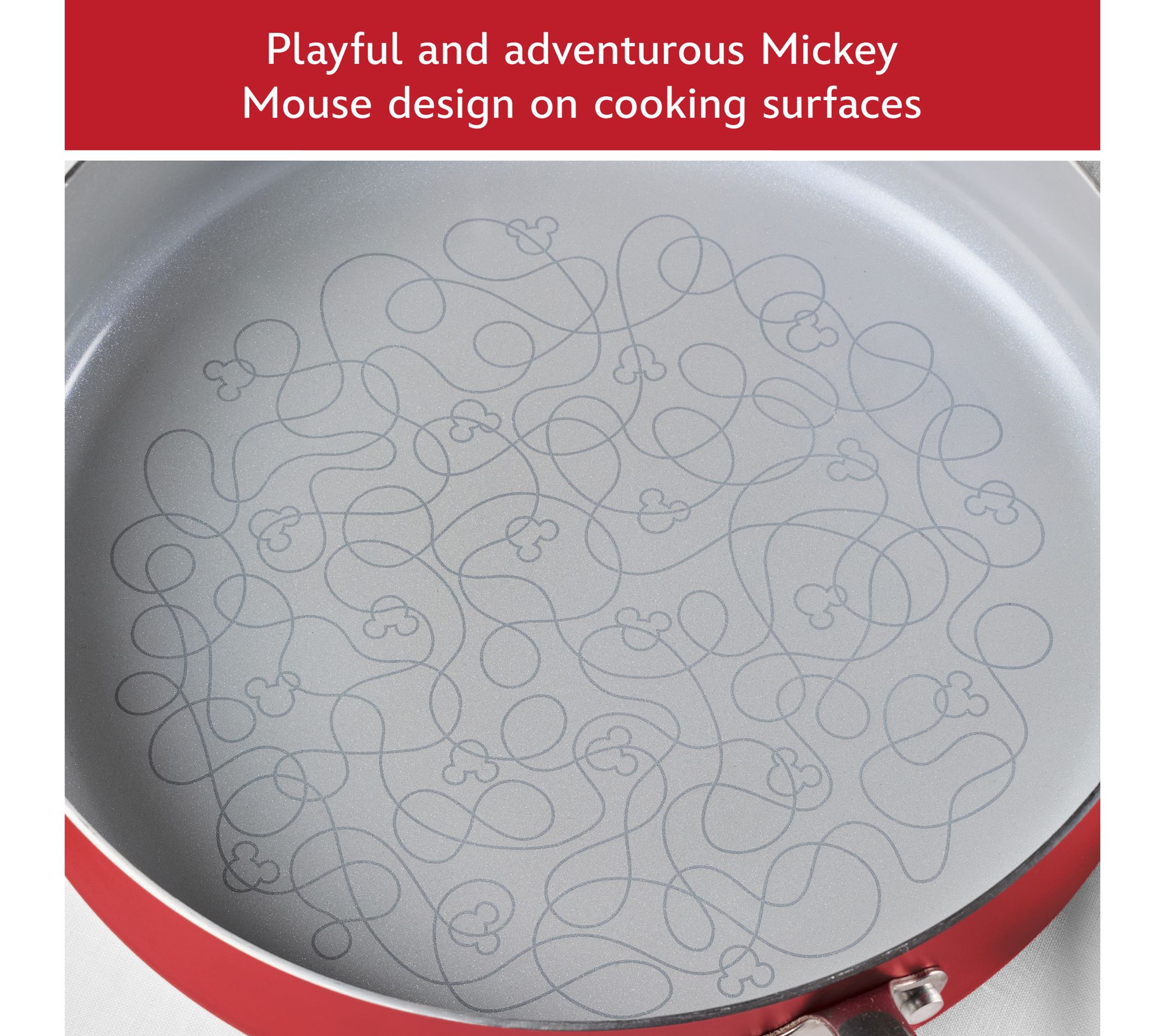 Bring a sense of adventure to your kitchen with the Disney Bon Voyage ceramic nonstick saute pan. Inspired by the nautical adventures of Mickey Mouse, this pan is perfect for cooking up family favorites like chicken stir-fry and seafood paella. The bold design, along with playful Mickey Mouse line art, adds a touch of vibrancy to your culinary creations. From Farberware.