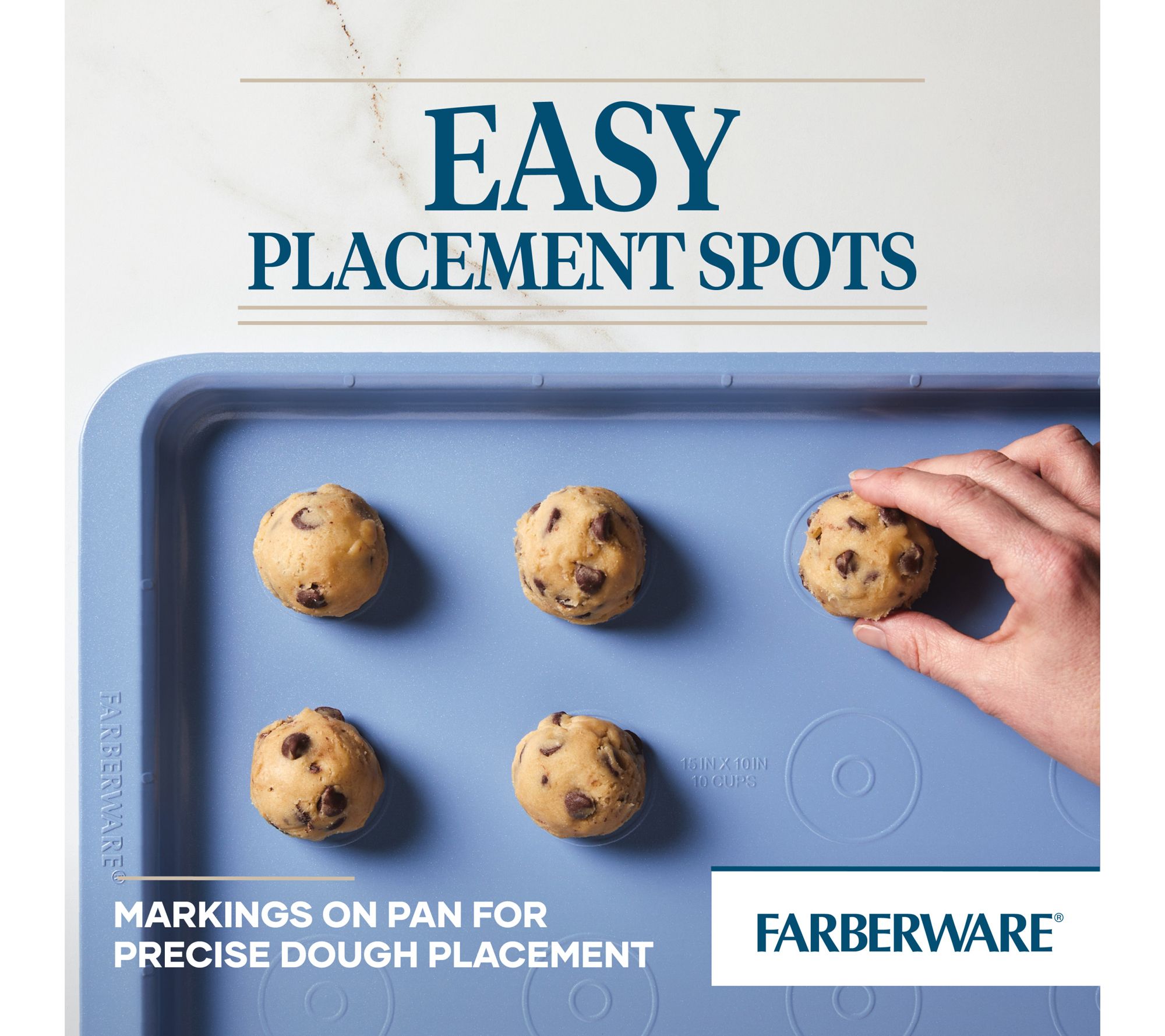 Make baking a breeze with the Farberware Easy Solutions Nonstick Bakeware Set. This four-piece set includes everything you need to whip up cookies, cakes, loaves, and more. With sturdy, heavy-duty steel construction and two layers of nonstick coating, you'll enjoy easy release and cleanup. Plus, unique features like cookie outlines and portion lines make baking precise and convenient. From Farberware.