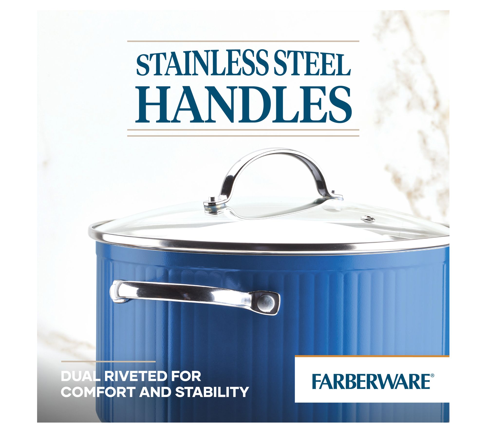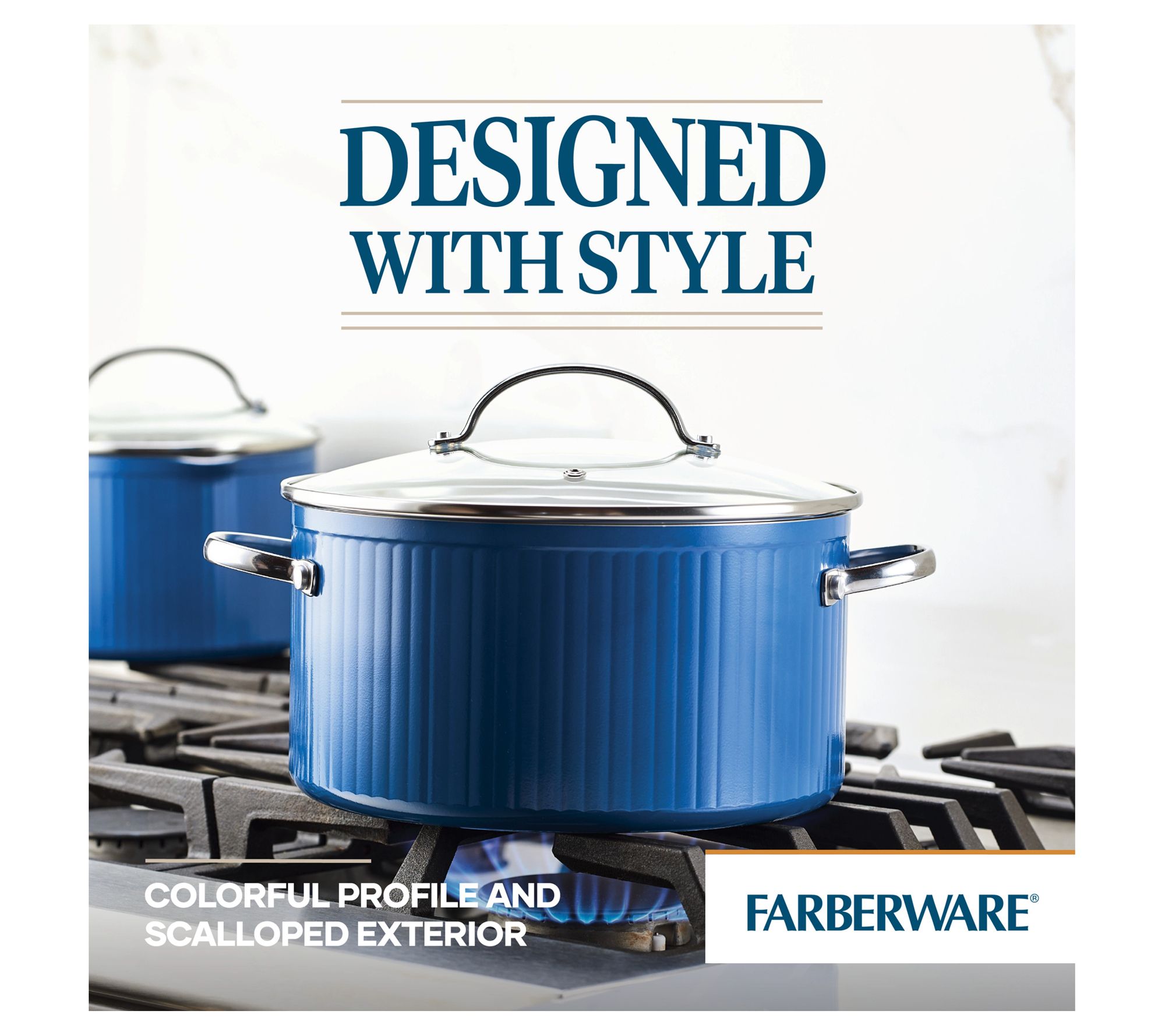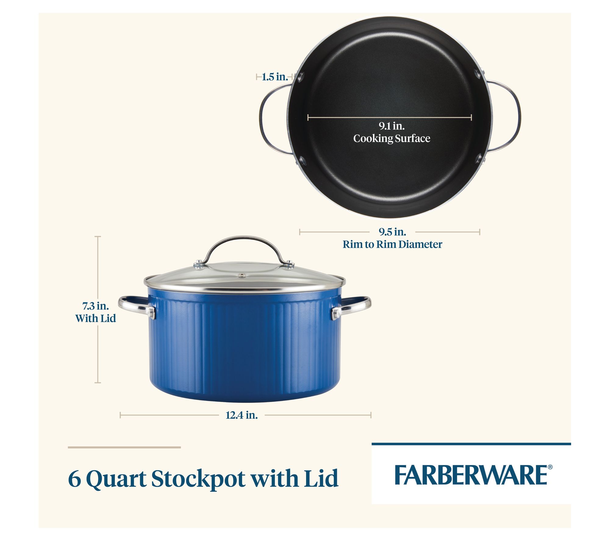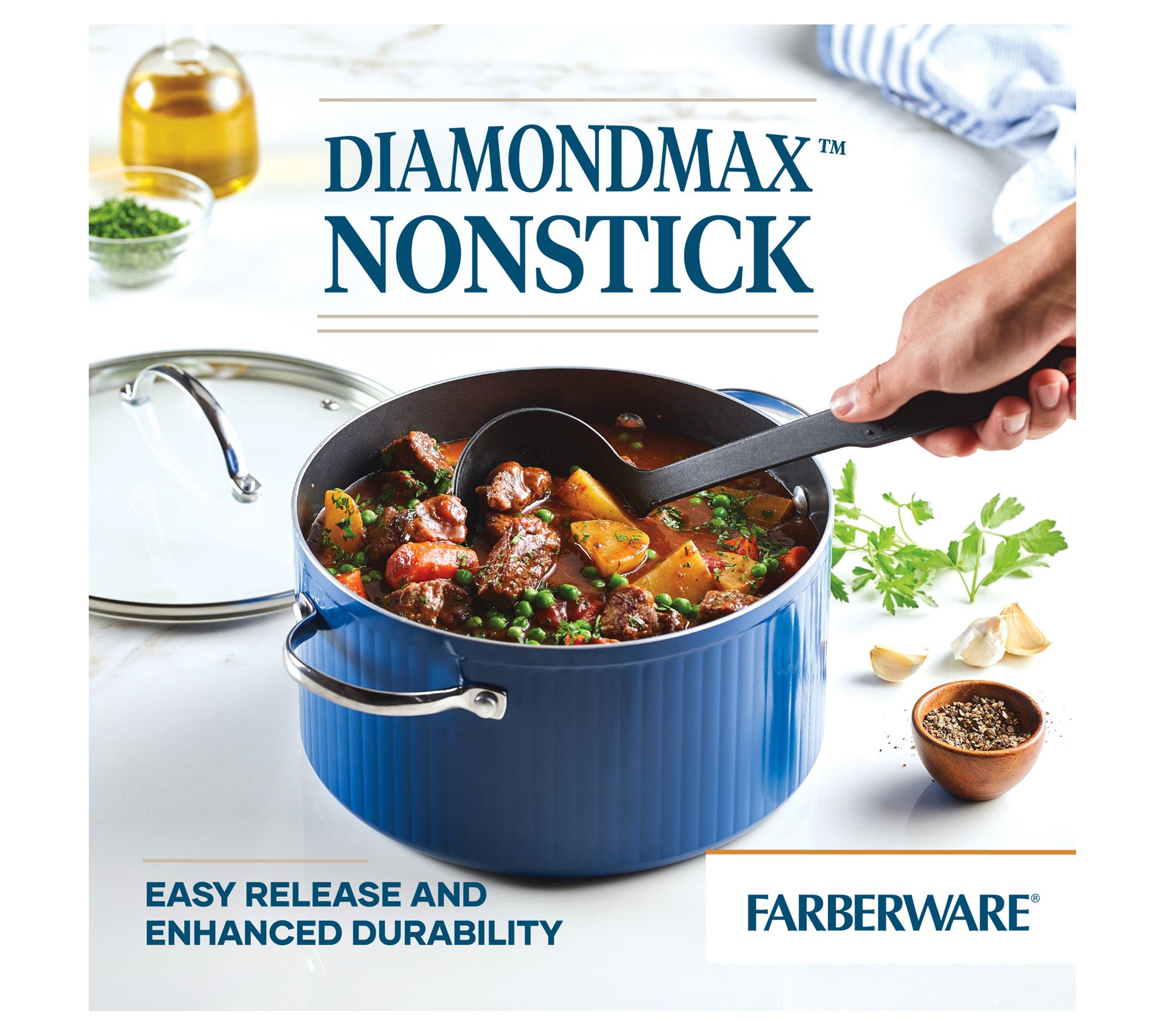 Elevate your cooking experience with the Farberware nonstick cookware stockpot. Perfect for everyday meals and weekend gatherings, this 6-quart stockpot features DiamondMax nonstick for easy release and cleanup. The fast-heating aluminum construction and tempered glass lid with a steam vent make it a versatile and stylish addition to your kitchen. From Farberware.