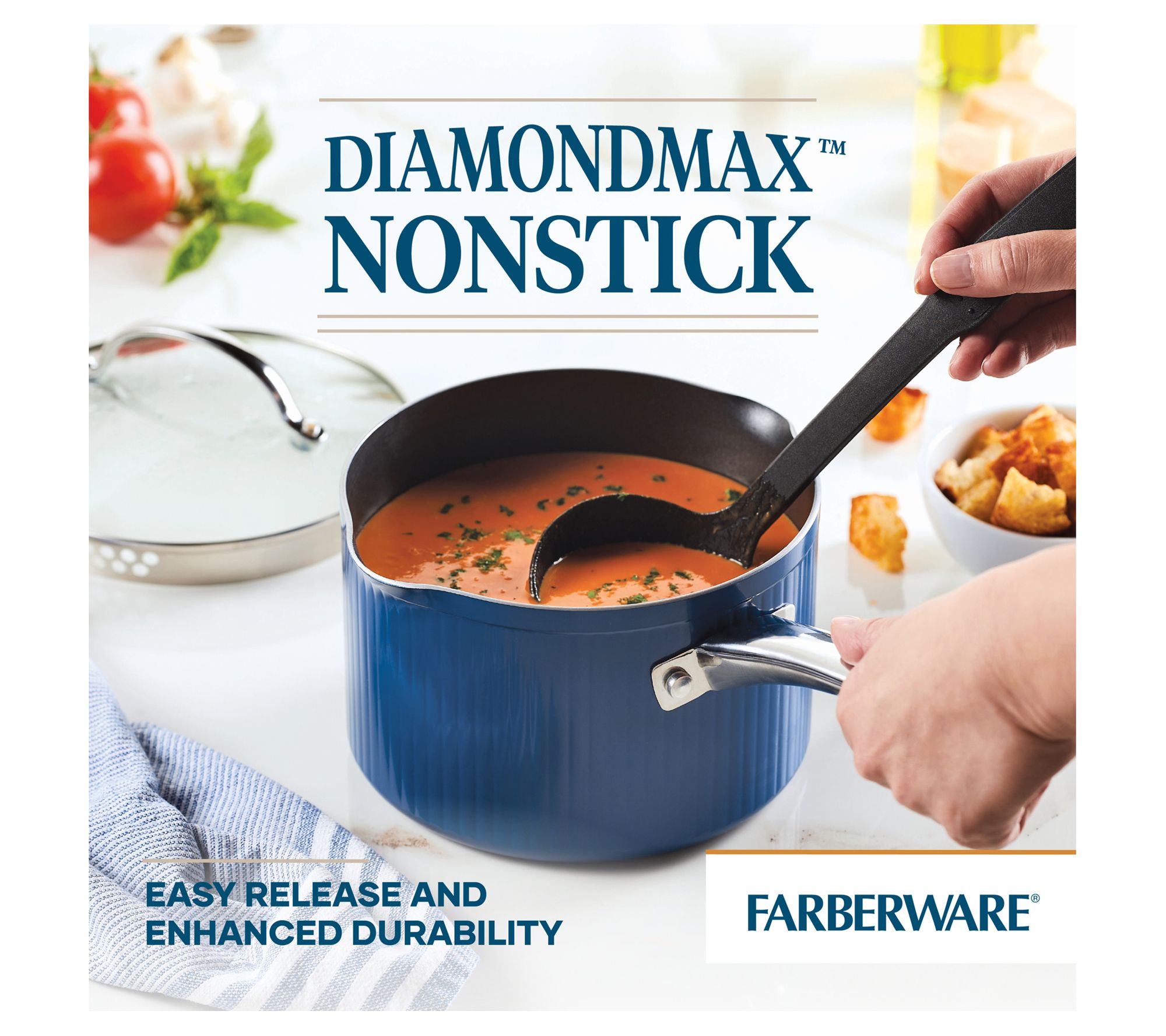Here's a modern, trustworthy straining saucepan from Farberware that marries performance and style. The Farberware nonstick cookware straining saucepan is perfect for everyday meals, weekend dinner parties, and everything in between. Its DiamondMax nonstick coating ensures easy release and convenient cleanup, while the tempered glass lid doubles as a straining colander. From Farberware.