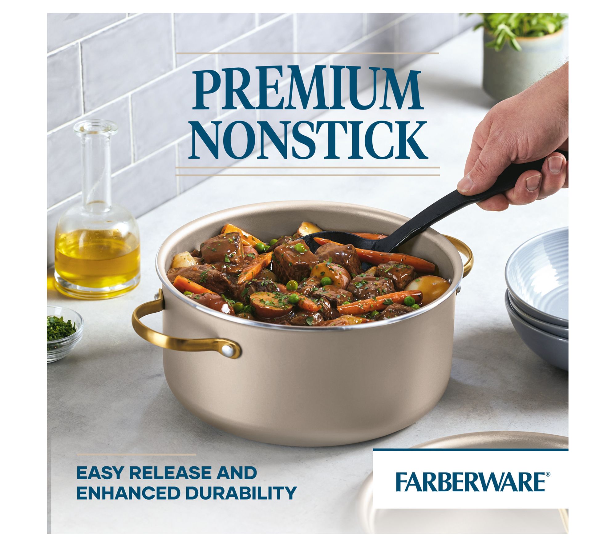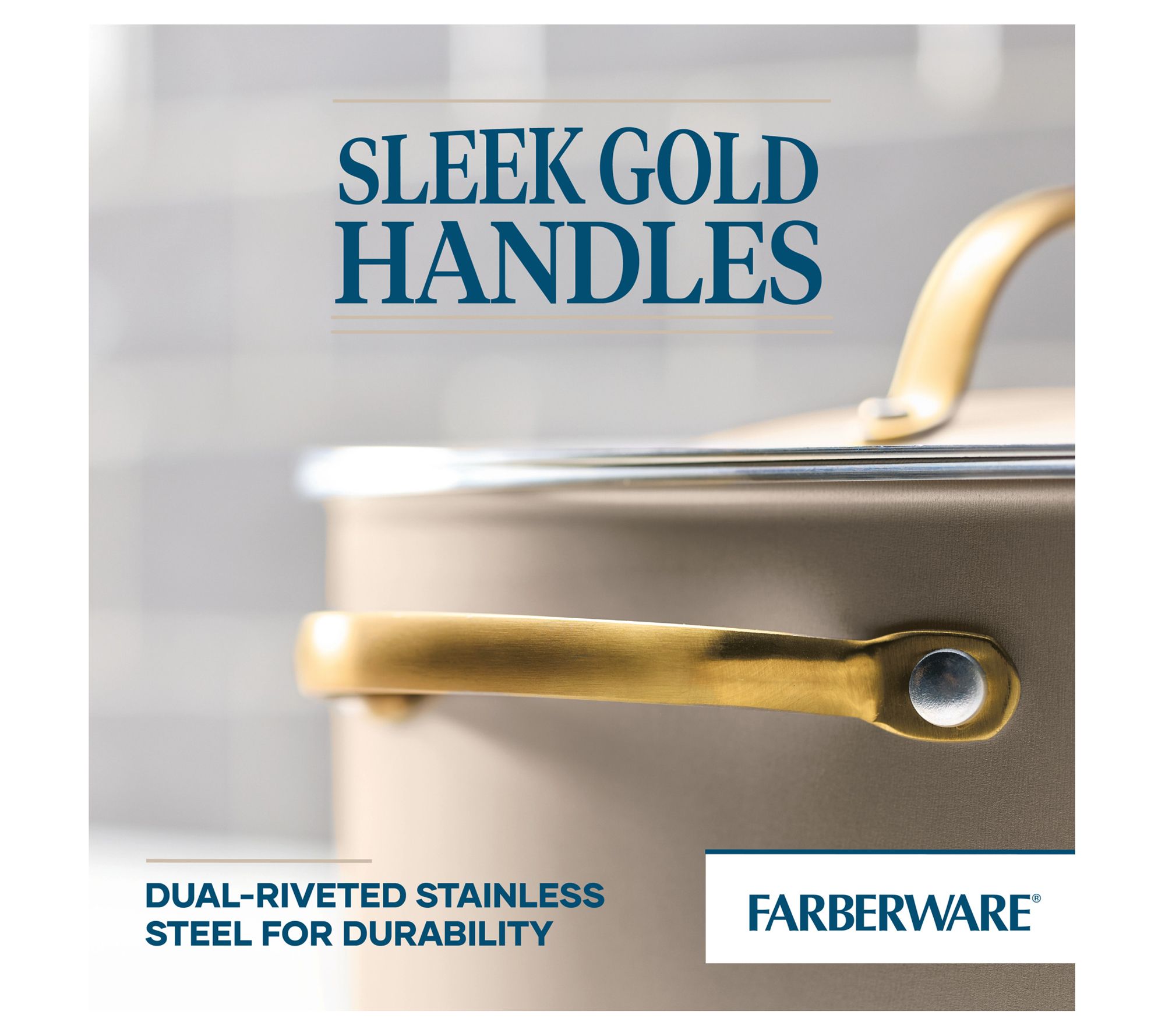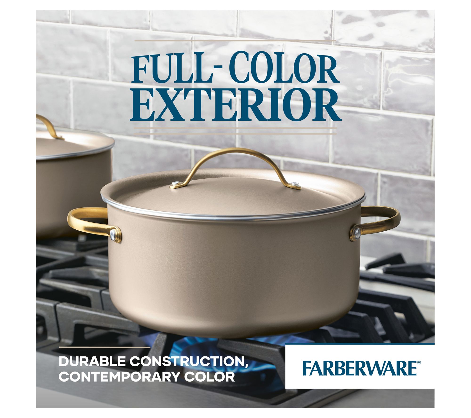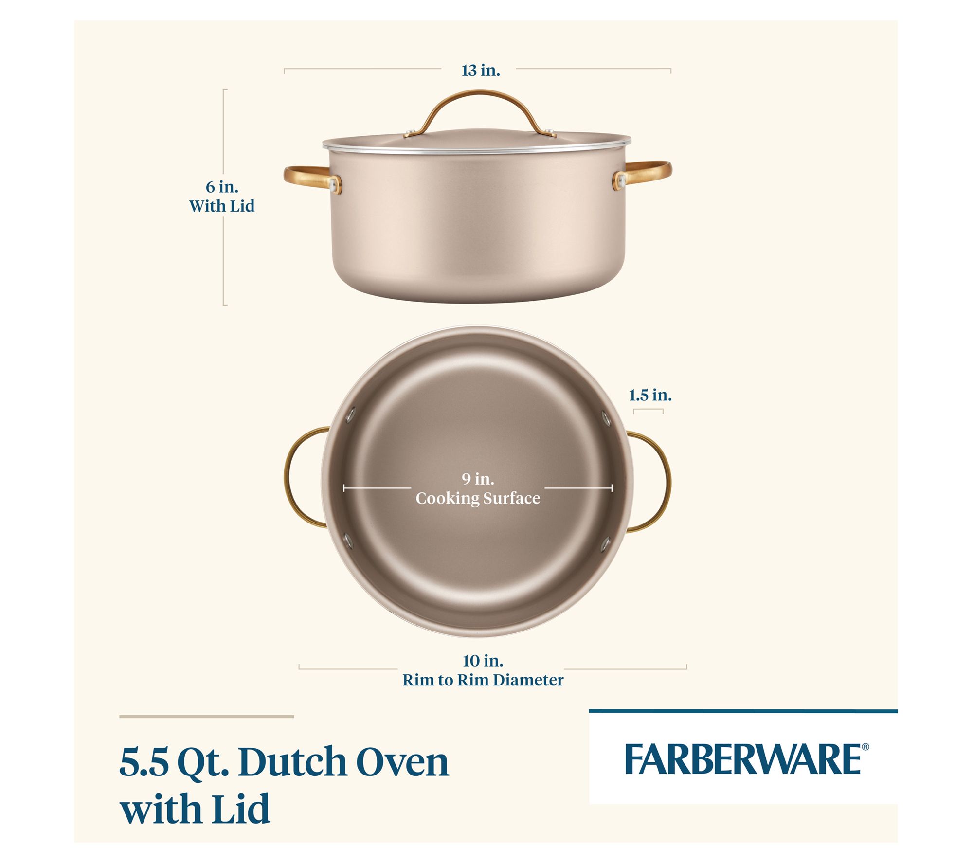 Elevate your kitchen with this Dutch oven, a perfect blend of style and functionality. It features a chic champagne-colored surface complemented by a color-matched lid and elegant gold stainless steel handles. Designed for everyday reliability, it boasts a durable nonstick interior for effortless food release and easy cleanup, aluminum construction for quick, even heating, and a flared rim for tidy pouring. From Farberware.