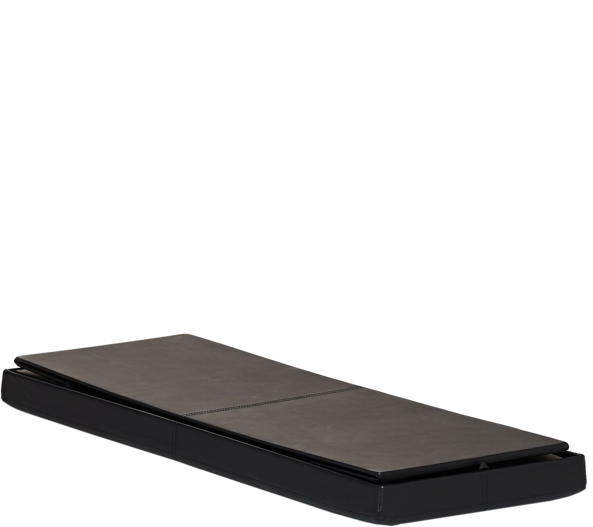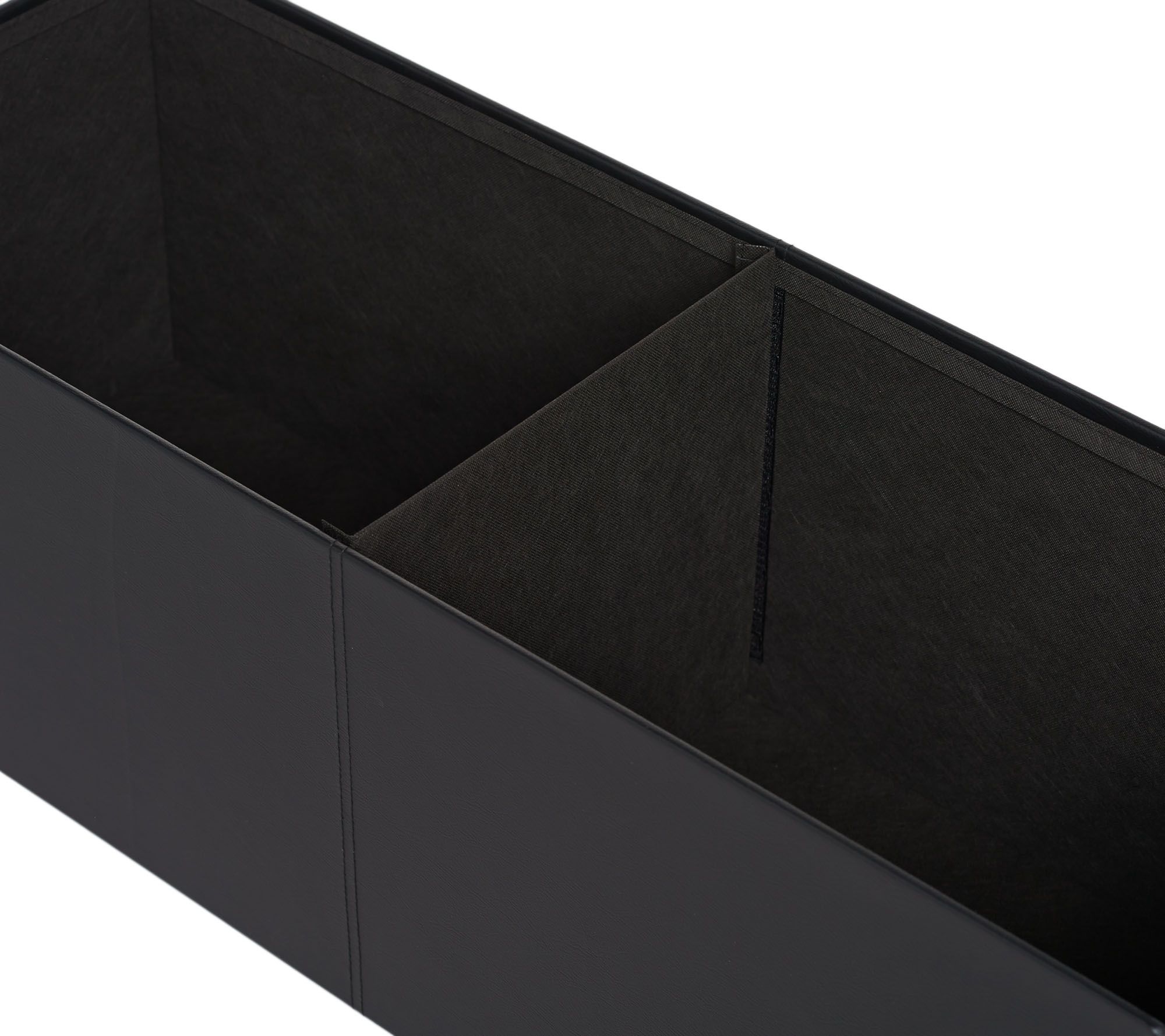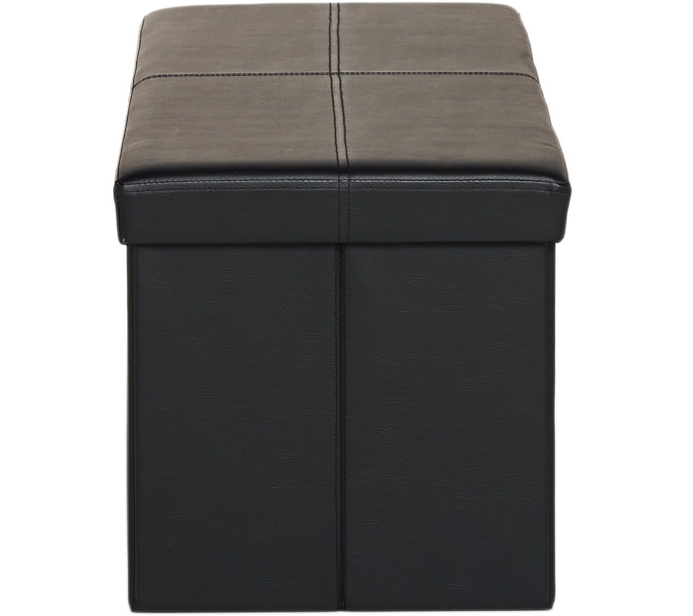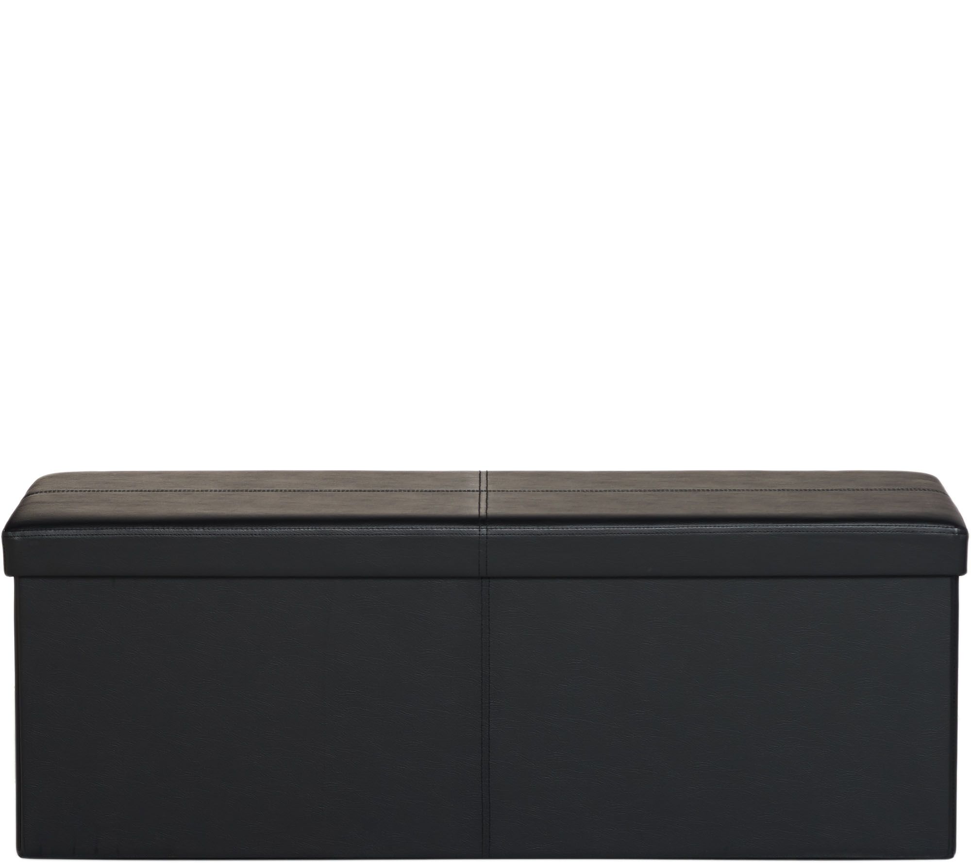 Sophisticated storage. With this stylish bench from FHE, there's more than meets the eye. Open up the comfortable cushioned top, and there's plenty of room to hide and organize blankets, toys, board games, books, and other small items that normally add clutter to your living area. The faux leather material creates an attractive accent--but when you need more space, the bench folds flat for simple storage! From FHE.