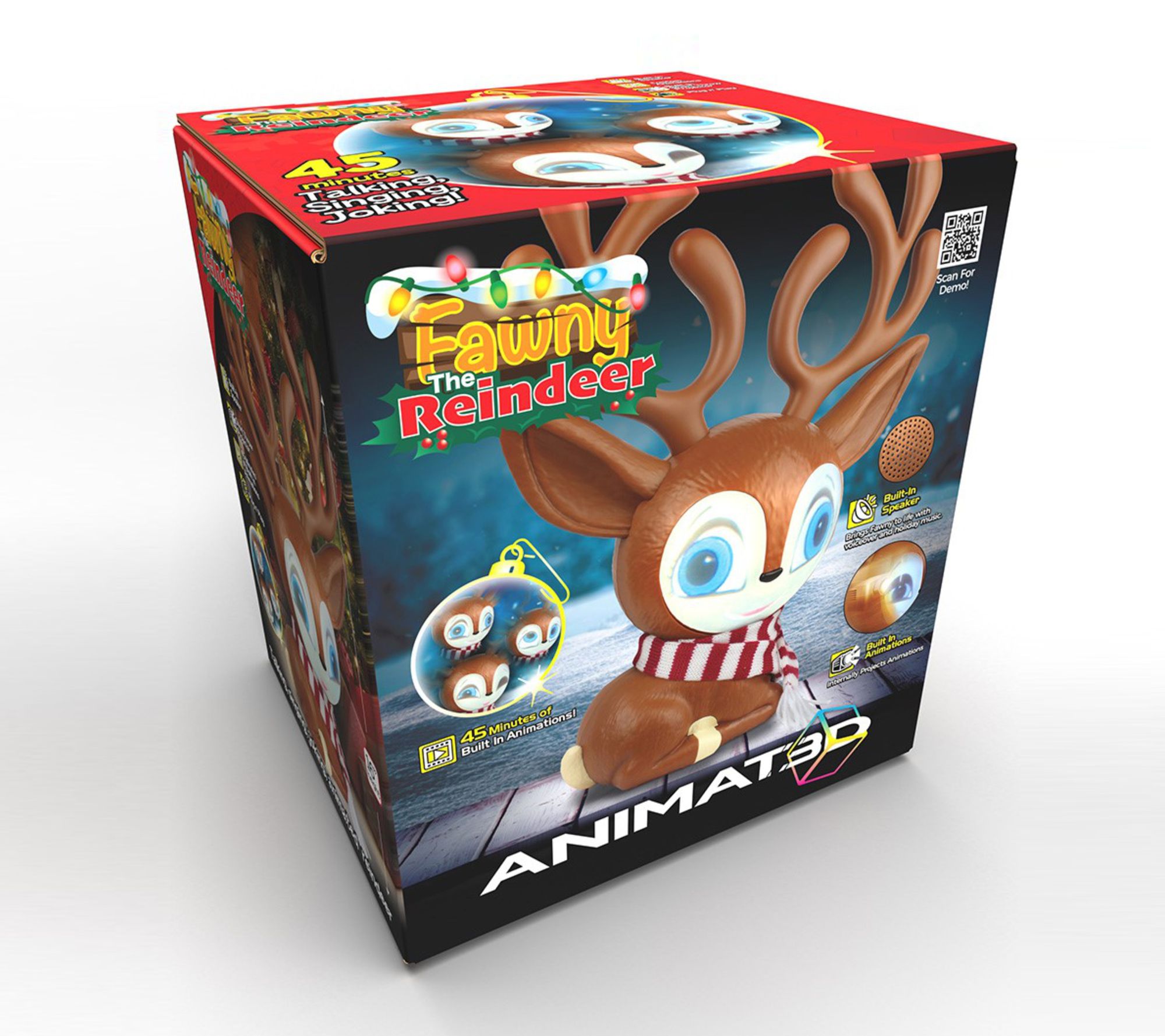 Delight friends and family as Fawny the animated talking reindeer entertains with cheerful songs, playful jokes, and lively conversation. This festive reindeer brings your holiday gatherings to life.