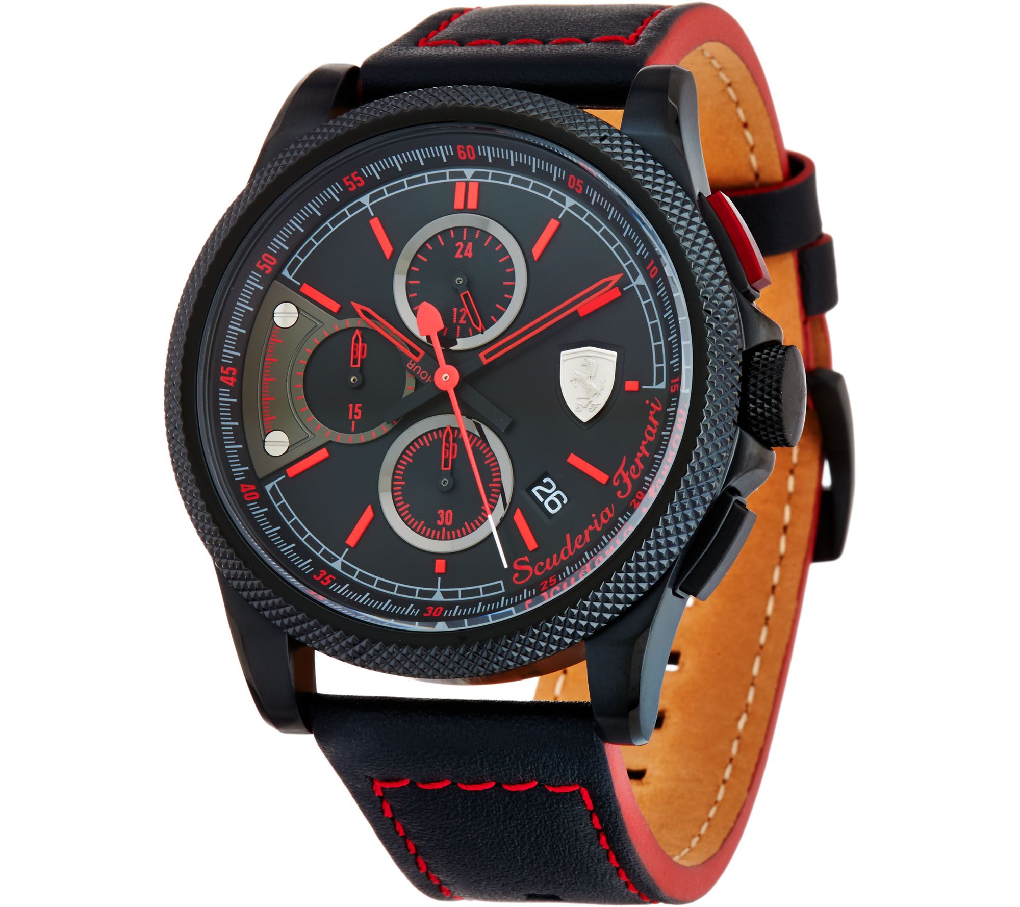 • Round black dial; date window between 4 and 5; Ferrari logo at 3; bar marks at remaining hours; hour, minute, and second subdials; hour, minute, and second hands; chronograph