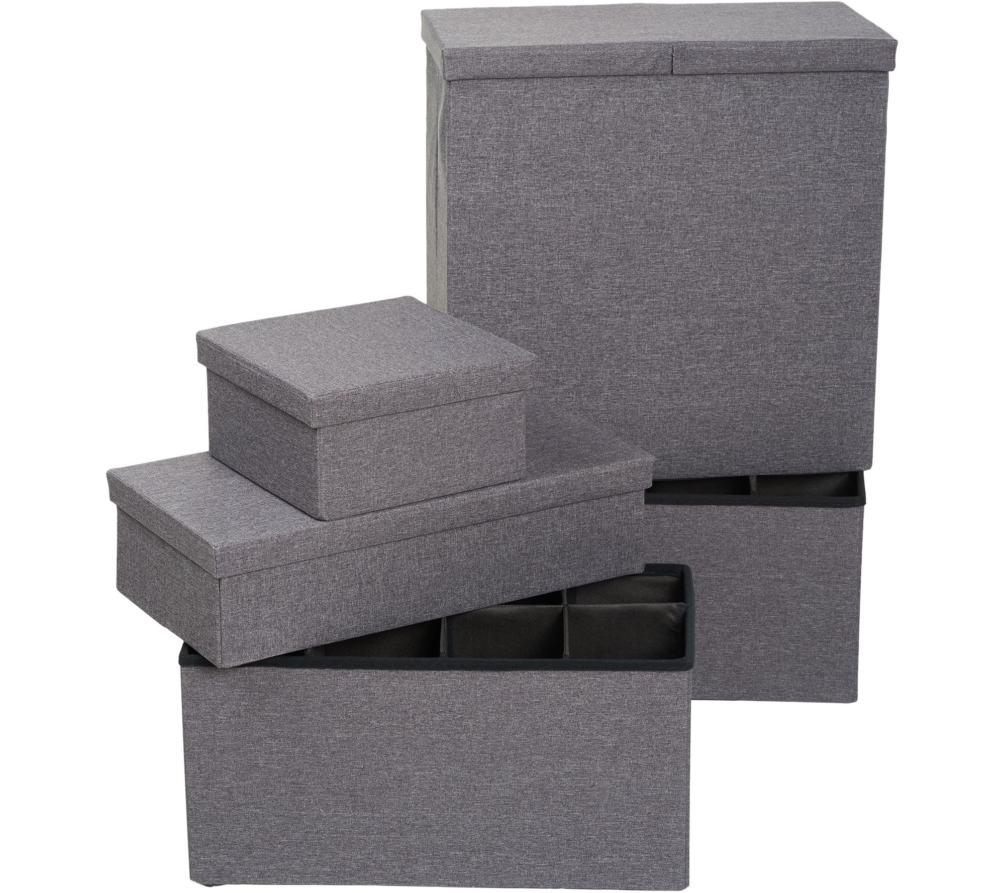 • Includes stacking storage with dividers, sorting double hamper, small storage box with lid, and two large storage boxes with lids