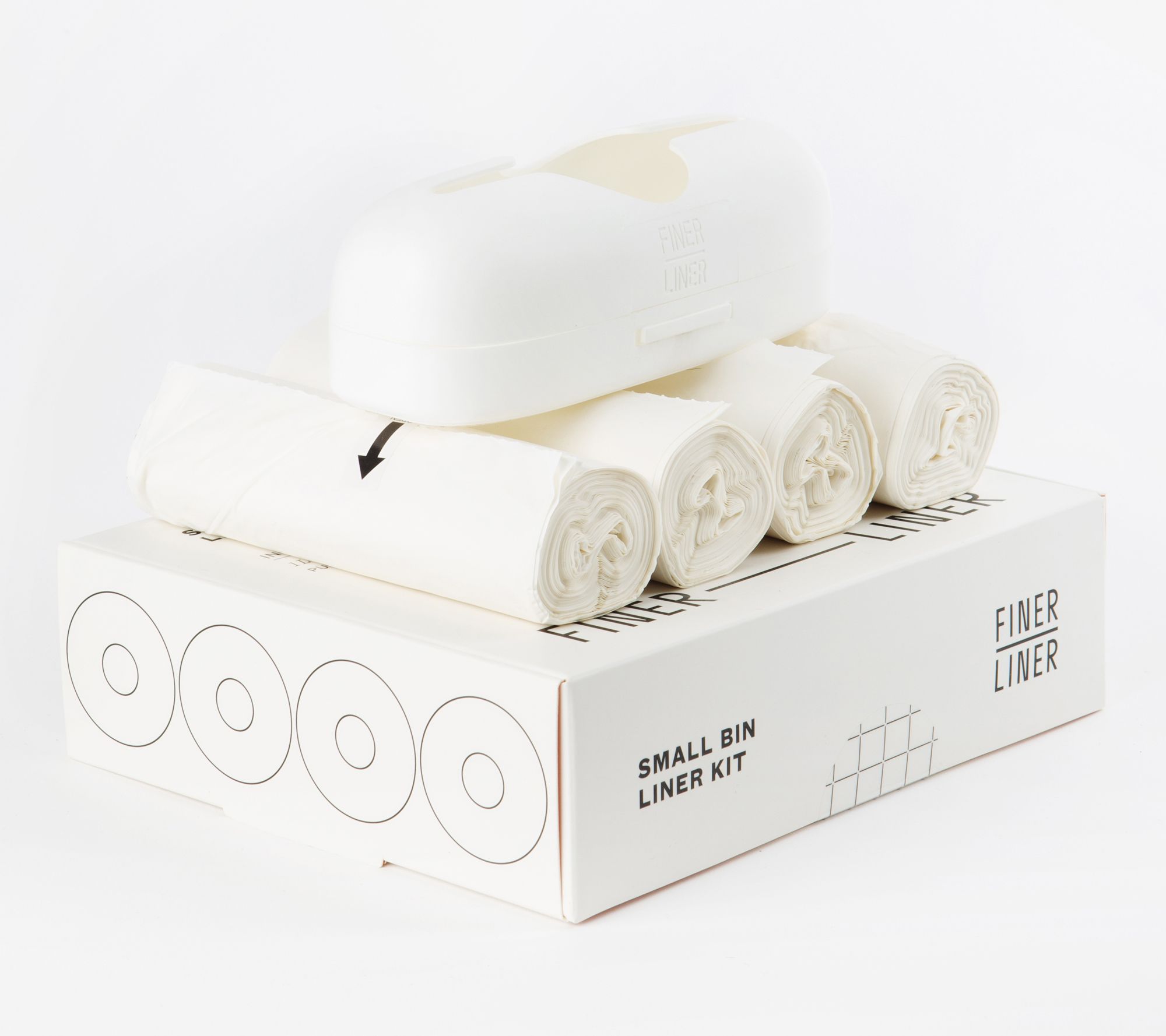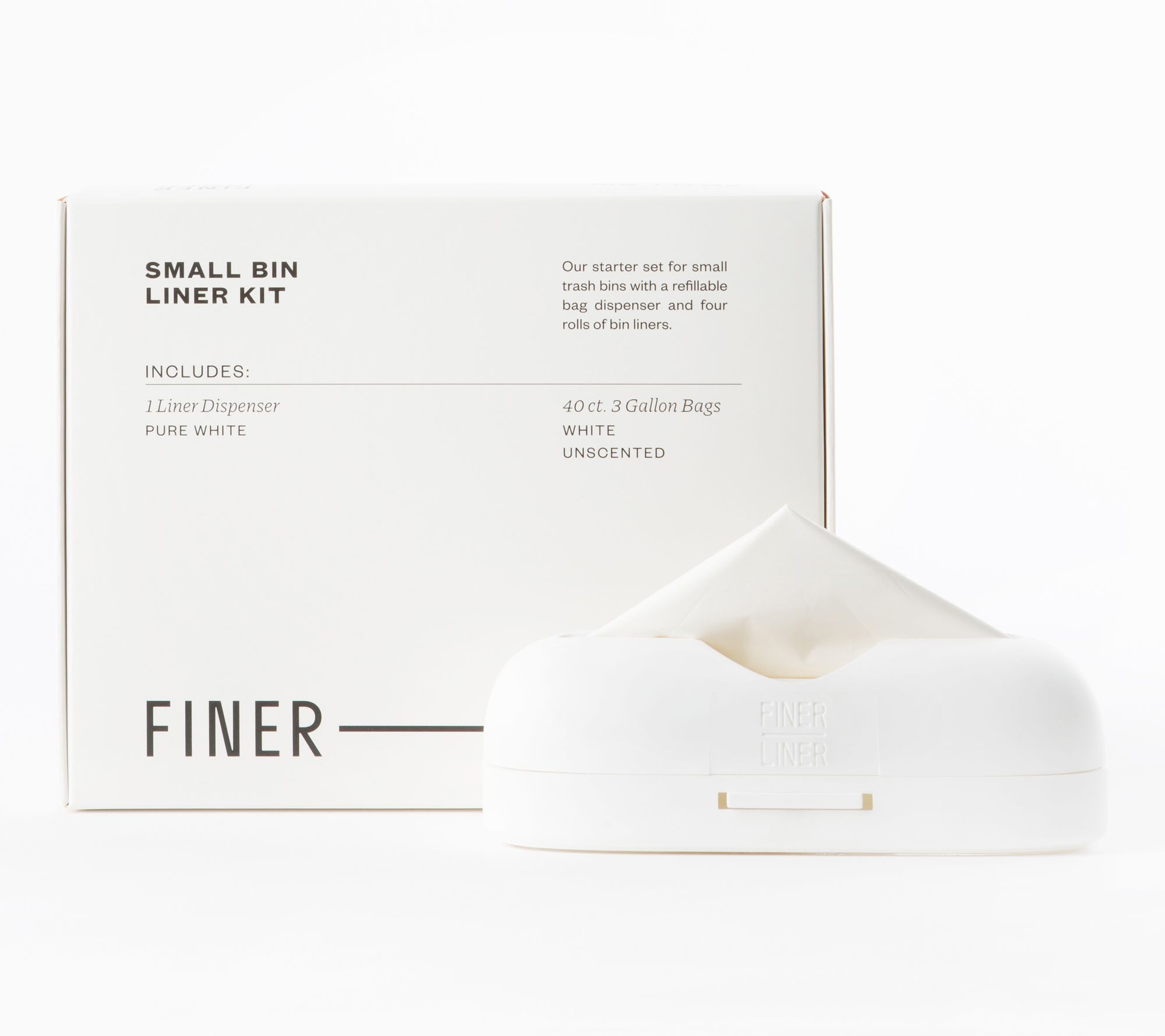 Simplify your system for replacing trash bags with this set of two small bin liner kits. Each kit contains one dispenser and 40 unscented liners for quick and easy refilling. Get started by attaching a dispenser to the base of your trash bin. Then, pull up the first liner, use, and repeat! From Finer Liner.